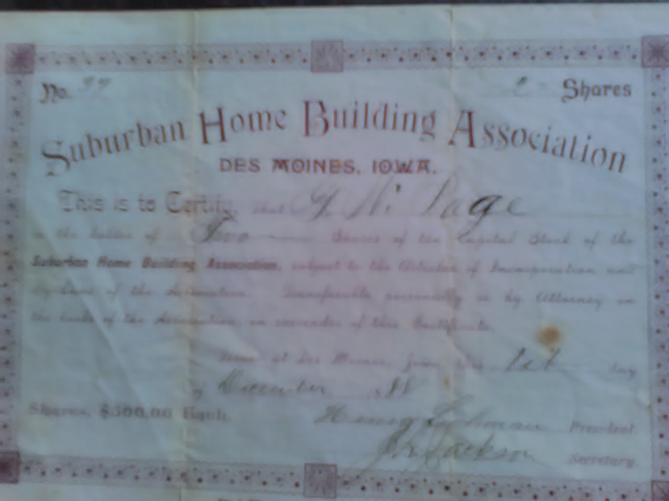1888 stock certificate for GW page issued BY Henry Lehman president for 2 shares of capital stock valued at 500$ each, in the suburban home building Association of Des Moines Iowa. It's #37 an original