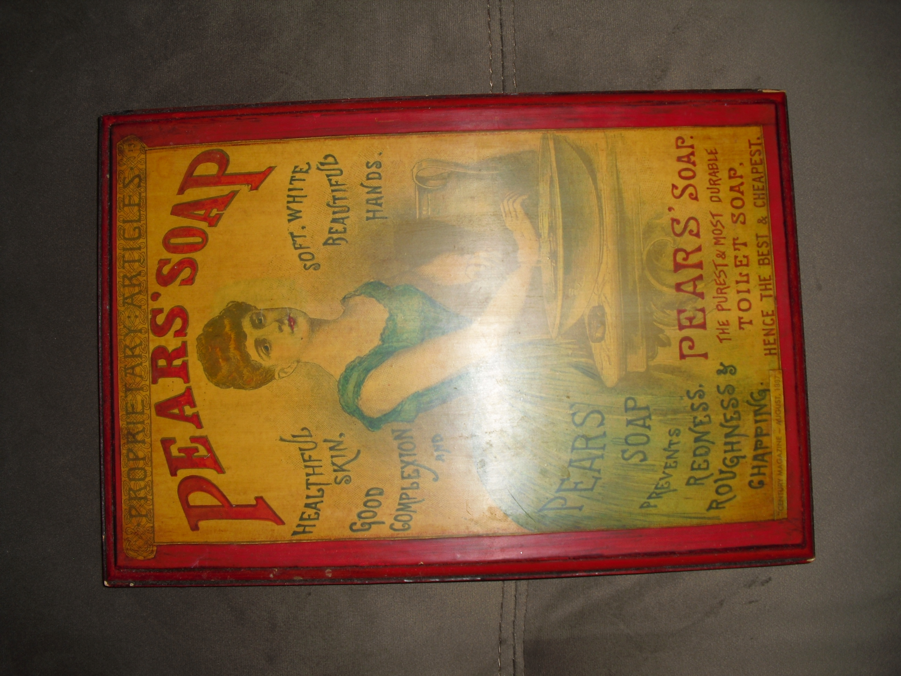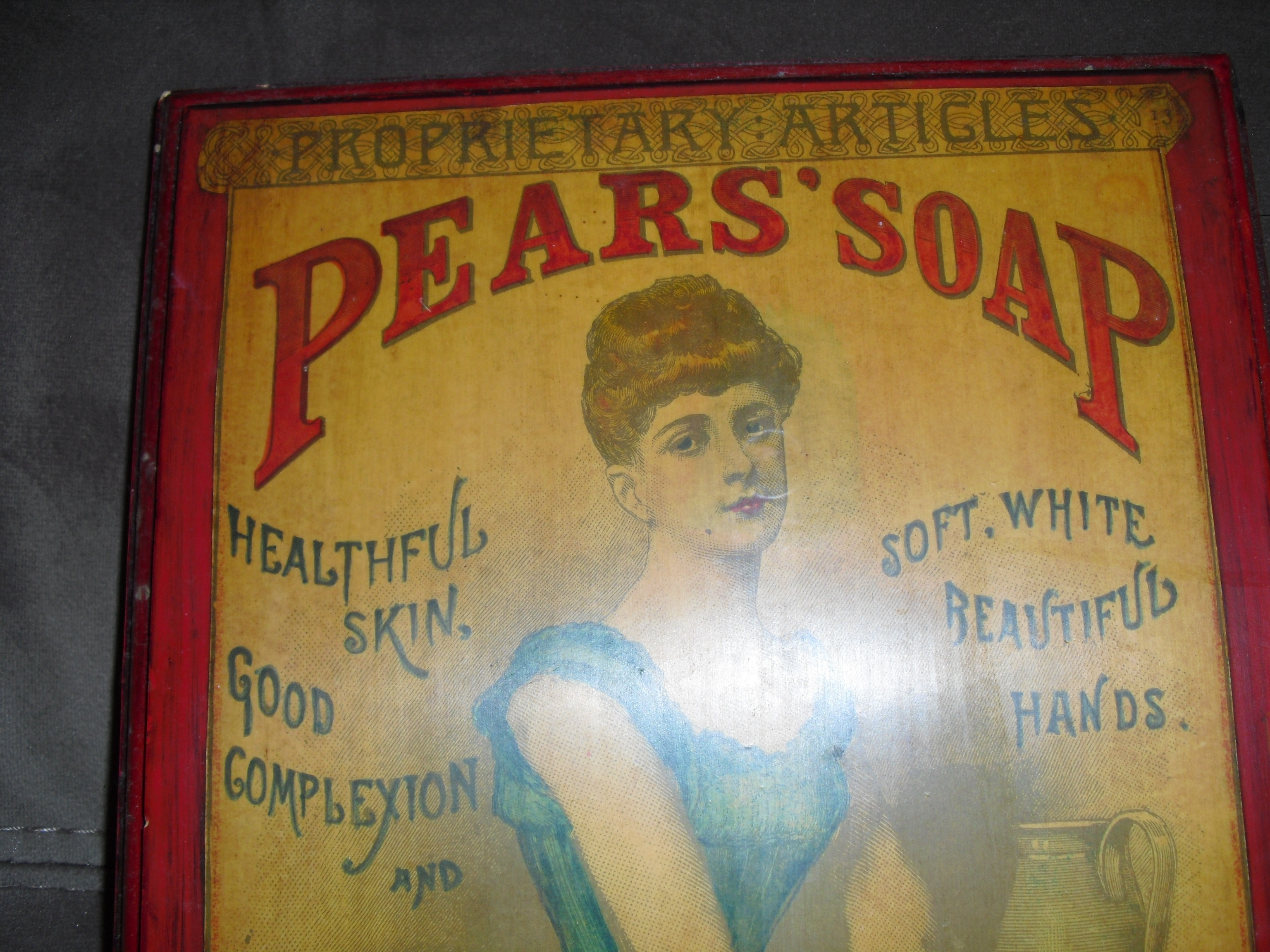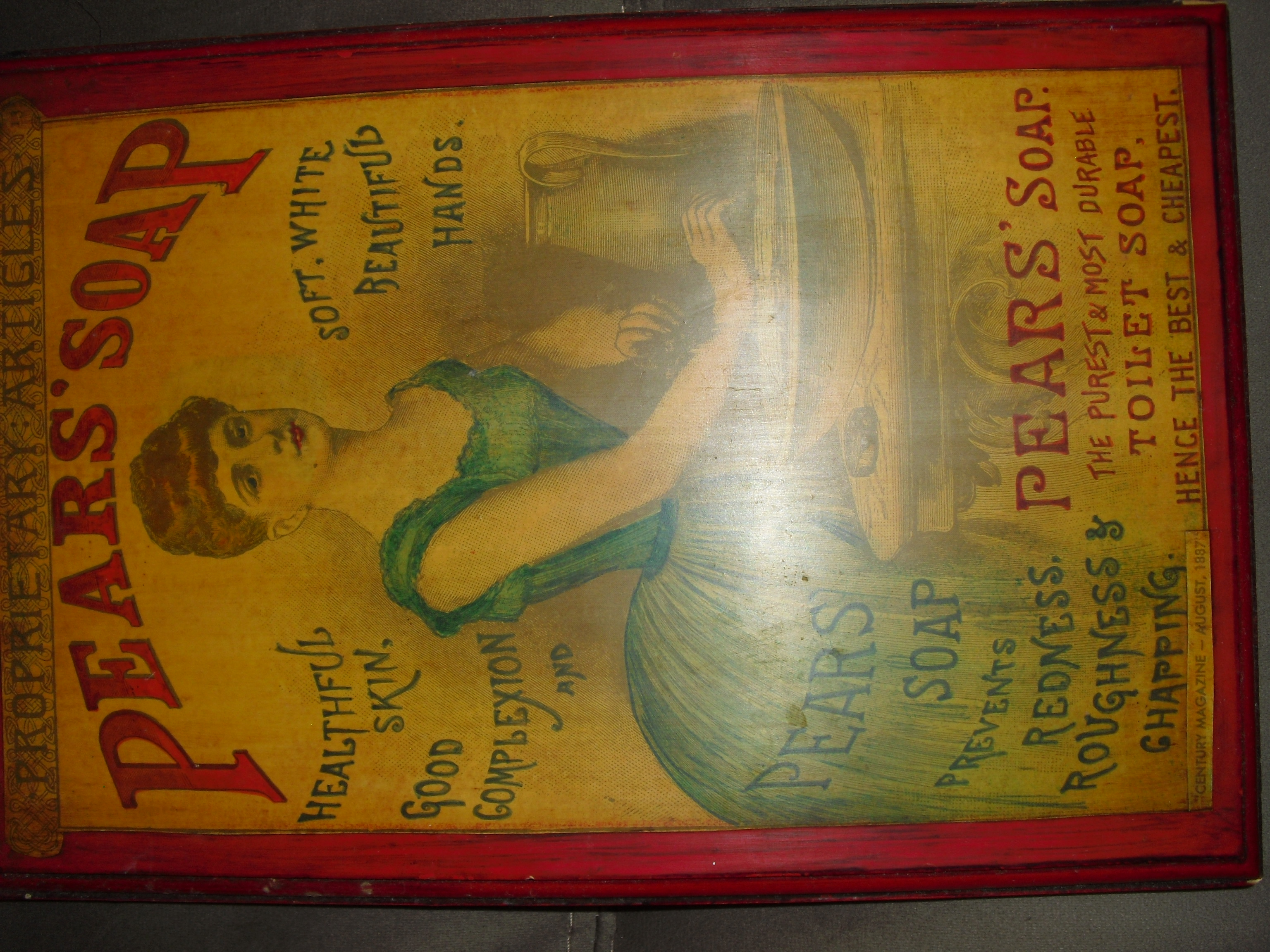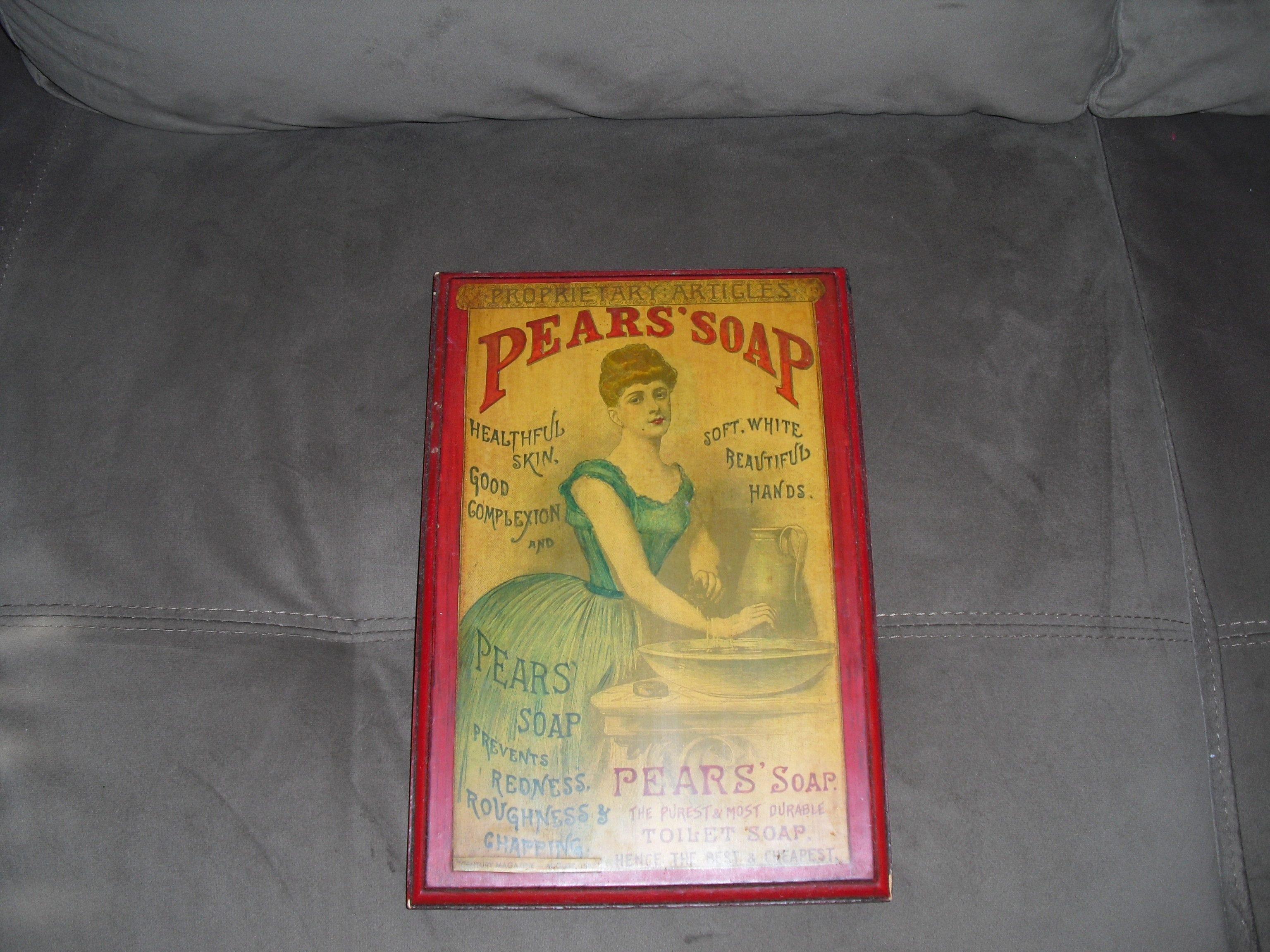 A 1887 Pears Soap magazine ad that has been colored and place on a wooden frame.
