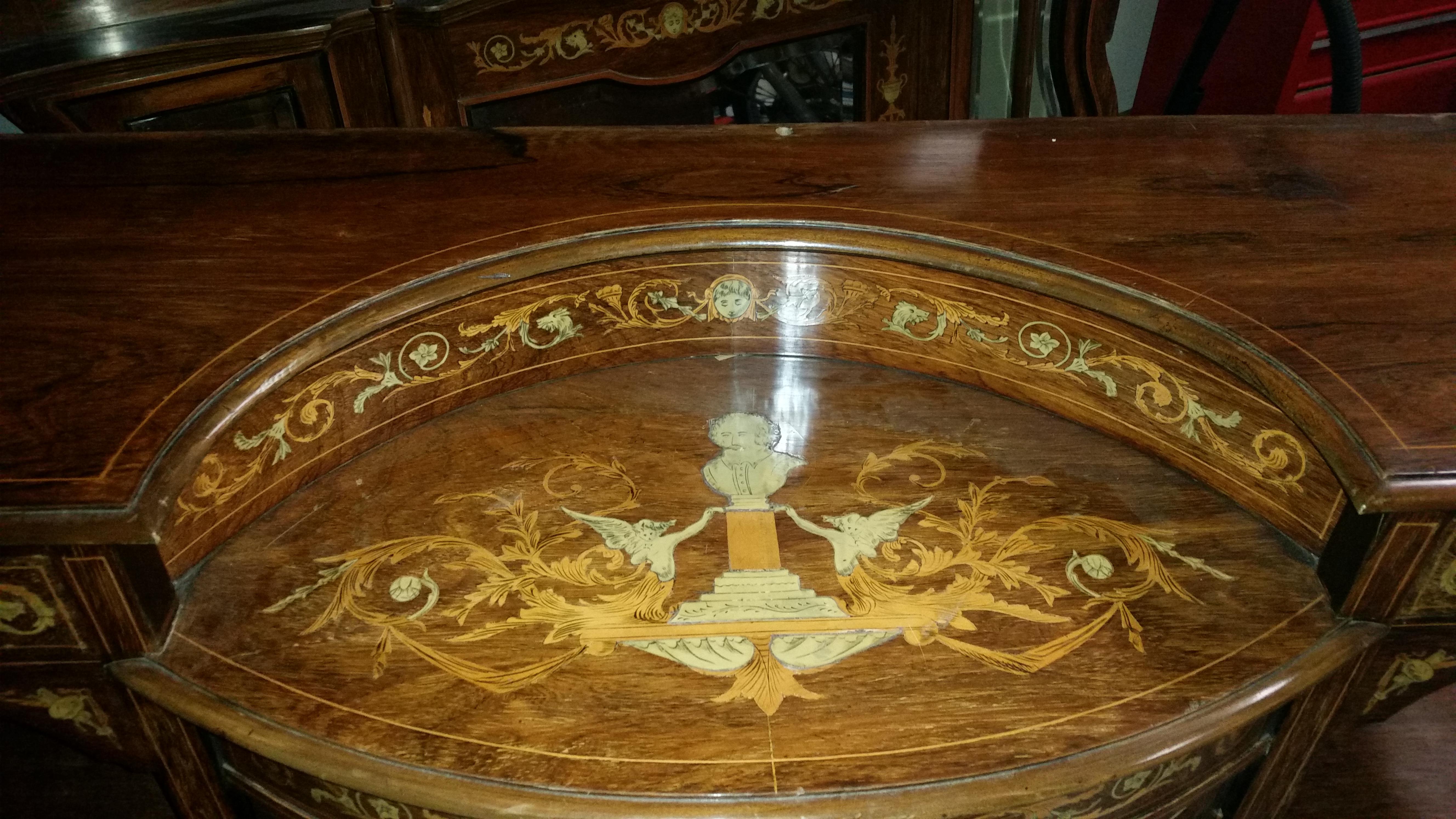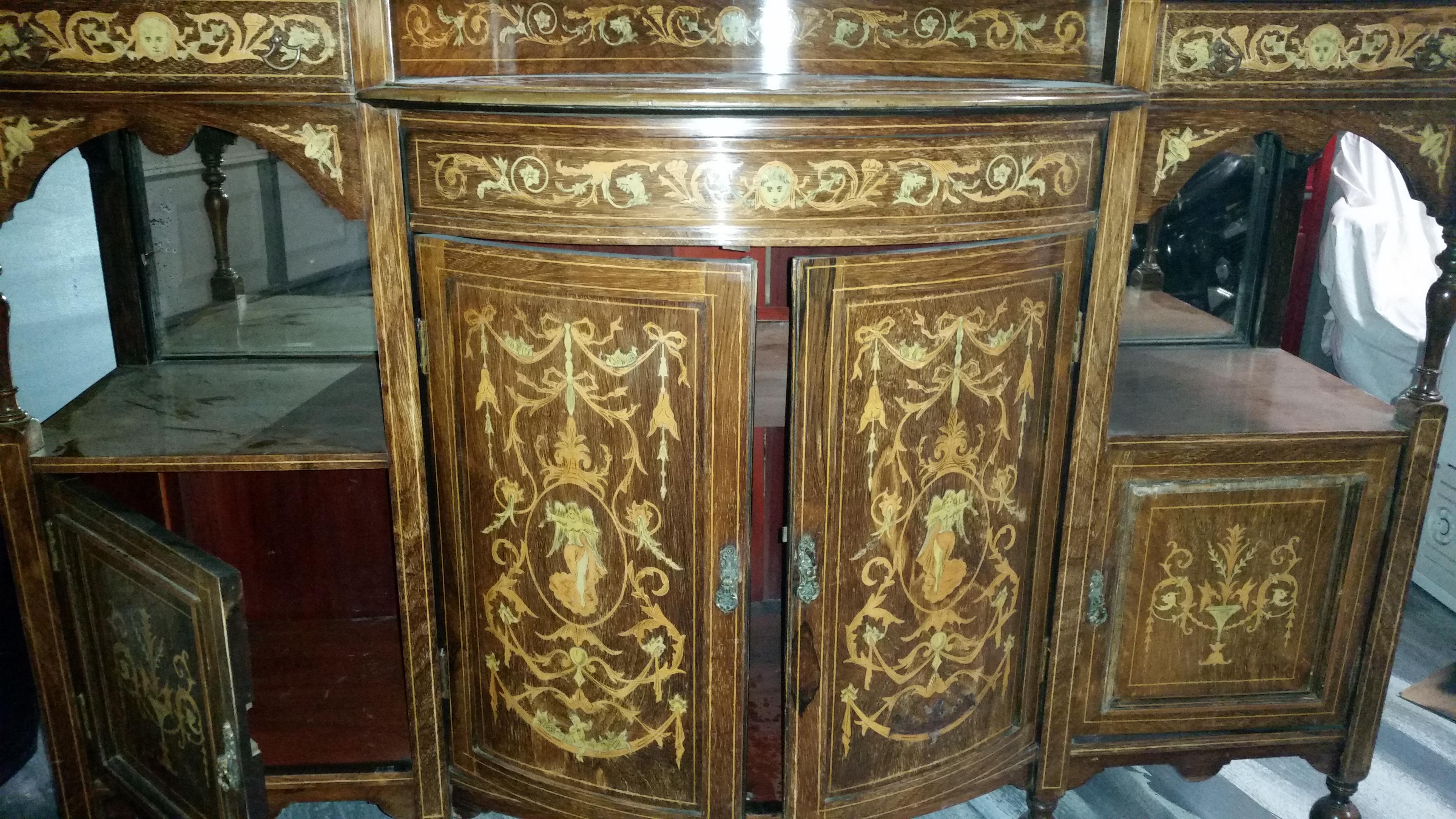 2 piece mirrored with inlay of fruit , angels , head bust of?, dragon heads and faces of angels. Some of the inlay is a different colored wood and the other is a very thin material i think is supposed to be ivory or pearl but might be plastic. There isnt any kind of stamps or marks that i can see. Any information on this piece sure is appreciated. Thank you in advance for taking the time to read my listing. Sincerly Rebecca Ann