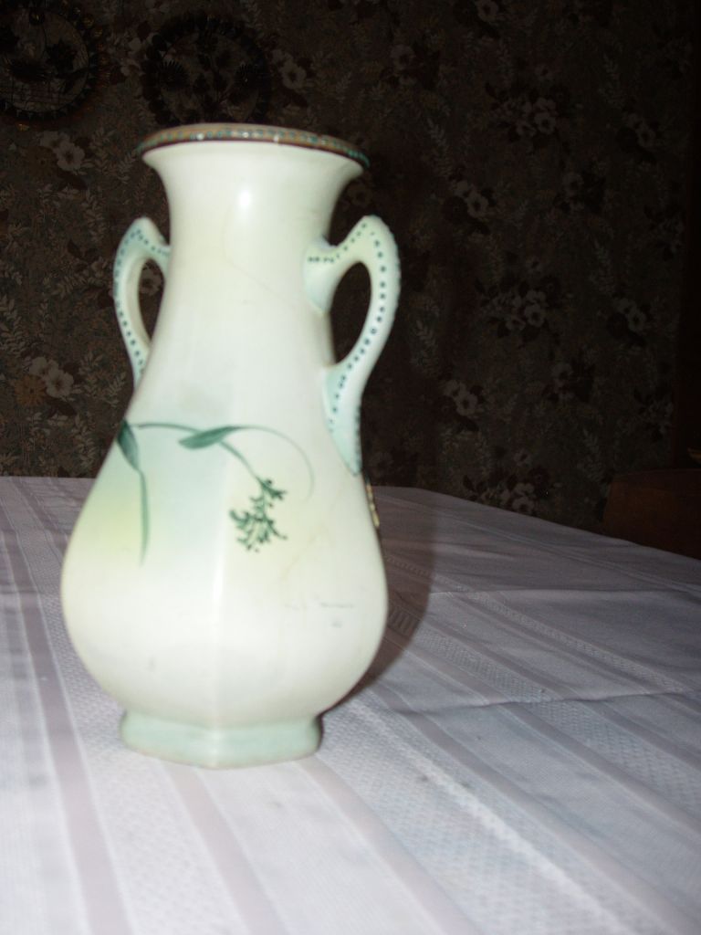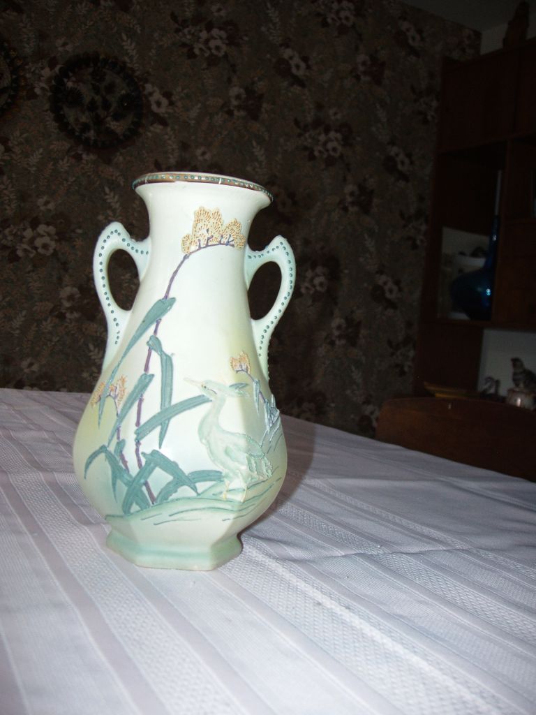 A hand painted porcelain vase.  Light pale green color, with a tall bird standing among tall plants with flowers.  Has minor chip at mouth of vase-see photo.  Was appraised in 1992,  appraisel unknown-records missing. I am interested in selling, but not at this time.