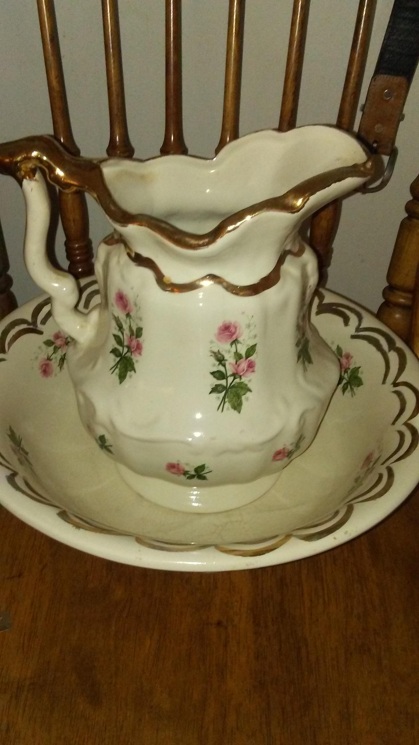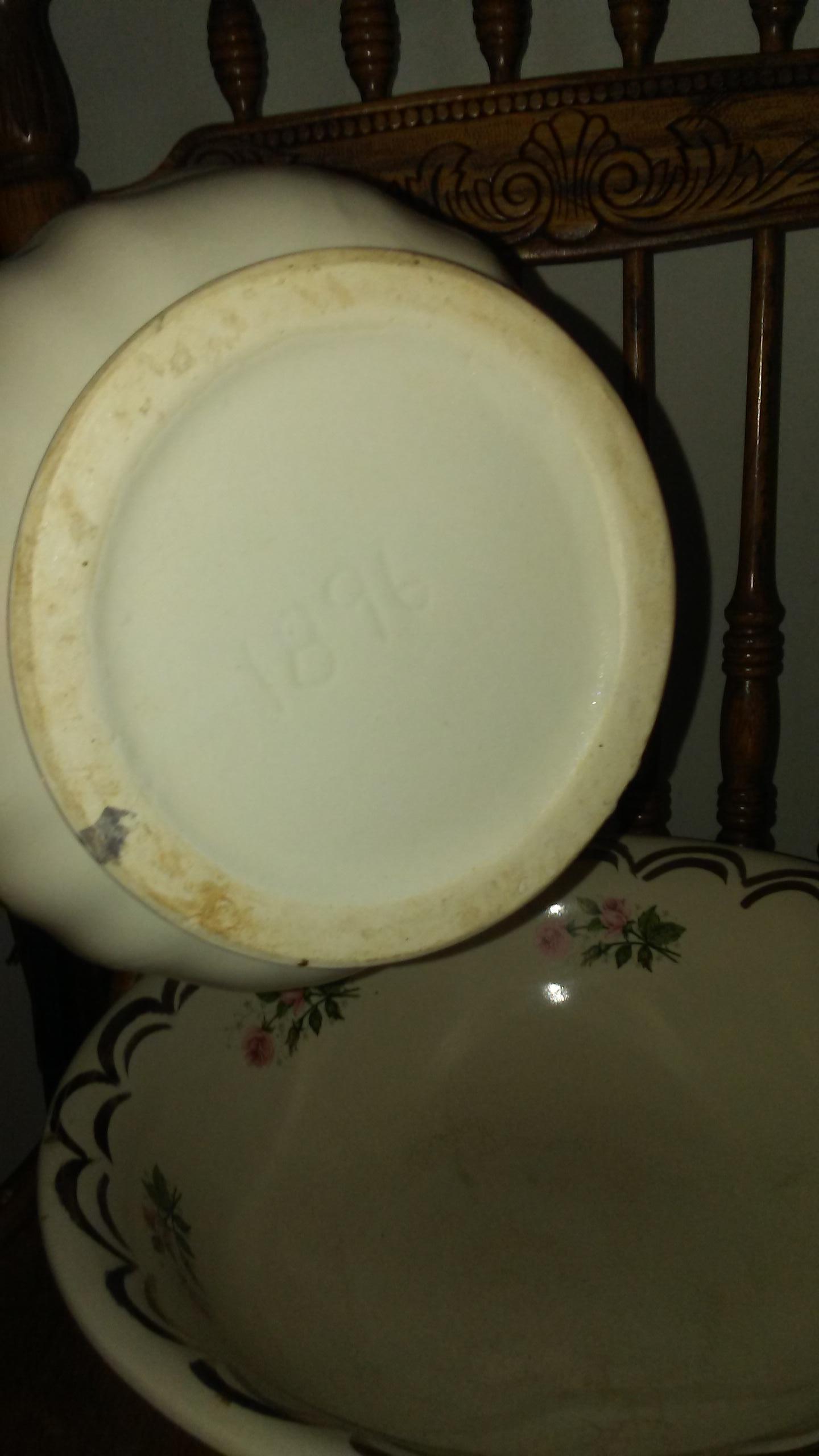 1896 porcelain wash bowl. Gold trimming with pink roses and greenery. In good condition.