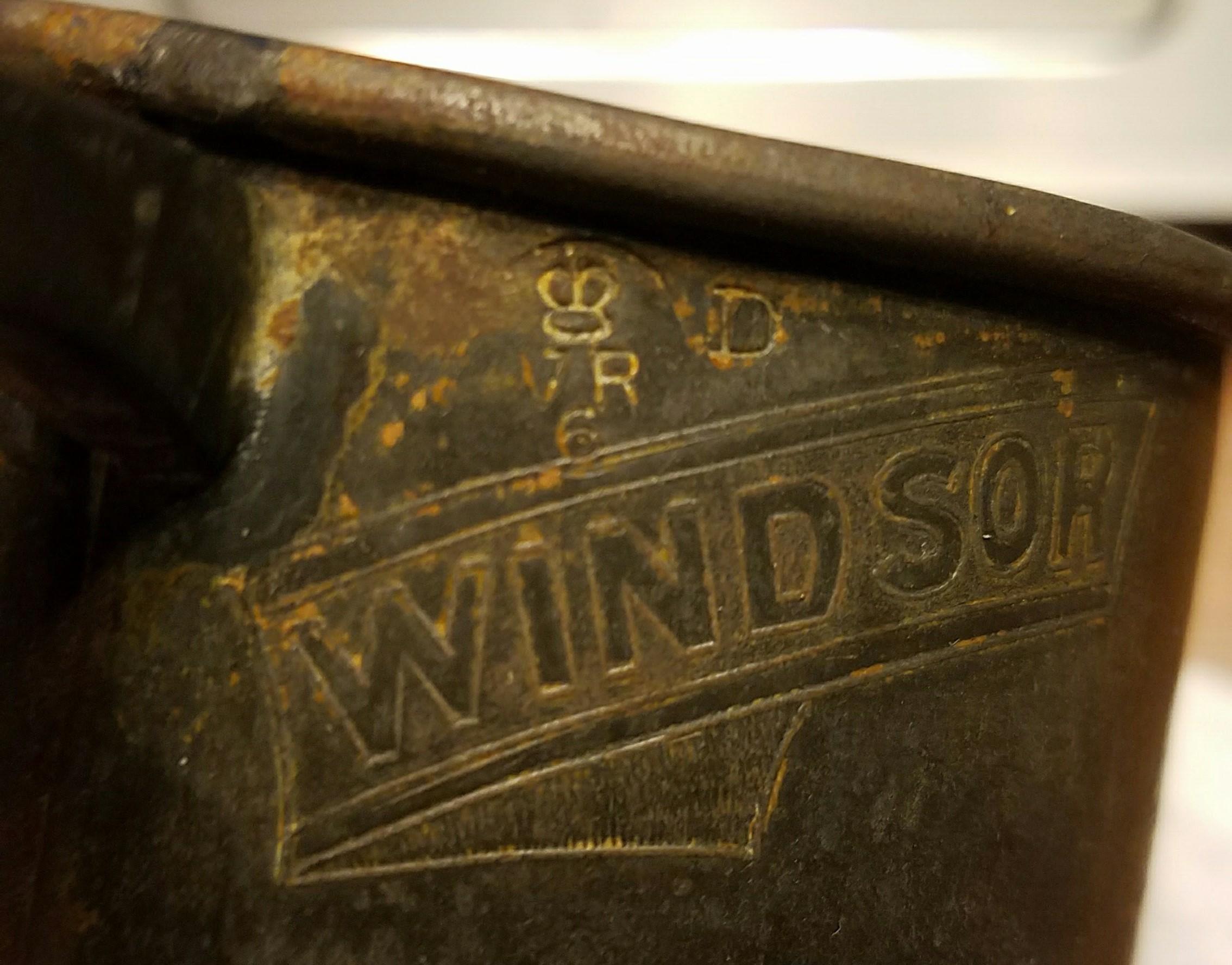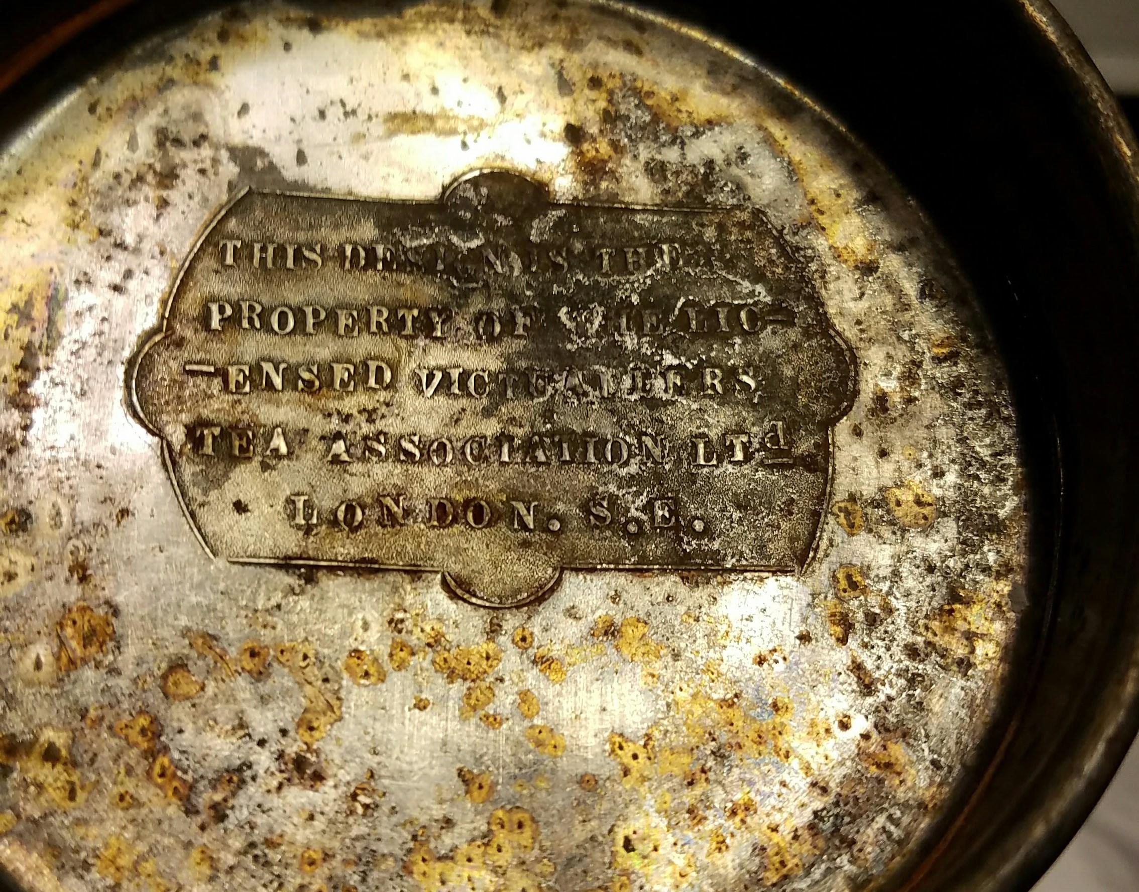 This is a used metal tankard with the inscription "TO COMMEMORATE THE 60TH YEAR OF THE REIGN OF HER MOST GRACIOUS MAJESTY THE QUEEN 1837 1897" The back has an inscription and title of WINDSOR CASTLE. The bottom says "THIS DESIGN IS THE PROPERTY OF THE LICENSED VICTUALLERS TEA ASSOCIATION LTd LONDON. S.E." The size of the tankard is inscribed as 1/2 pint. an in the corner near the handle is a government punch of the crown VR 6 D. It is approximately 5 inches tall, 2.5 to 3" inches in diameter. Considerable rust on the inside and as you can see a band of rust along the outside.