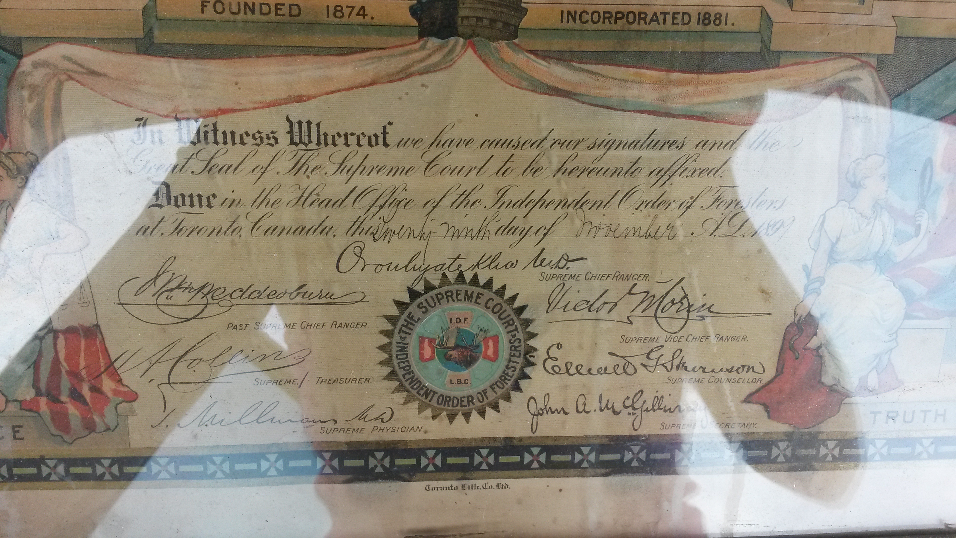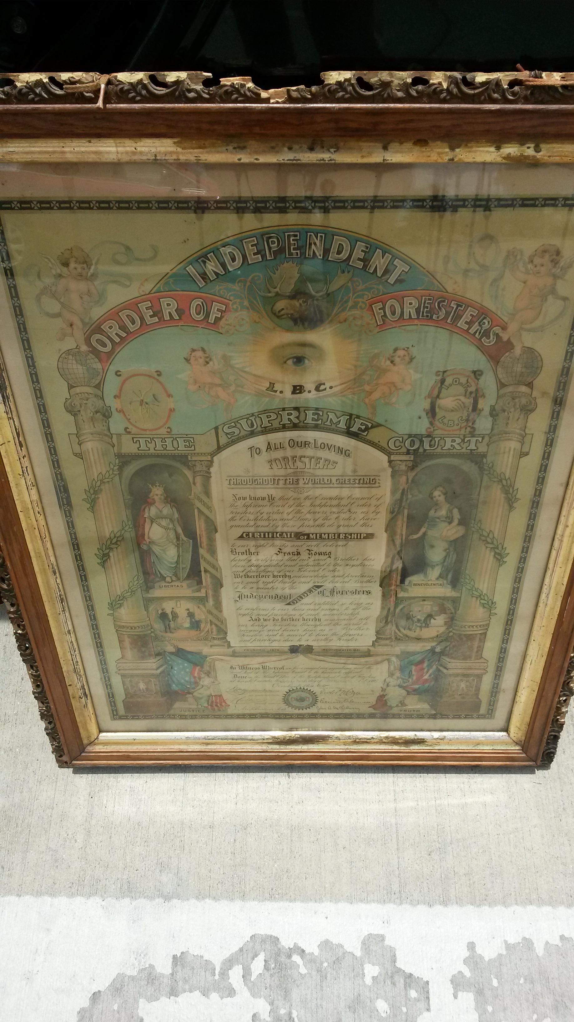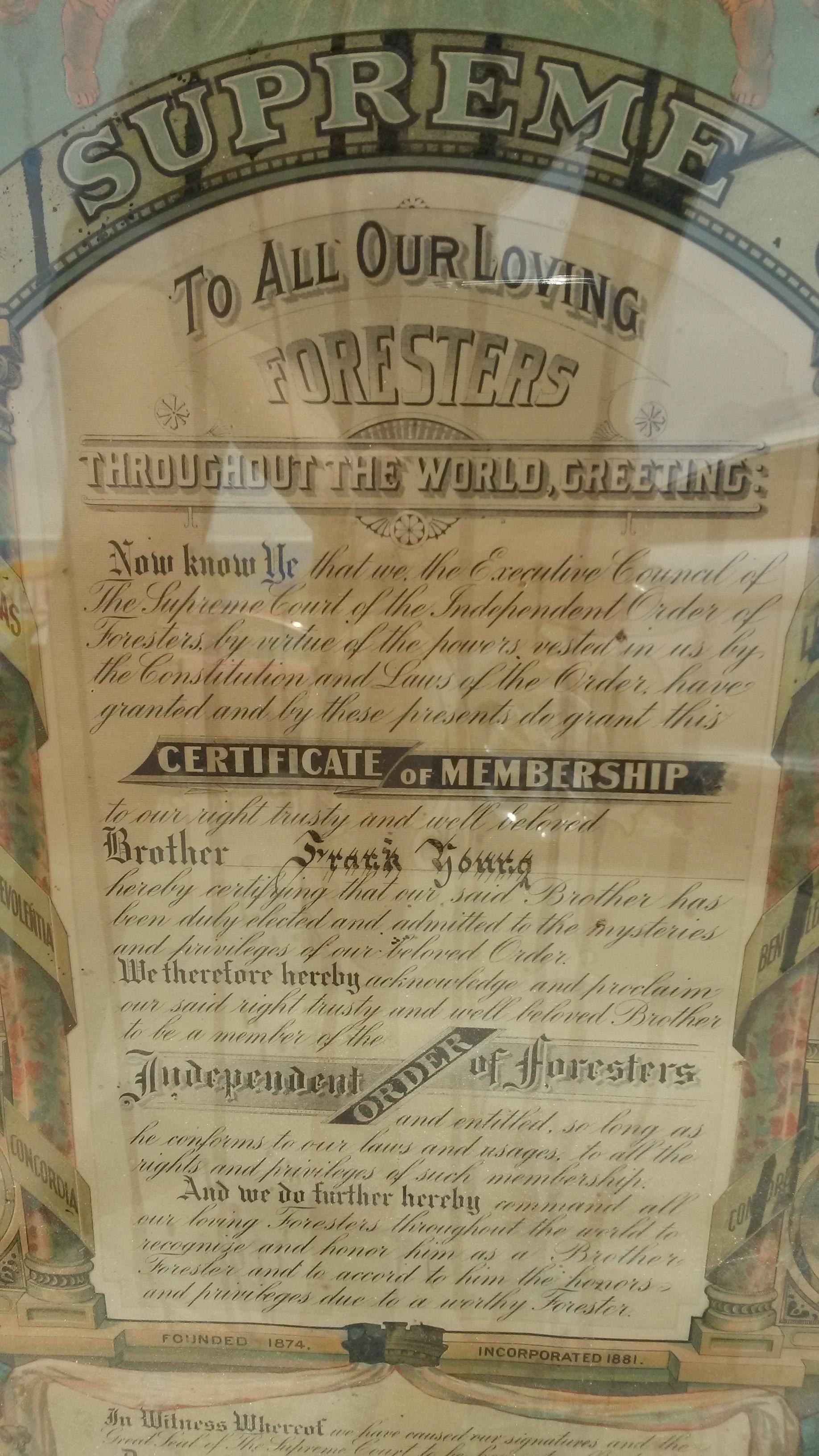 Certificate of membership to a Frank Young, in 1899. Order of foresters Supreme Court. 3 feet in height. Excellent condition. In a frame.
