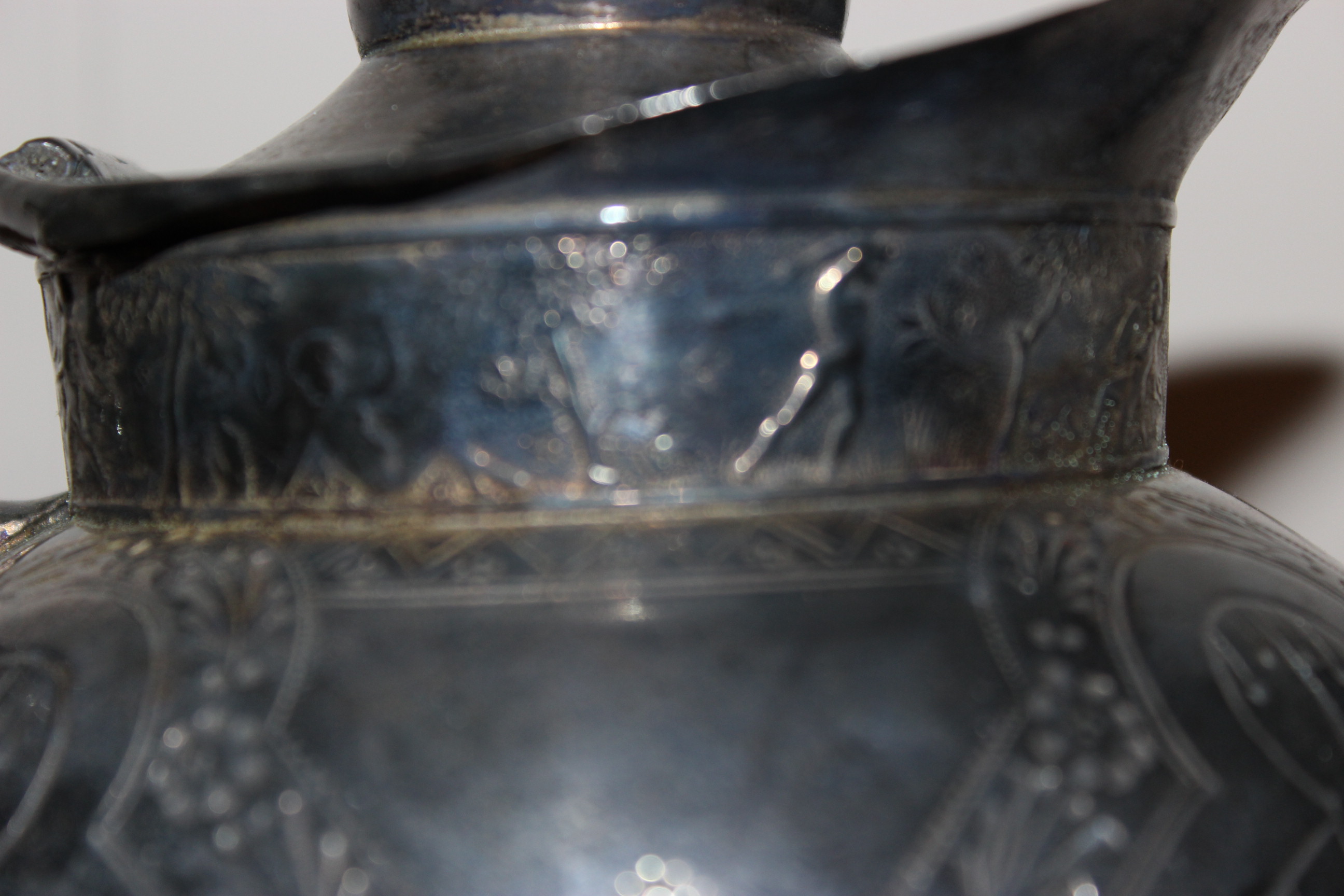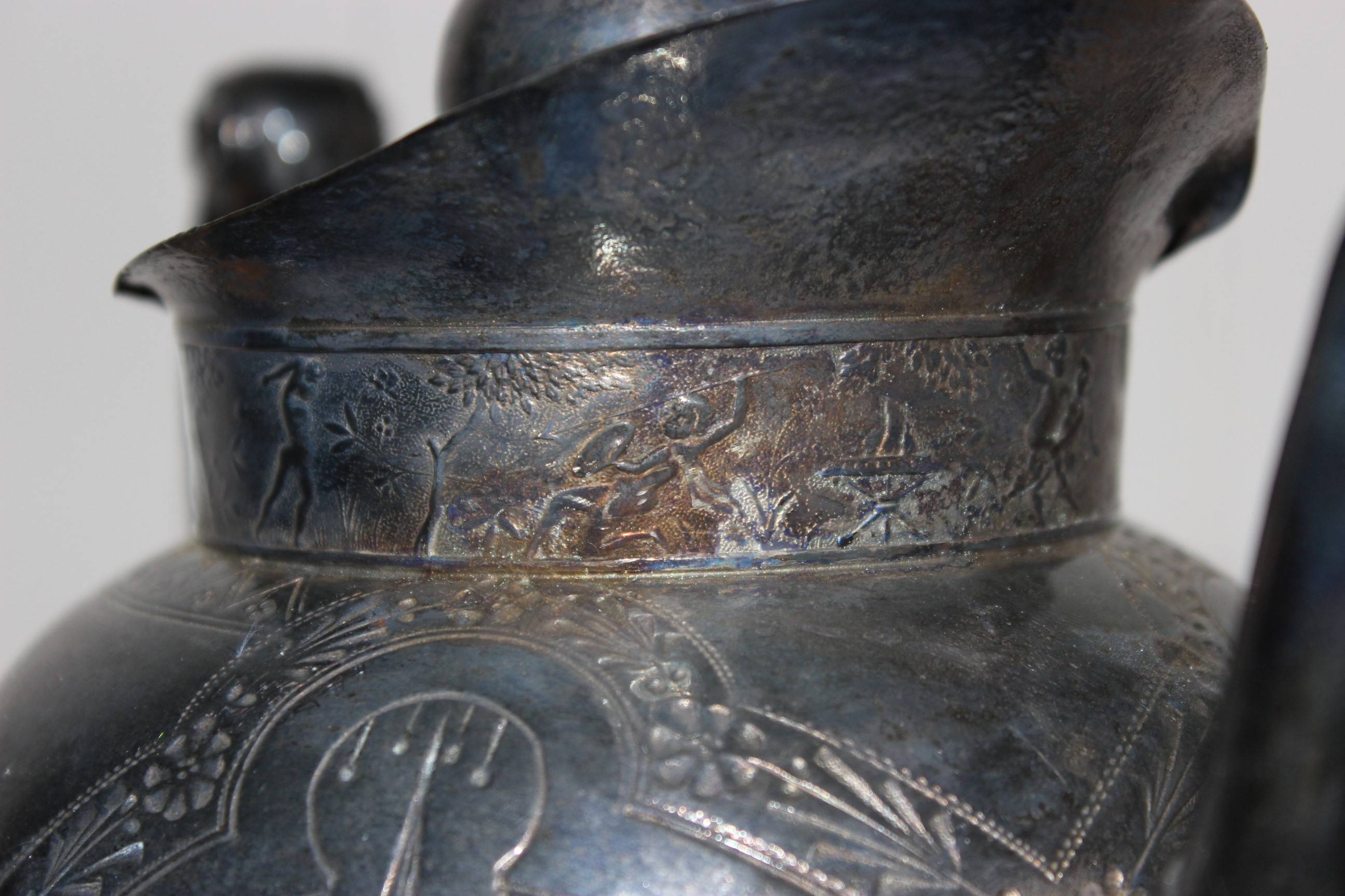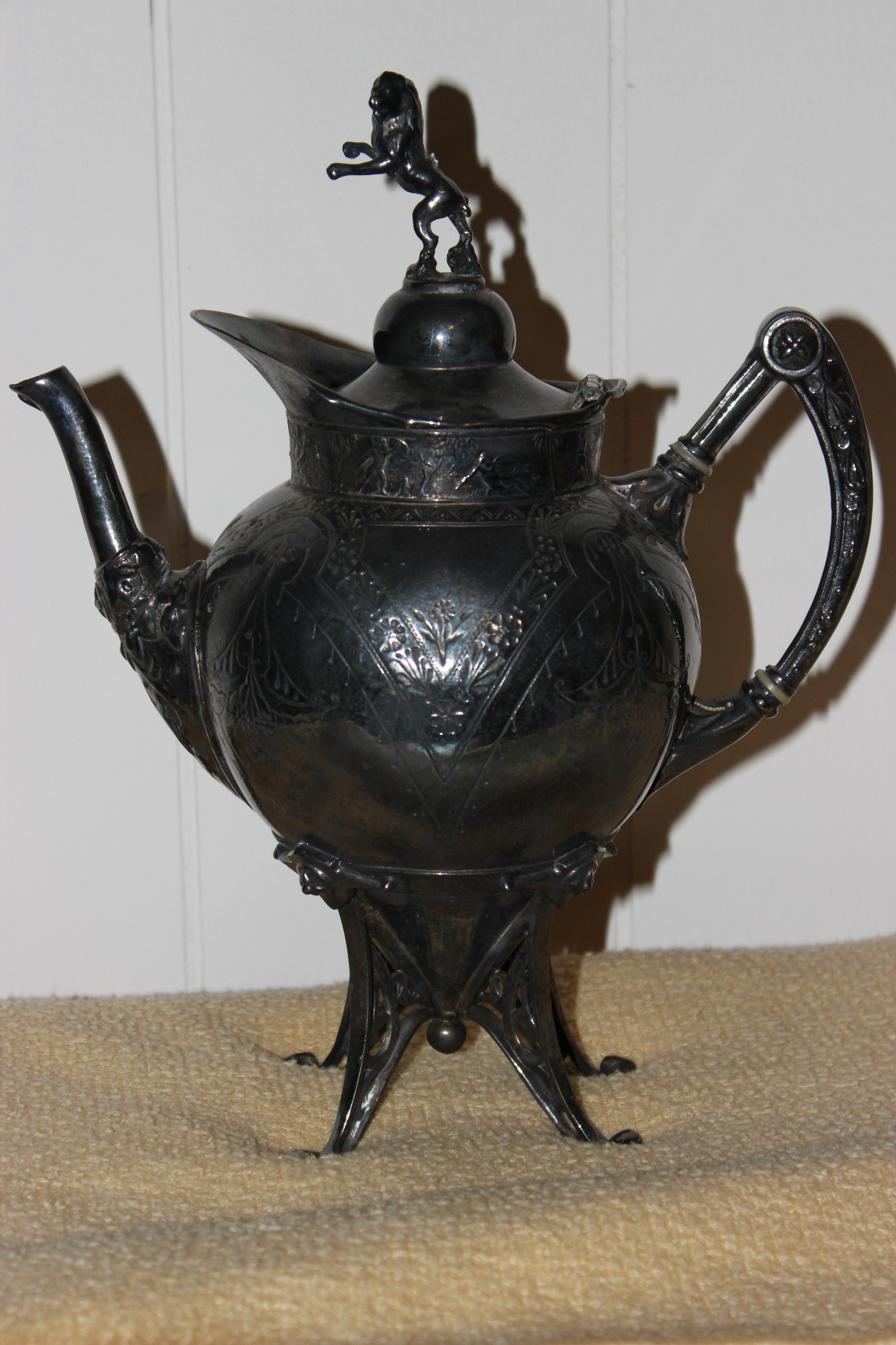 Silver plated Meriden B teapot with lion on top. Marked with scales and 1899. Very fancy with designs of fighting and lovers around top. Tail on lion is shorter then it should be due to be broken. Very nice piece. Also bought two other pieces that one may be creamer server that goes with this one although it is dated 1887 so maybe not?