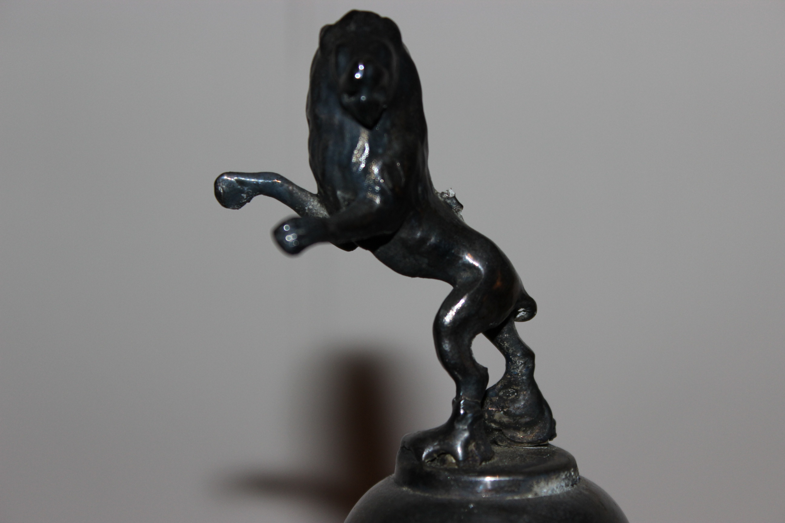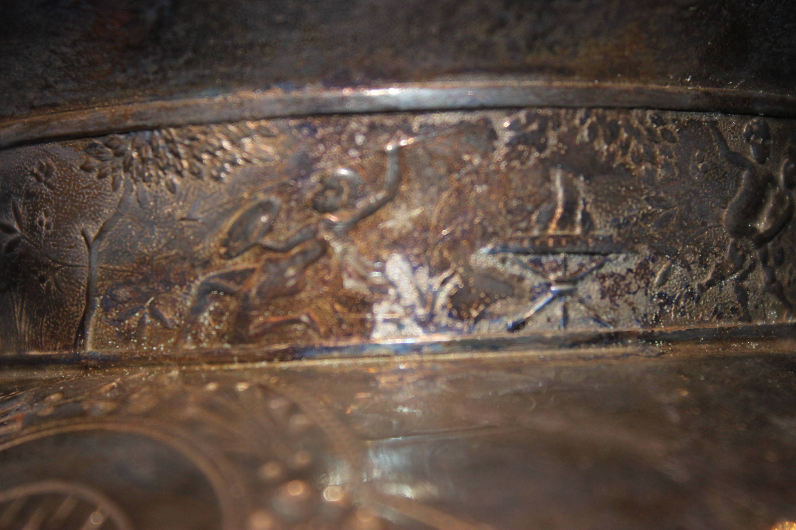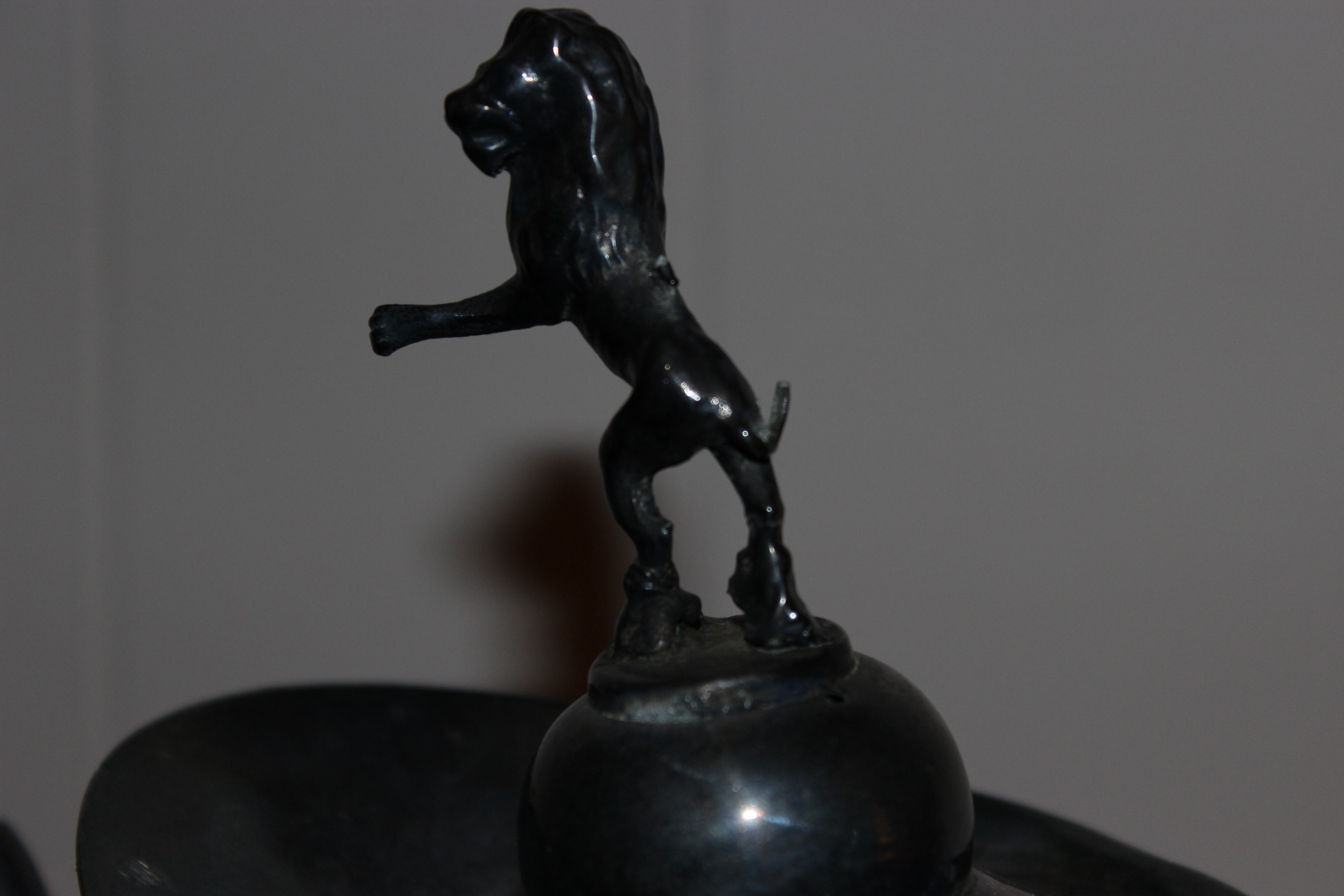 Silver plated Meriden B teapot with lion on top. Marked with scales and 1899. Very fancy with designs of fighting and lovers around top. Tail on lion is shorter then it should be due to be broken. Very nice piece. Also bought two other pieces that one may be creamer server that goes with this one although it is dated 1887 so maybe not?