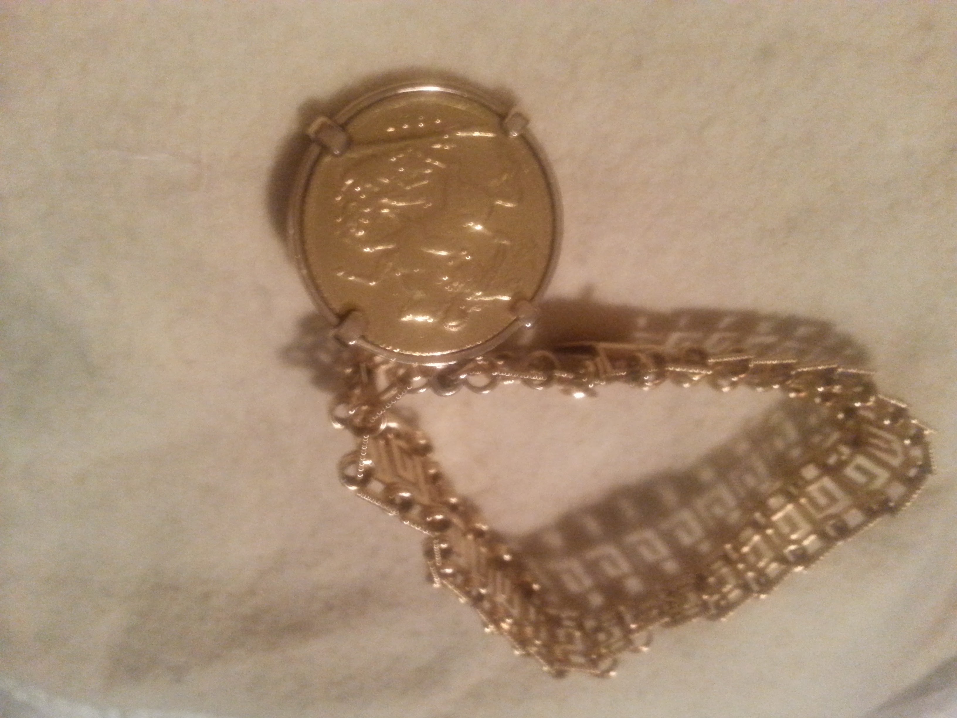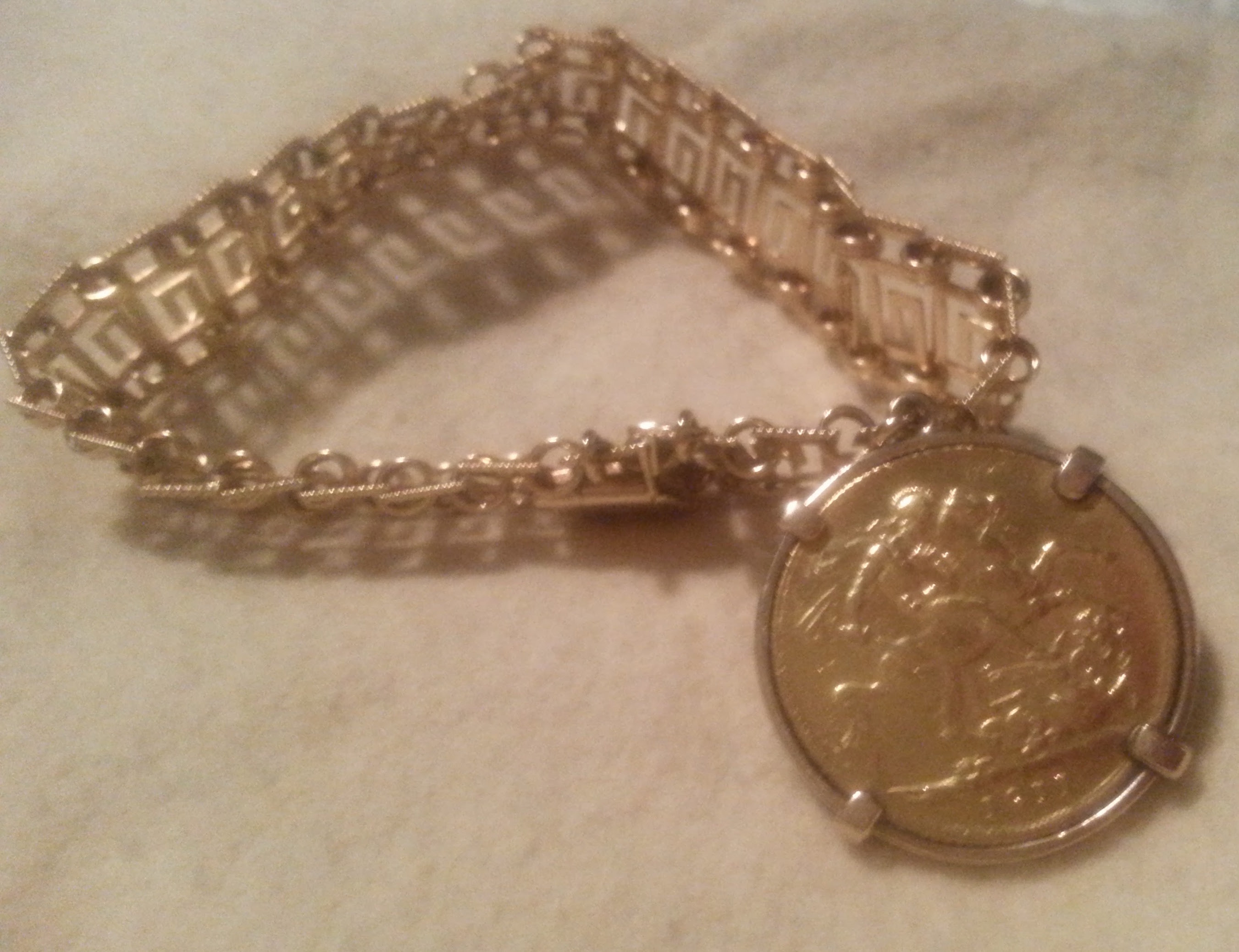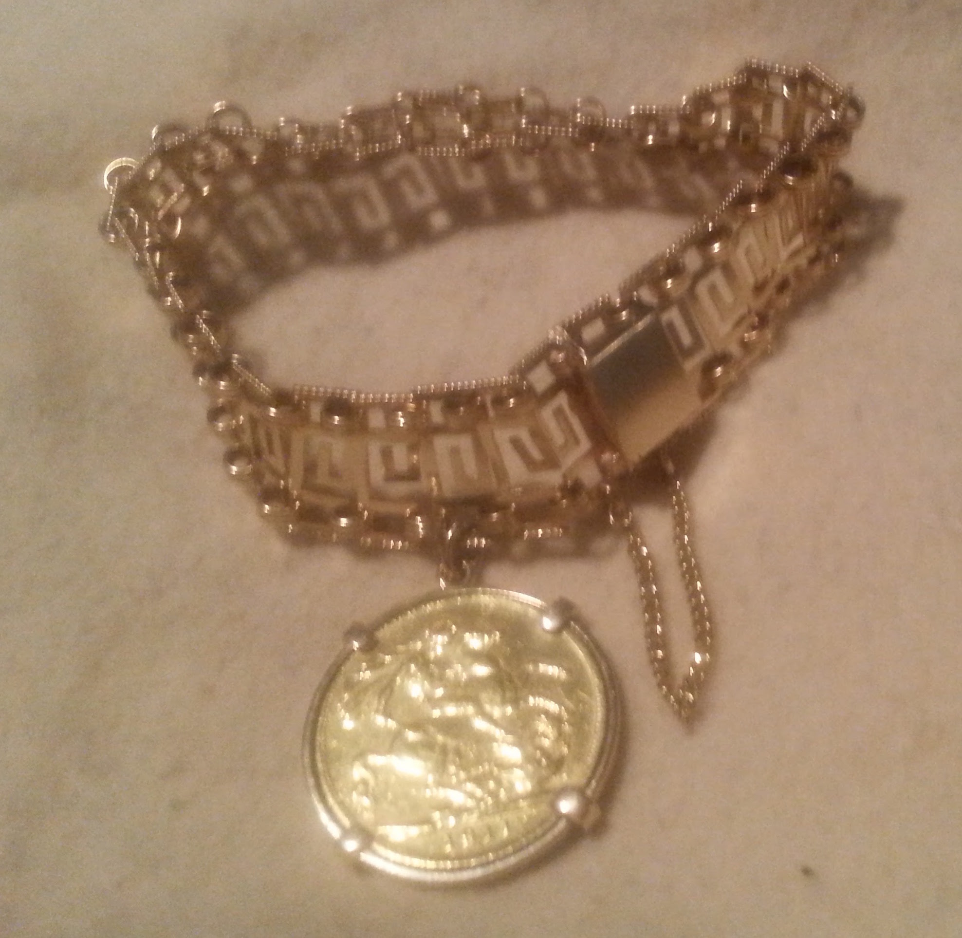18 K gold Greek maze design gold bracelet with 22K, 1911 Georgius V gold coin attached. Great condition, never worn. Weighs 18.5 dwt/28.6g.