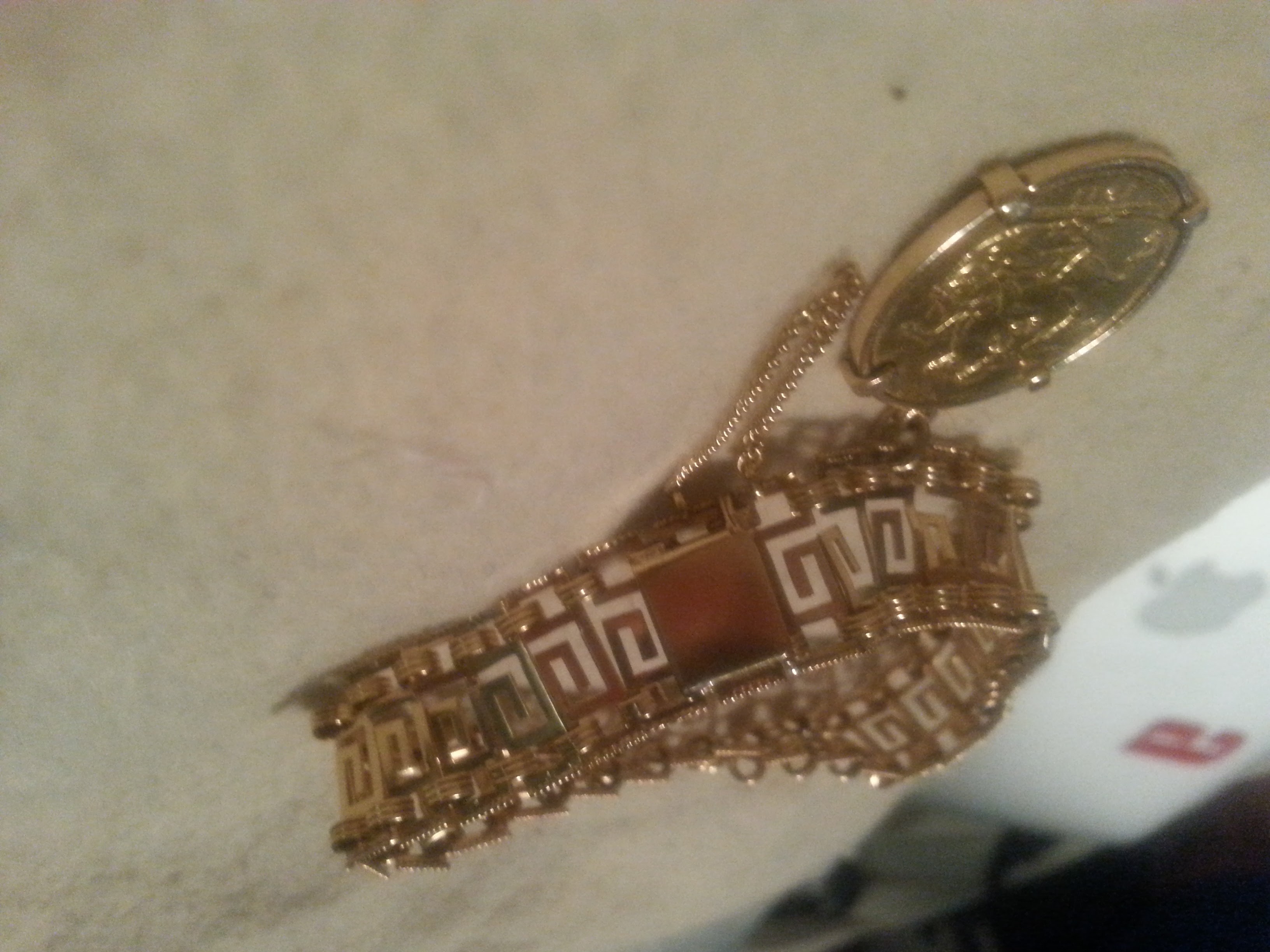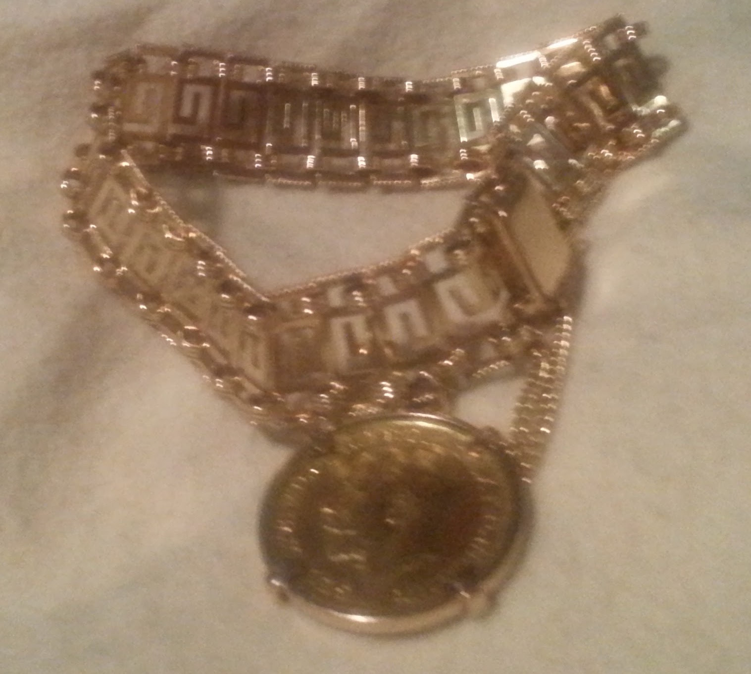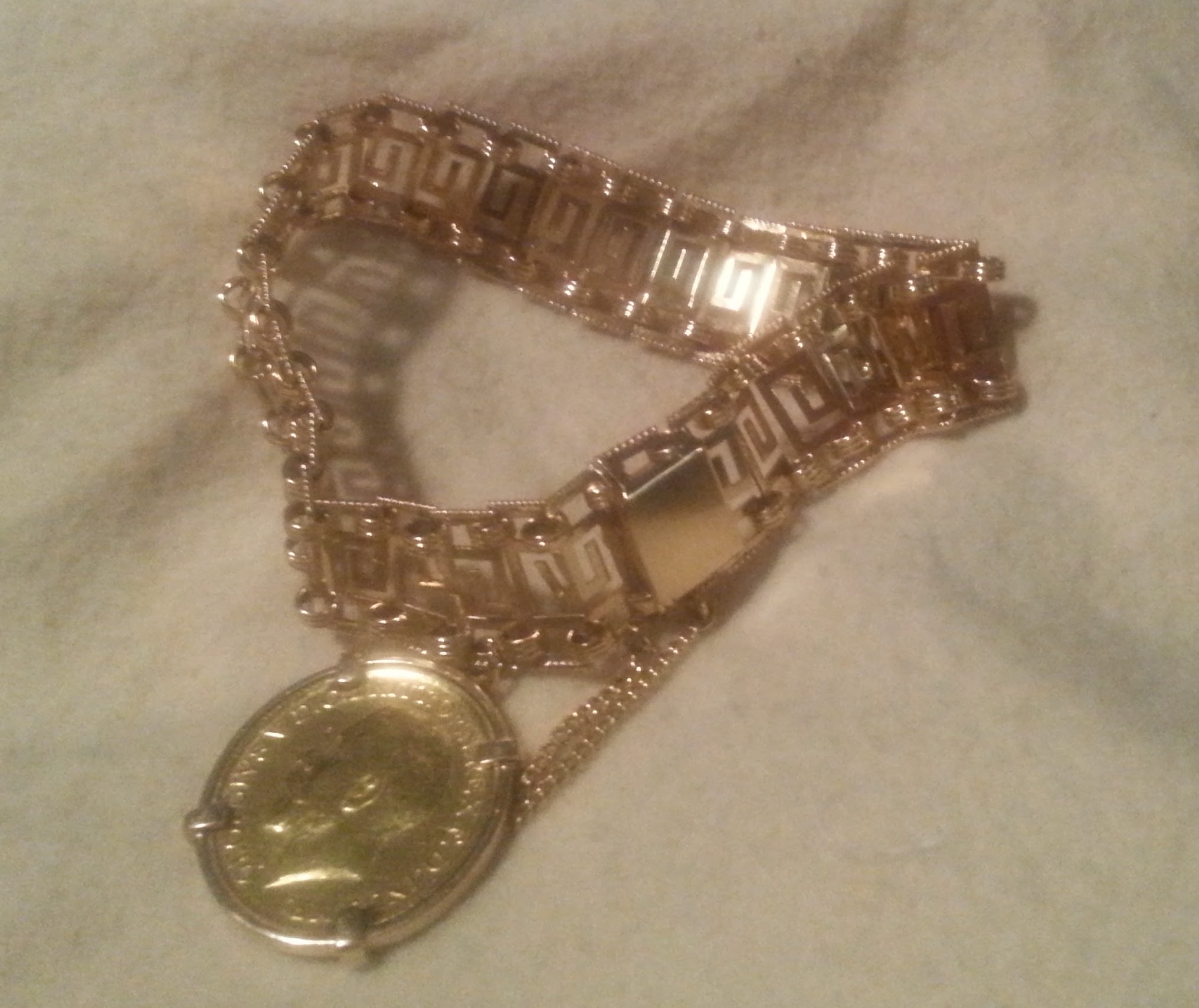 18 K gold Greek maze design gold bracelet with 22K, 1911 Georgius V gold coin attached. Great condition, never worn. Weighs 18.5 dwt/28.6g.