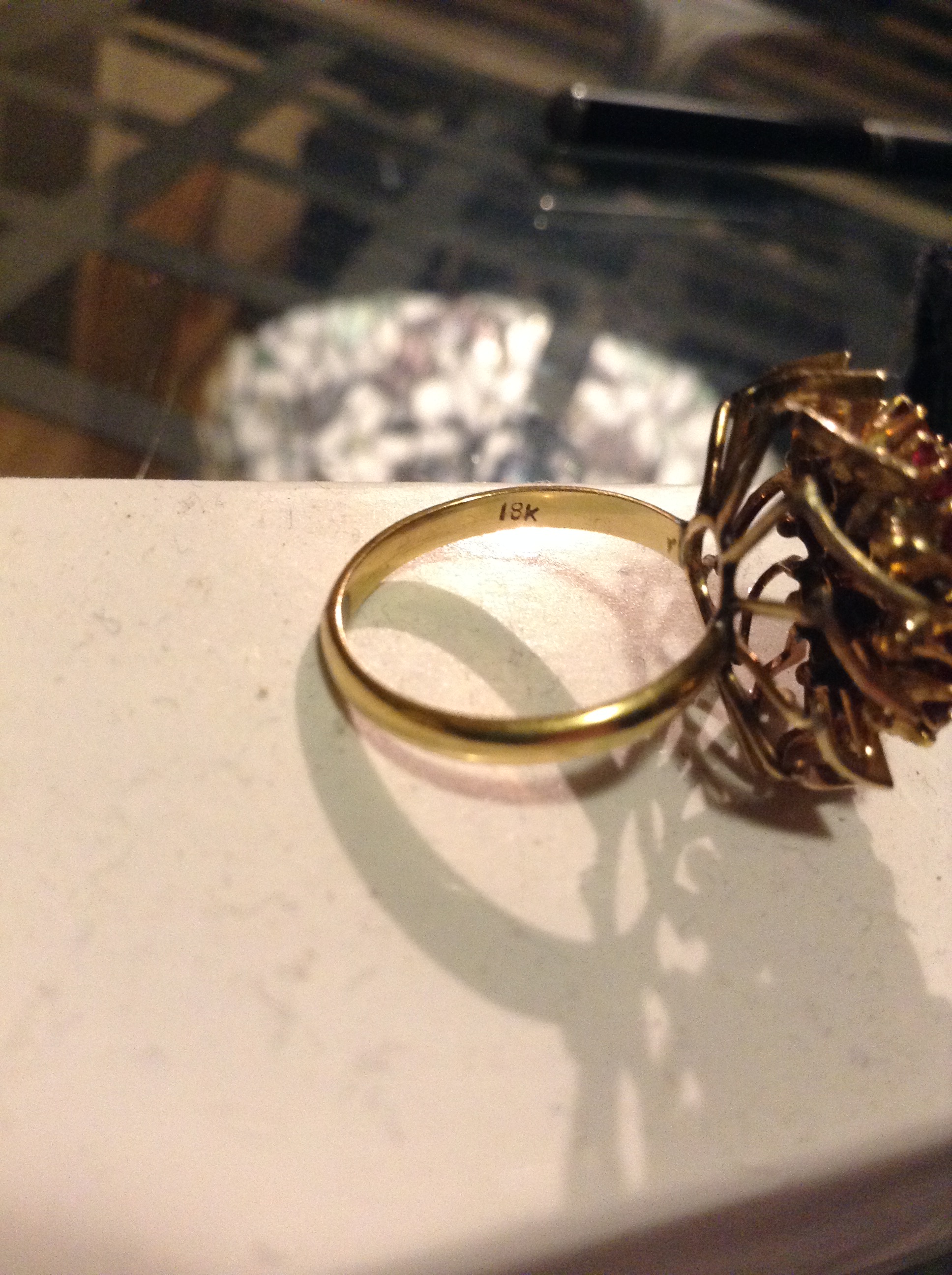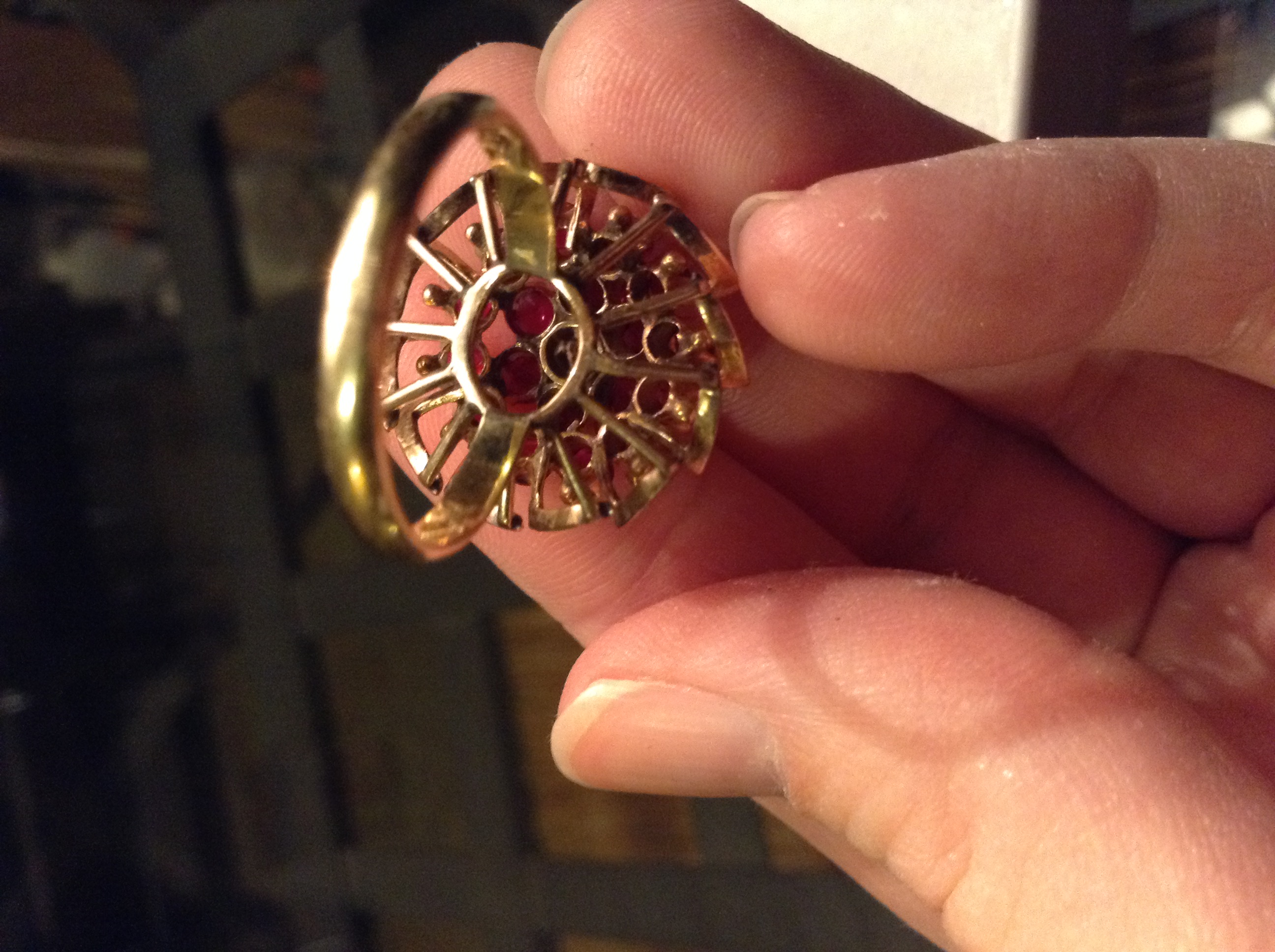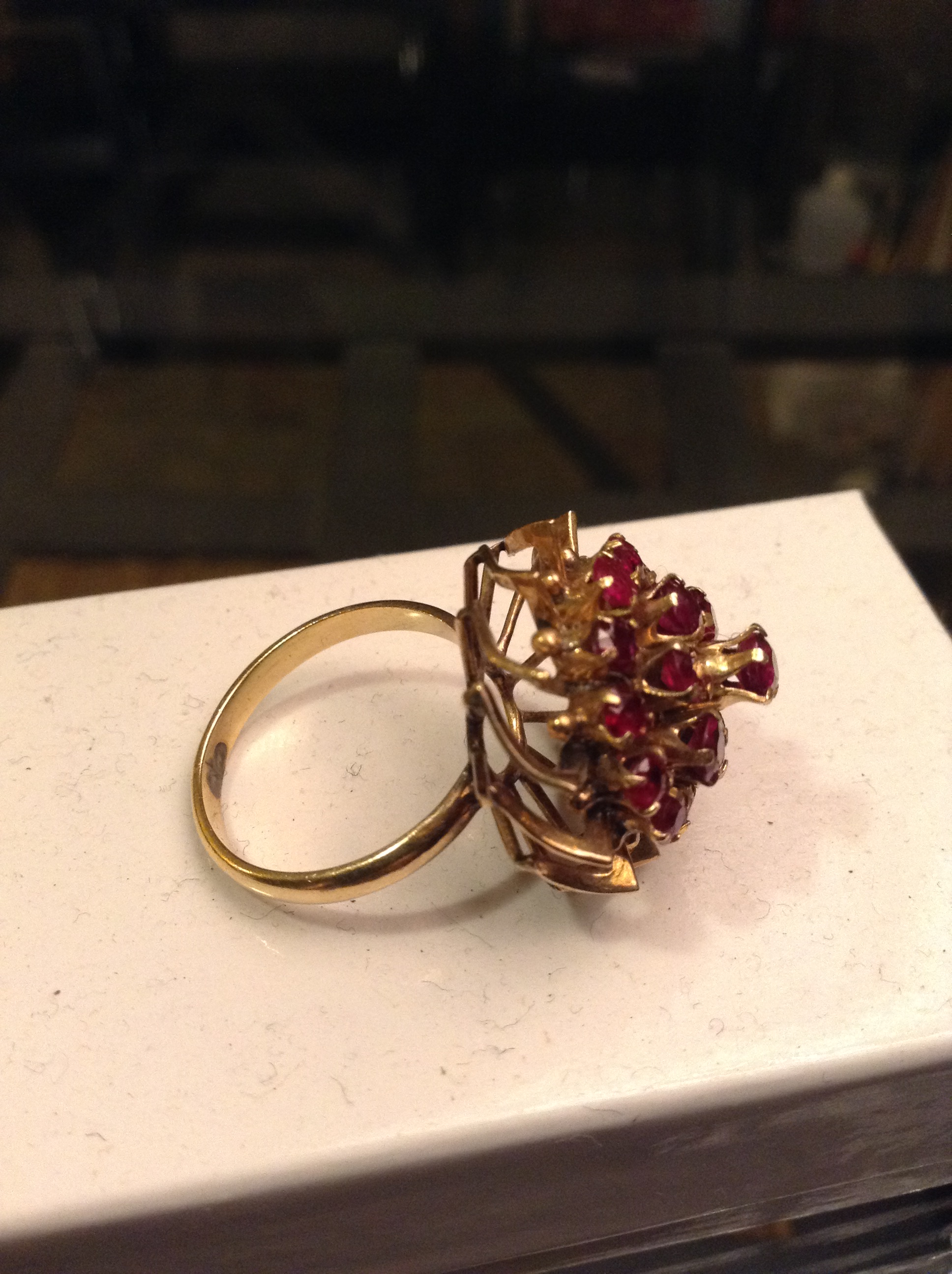The ring is very ornate. There are 2 tiers of small Rubies and the top tier holds a larger Ruby. It is tamped 18k very clearly.