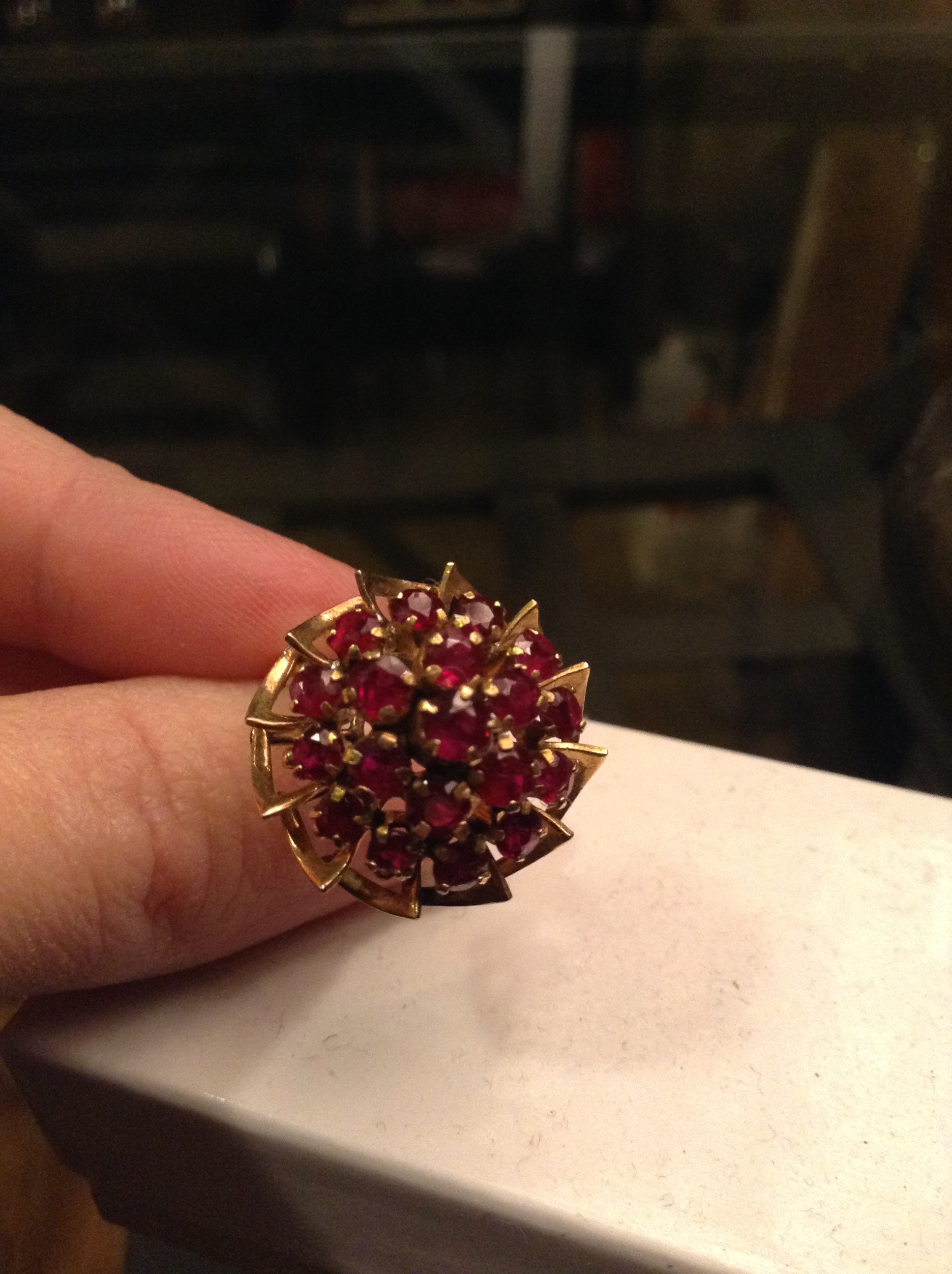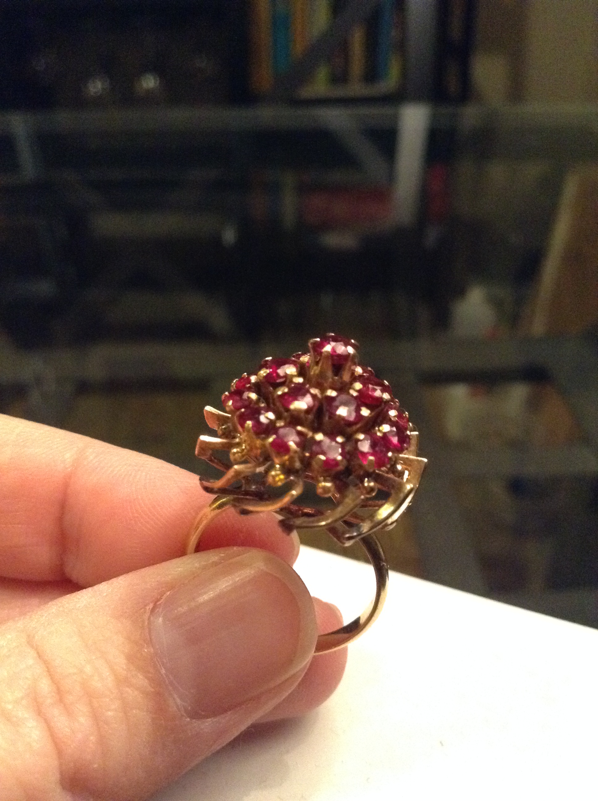 I have an 18k yellow gold ring that has 19 Rubies. Size 6. It belonged to my grandmother and I believe it was purchased in the early 60's?