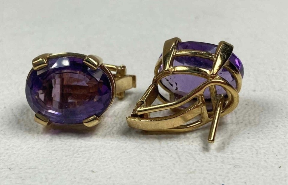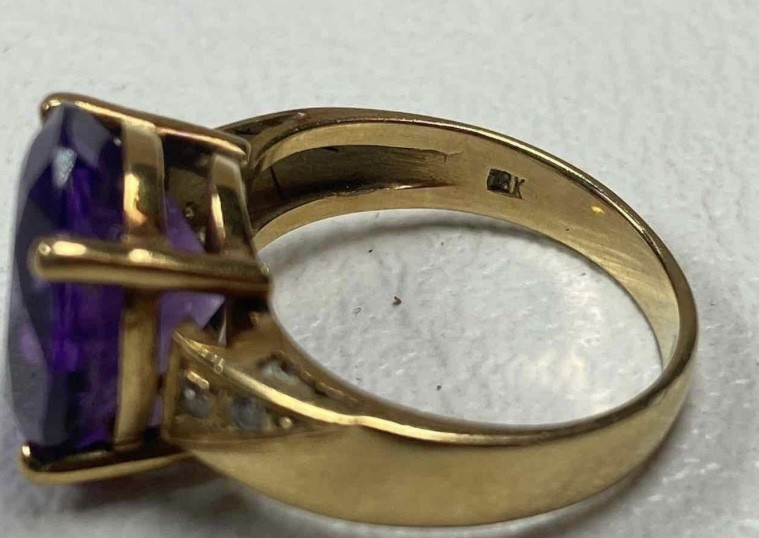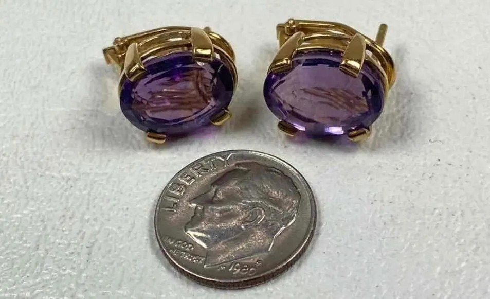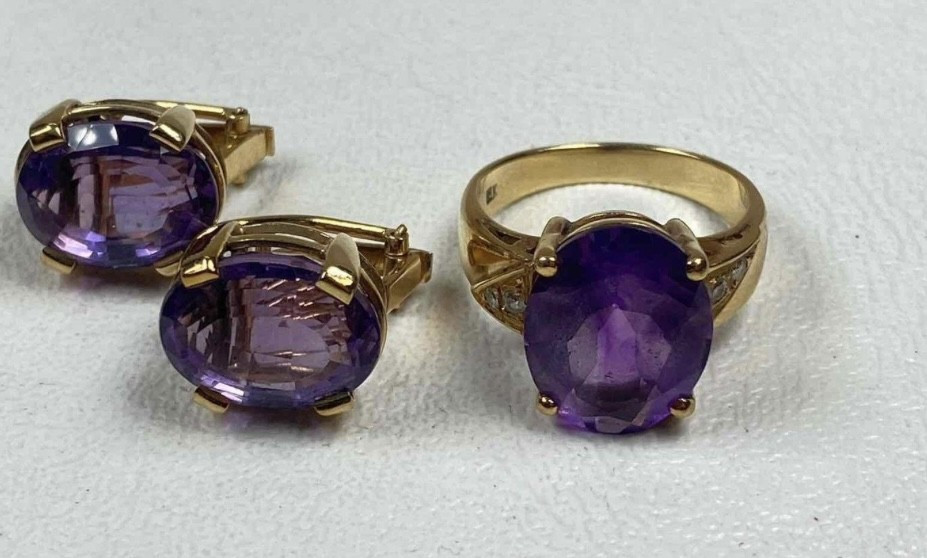 Description: 18k gold, amethyst jewelry including a ring, size 6 3/4, and matching post earrings, all with sizeable gemstones. The amethyst on the ring is approx 14.45mm x 11.25mm in size, plus there's (2) small CZ stones, each near 1.50mm and 2 larger CZ stones, each near 1.75mm in size. The oval amethyst on the earrings is approx 13.30mm x 10.25mm in size. The ring is marked and tests as 18k gold; the earrings do not have a marking, but test as 18k gold with the Olympus GoldX