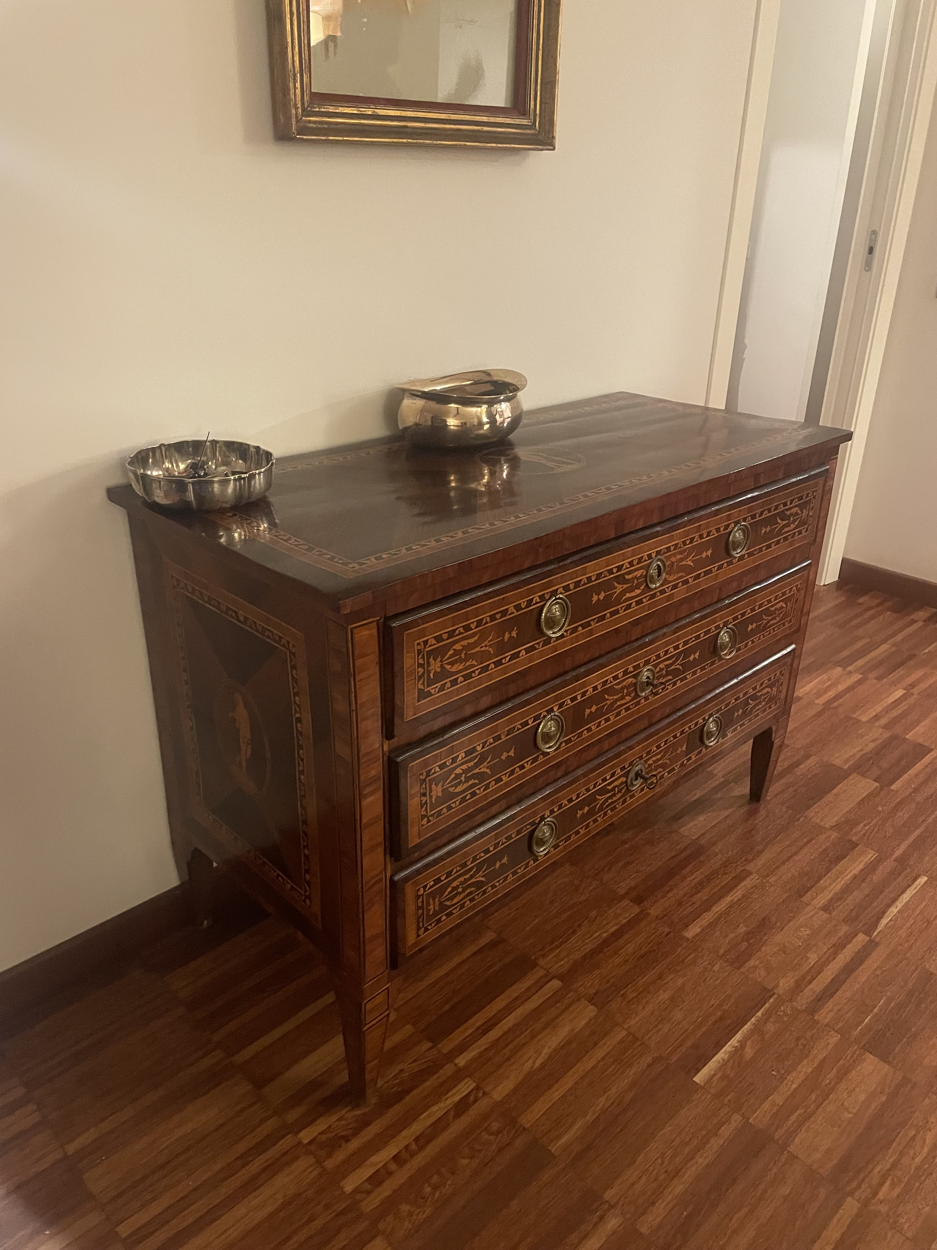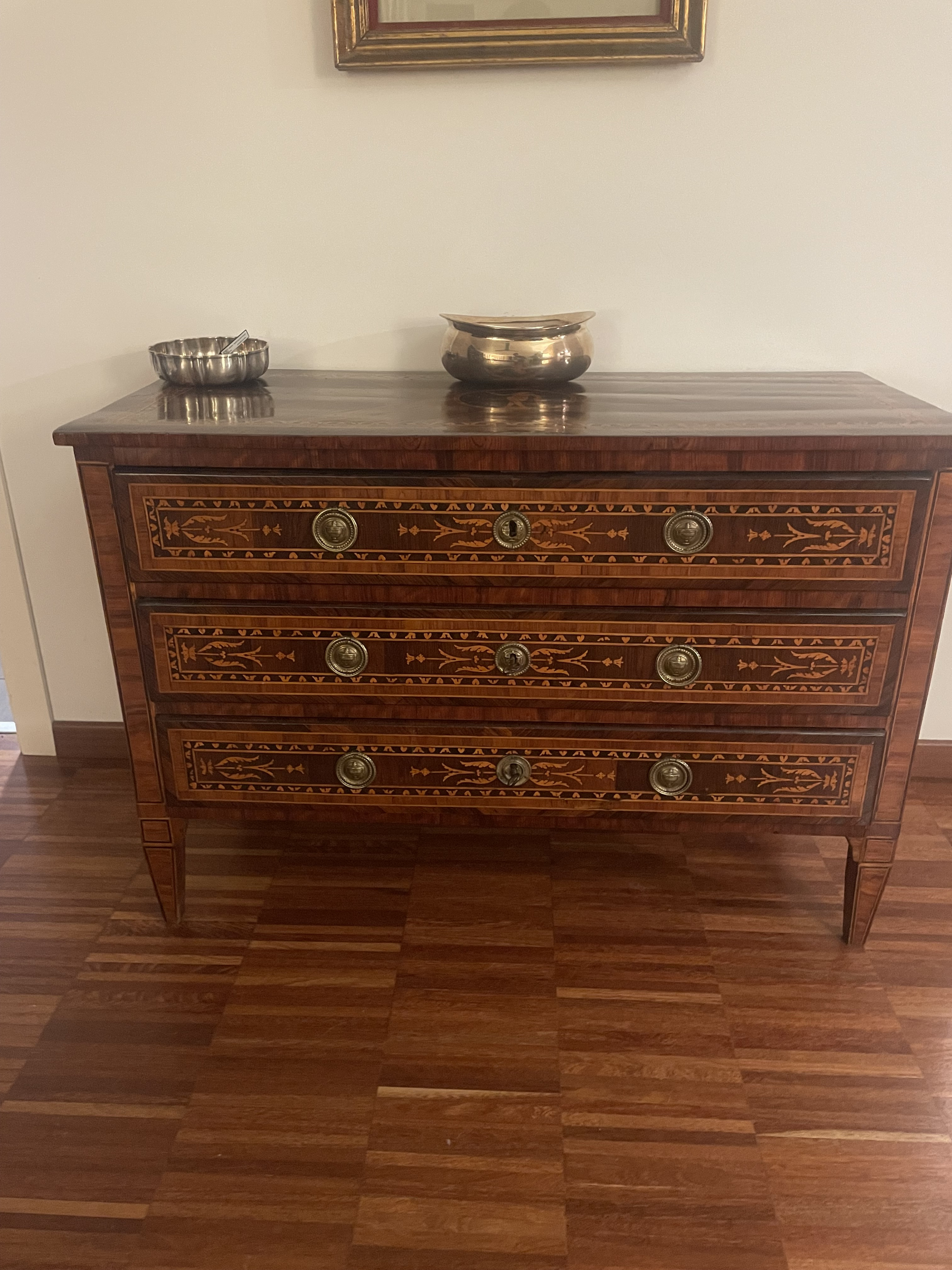 This exquisite 18th-century English inlaid chest of drawers features three elegantly crafted drawers, showcasing the artistry and craftsmanship of its time. The chest is made from high-quality hardwood, likely mahogany or walnut, with intricate inlay work that adds a touch of sophistication.