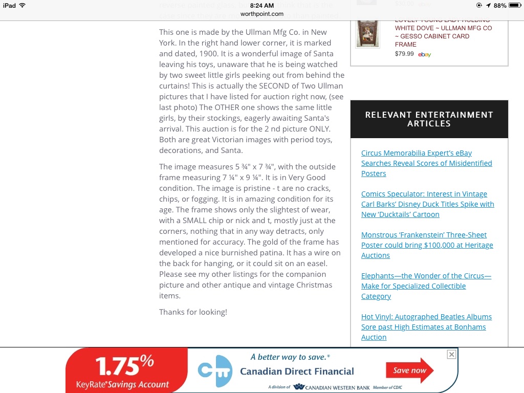 1900 ullman mfg the second of two paintings one of two girls waiting for Santa. The second is two girls watching Santa leaving gifts. I have the second painting. The original frame is missing, the picture itself is in excellent condition.i would like to know how many of these were produced as I have only seen one online,also an appraisal