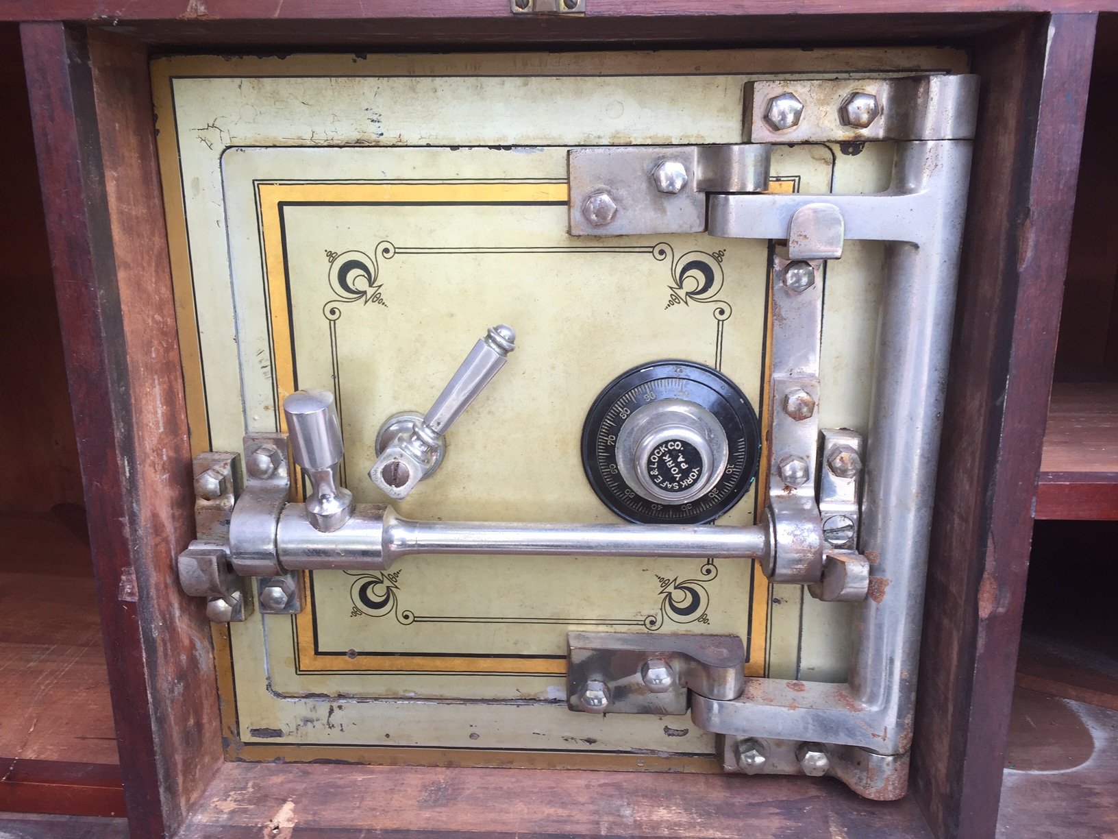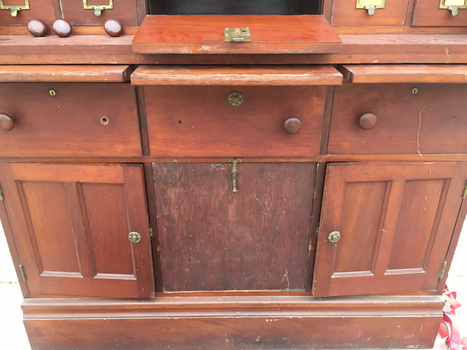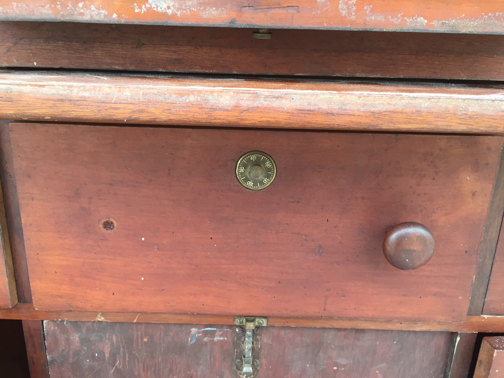 It has 4 combination dials and 5 key locks, with a safe on the bottom.  It has 72 smaller drawers, 8 medium size drawers, 3 large drawers.  It also has 3 boards that pull out to make a temporary shelf.