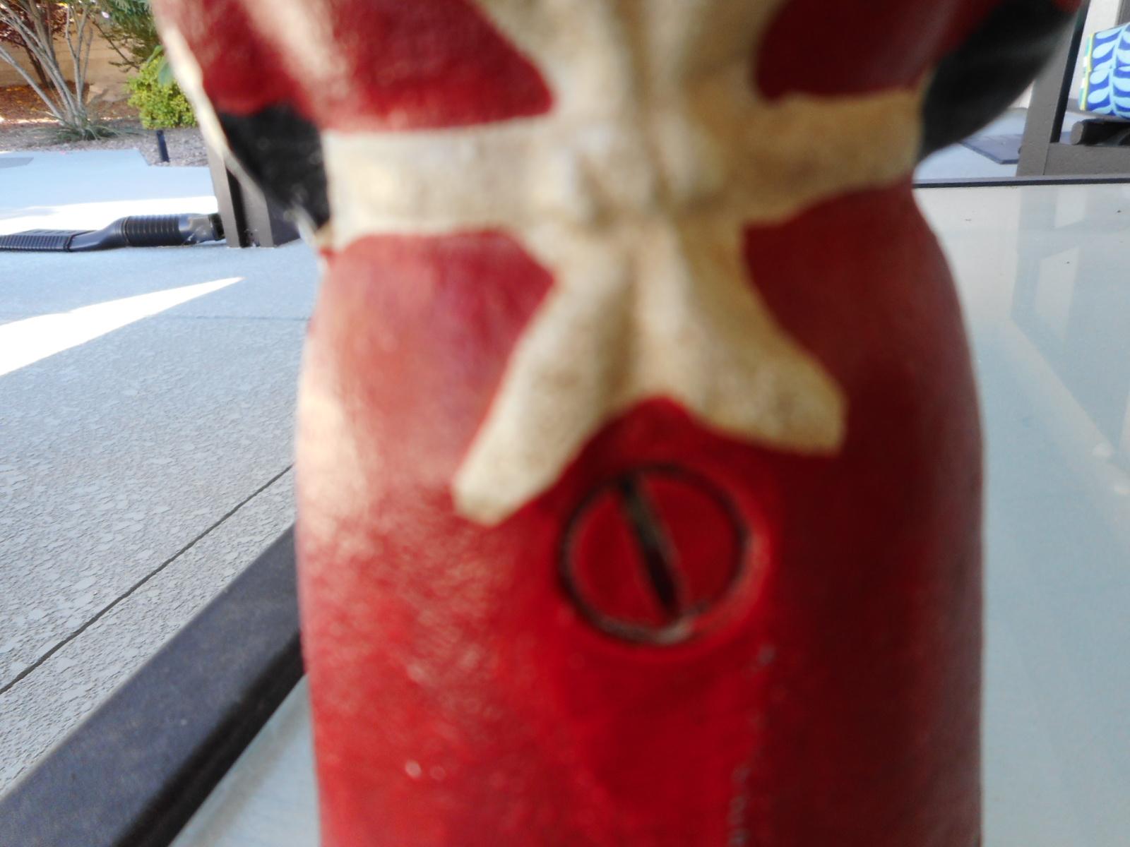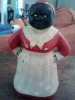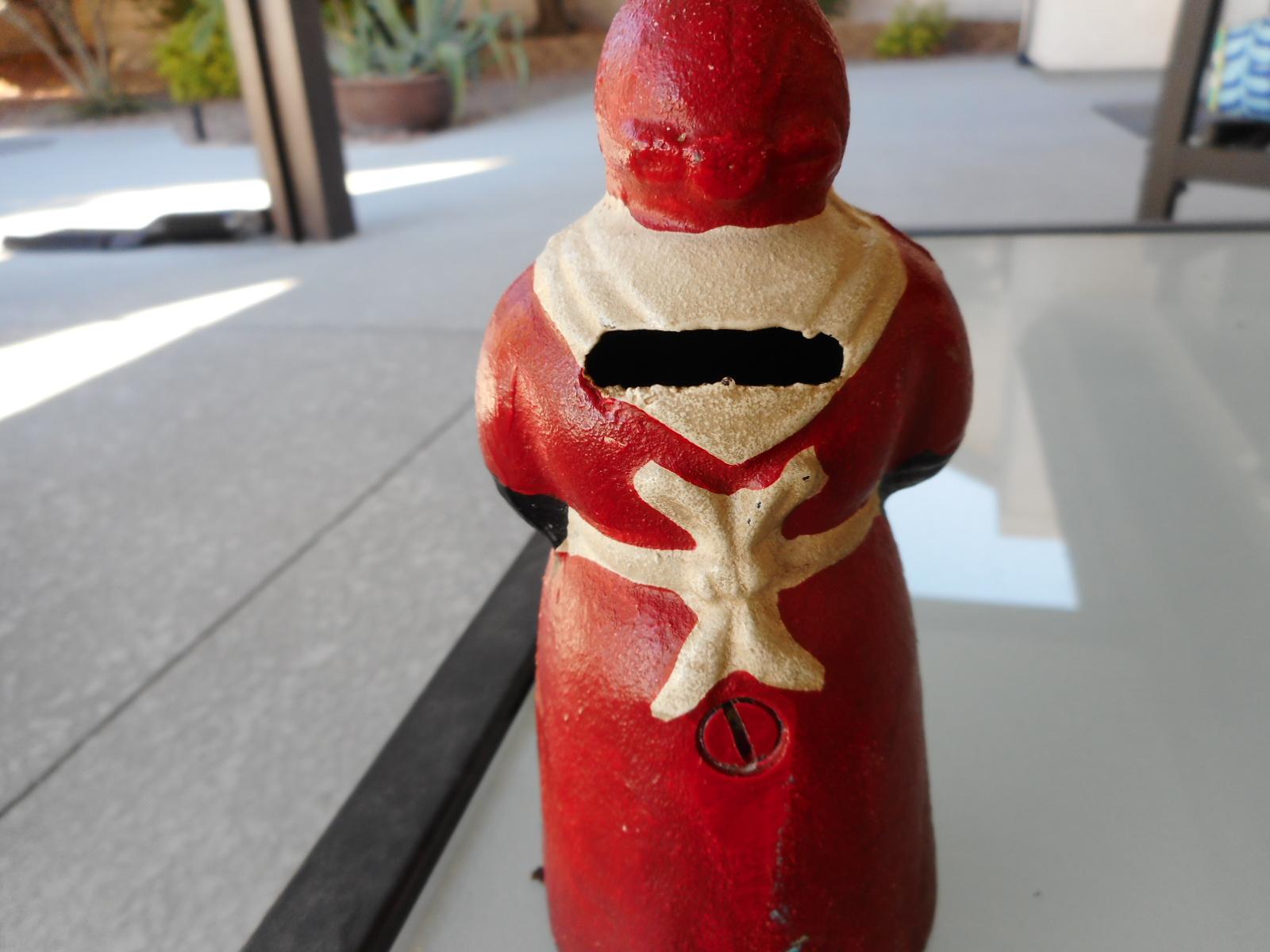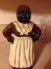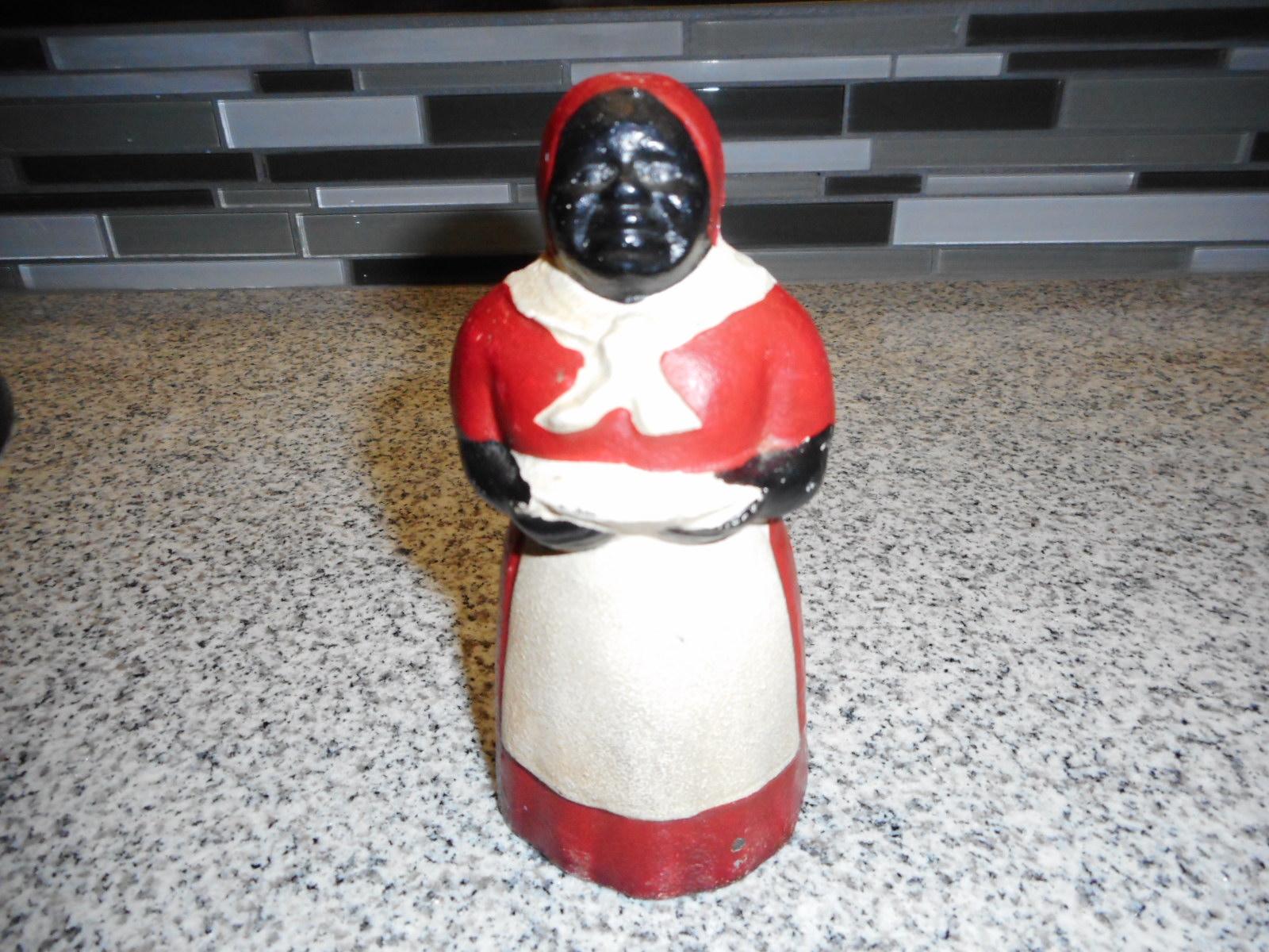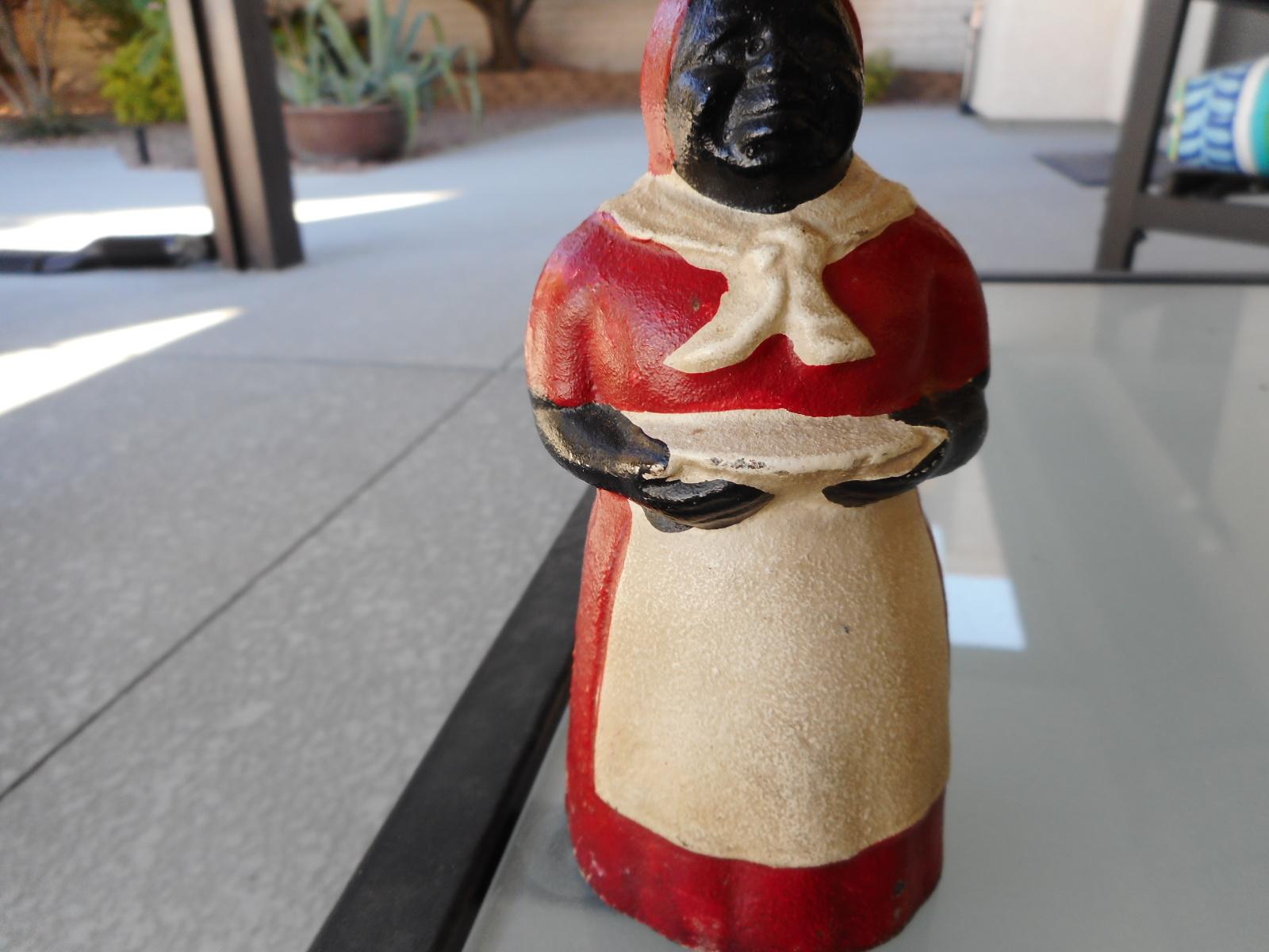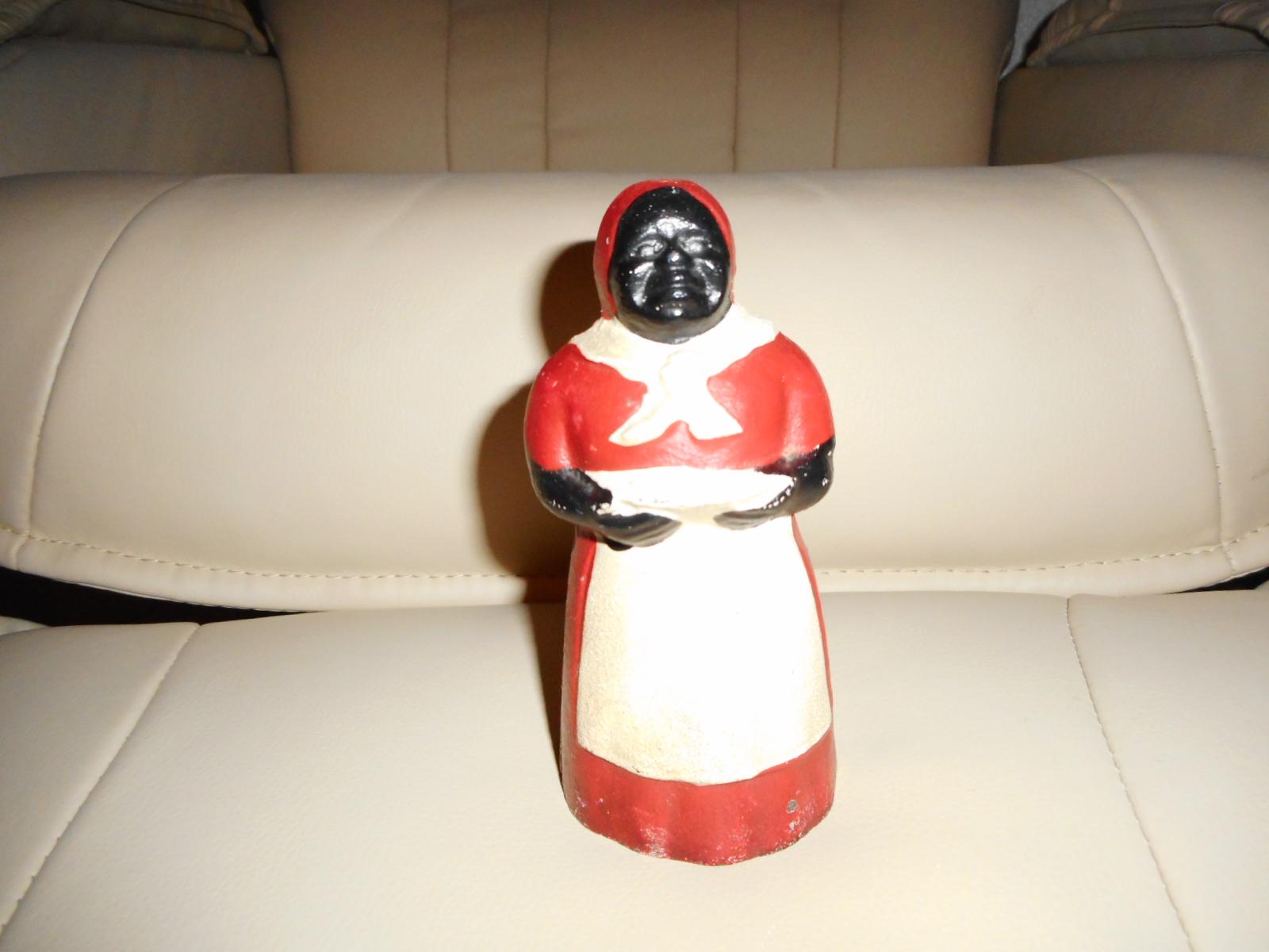 I have an Aunt Jamima cast iron bank. I am unable to find one exactly like the one I have. She is holding a pie? She does NOT have her hands on her hips. Also her bow on the back is white and the screw to undo bank is below the bow.
