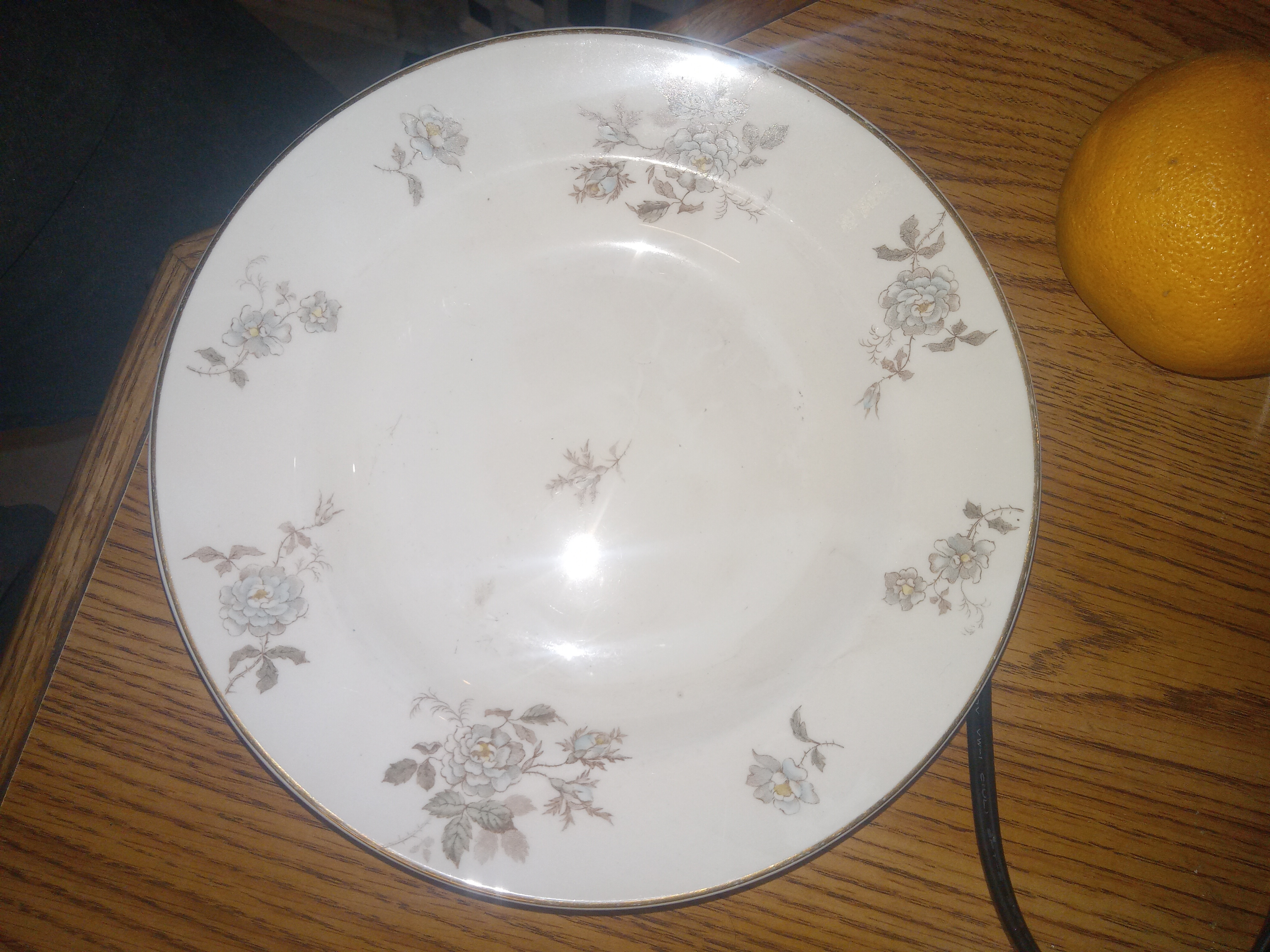 gold trim with gold roses around edge with a light blue color in flowers a gold rose bud on center bottom i think soup tureen i have 8 of them the have little or no cracking