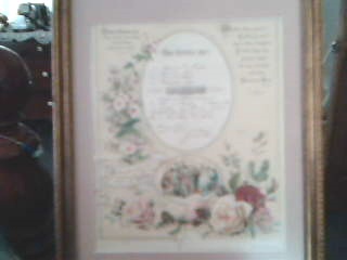 I BOUGHT THIS CERFIFICATE AT A THRIFT STORE IN 1999.IT WAS FRAMED IN A PICTURE FRAME.IT HAS 3 VERSES FROM THE BIBLE AND RED AND PINK FLOWERS PRINTED ON IT. ALL THE BLANK SPOTS ARE FILLED IN BY HAND. I COULD NOT GET A CLEAR PICTURE SO THIS IS WHAT IT SAYS.