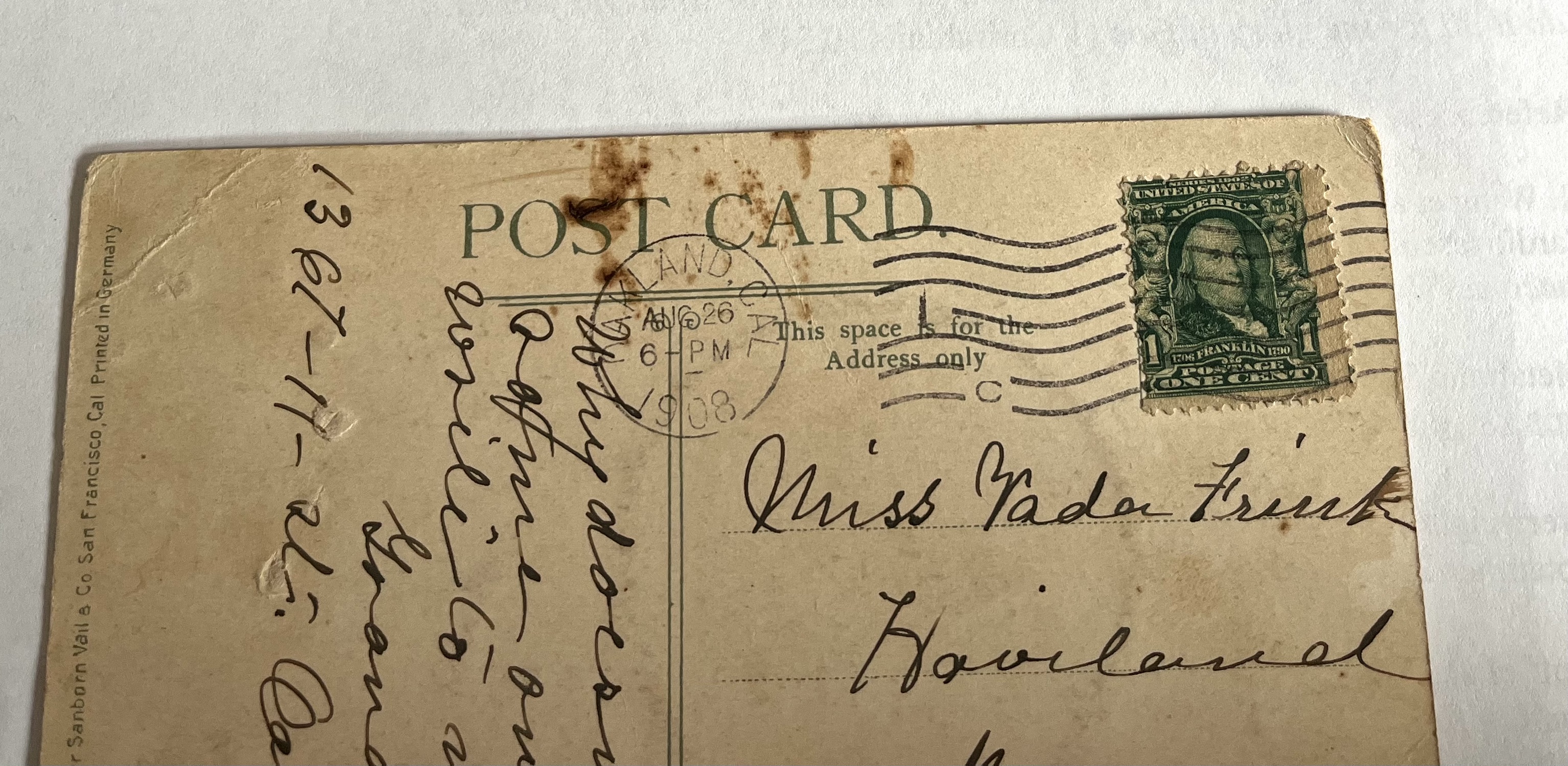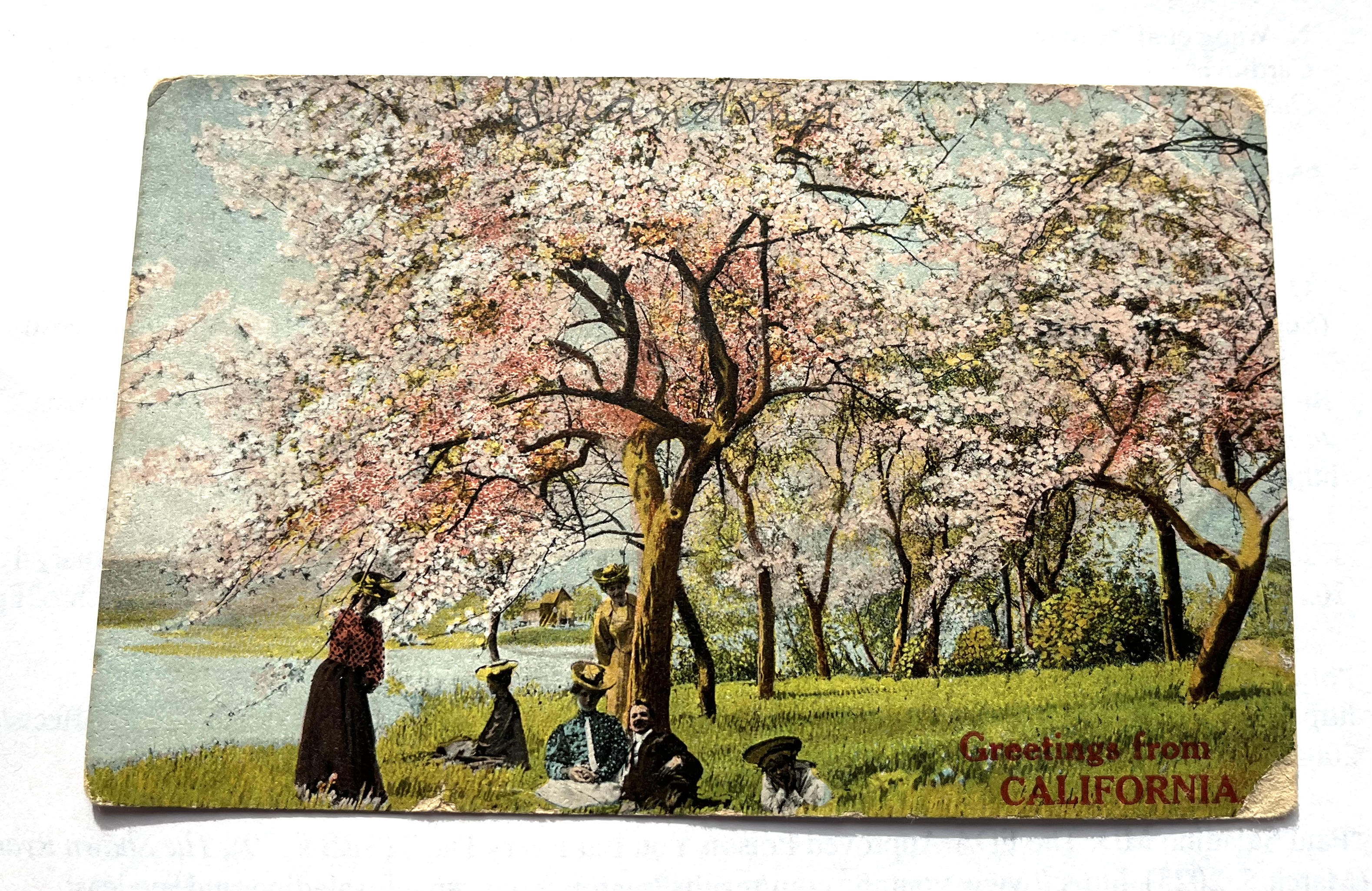 This postcard was sent from Oakland, California in 1908 from a grandmother to a 10 year old granddaughter in Kansas. It contains a beautiful lithographic picture of cherry blossoms on it.