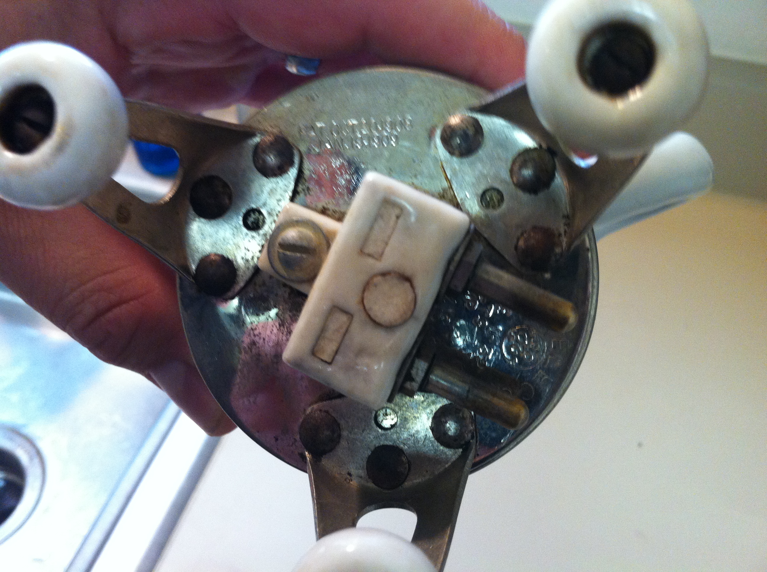 Medium Outside layer may be porcelain or glass. Inside layer is a very dark metal.
