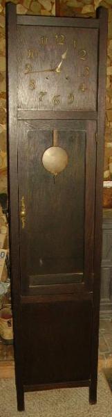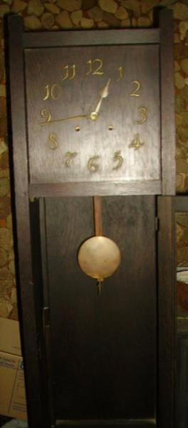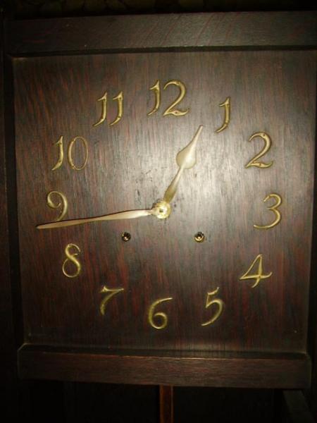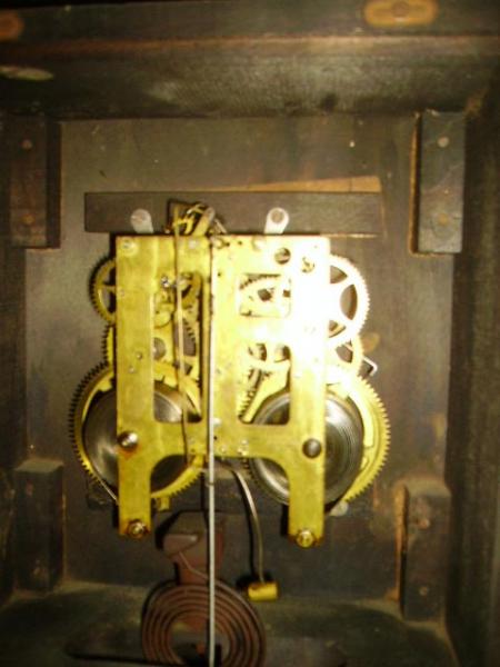The clockworks is marked,"1909 by the William Gilbert Clockworks"it has two seperate wind up springs,one for the clockworks the secong for the Gong which is a very pleasant tone Gonging on the half hour(1 Gong)and gonging the hour,IE, 4 for 4 AM or PM.