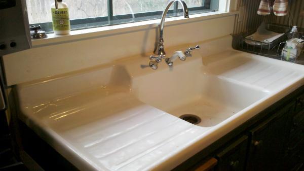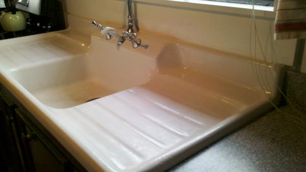 This sink is not in perfect condition but it looks pretty good. We want to know the value of a sink like this before the homeowner decides to take it out and update their kitchen to include a dishwasher.