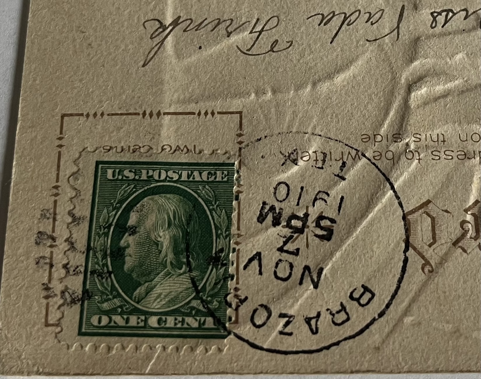 It was post marked November 7, 1910 with a ONE CENT green Benjamin Franklin stamp. The image on the stamp is easily visible and vibrant with perforations on all four sides. However, some of the perforations on the right side are thinned.