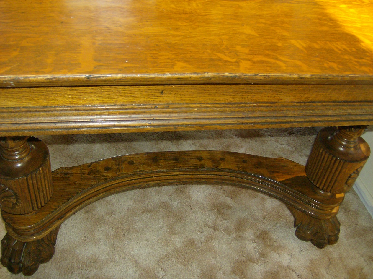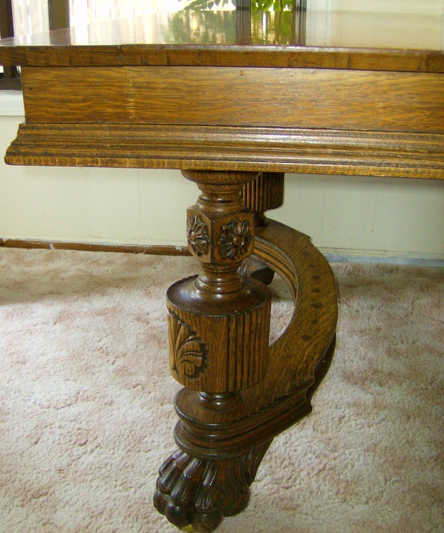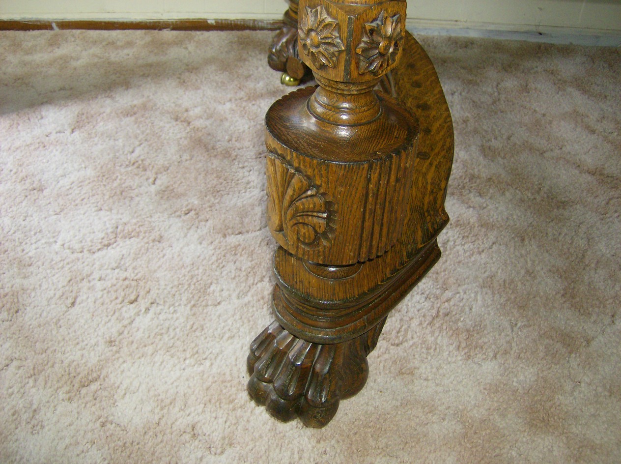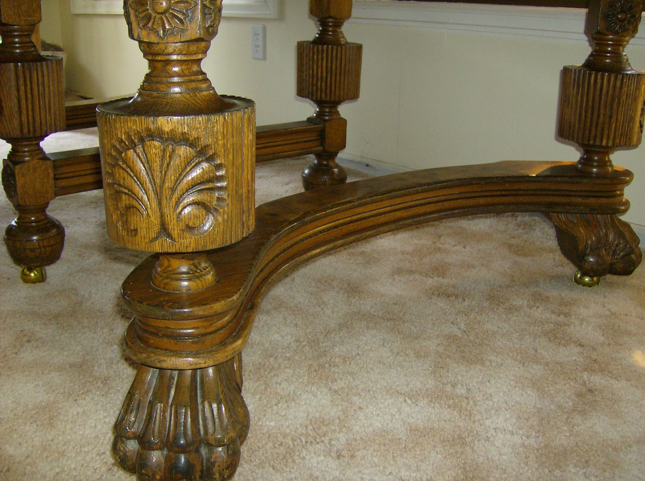 1910? huge lion paw feet, solid tiger oak? 50x50 table w/2 leafs (very fancy) thick wood,lots of design and scrolling...