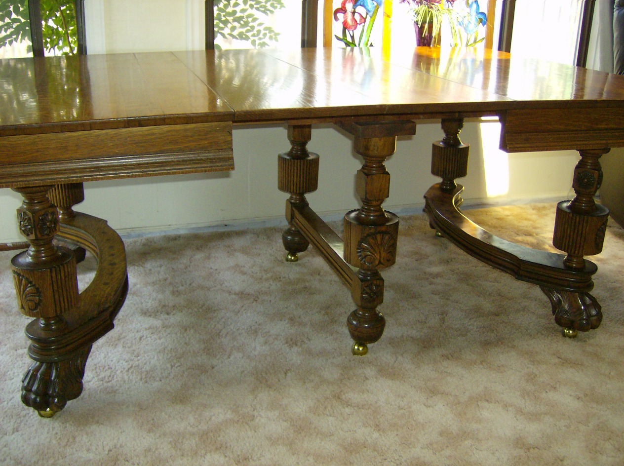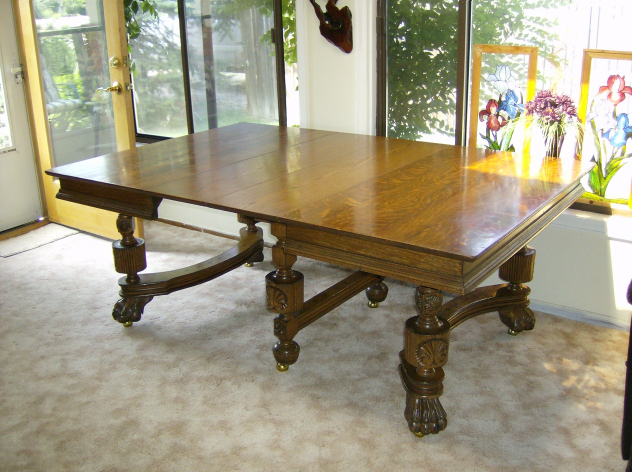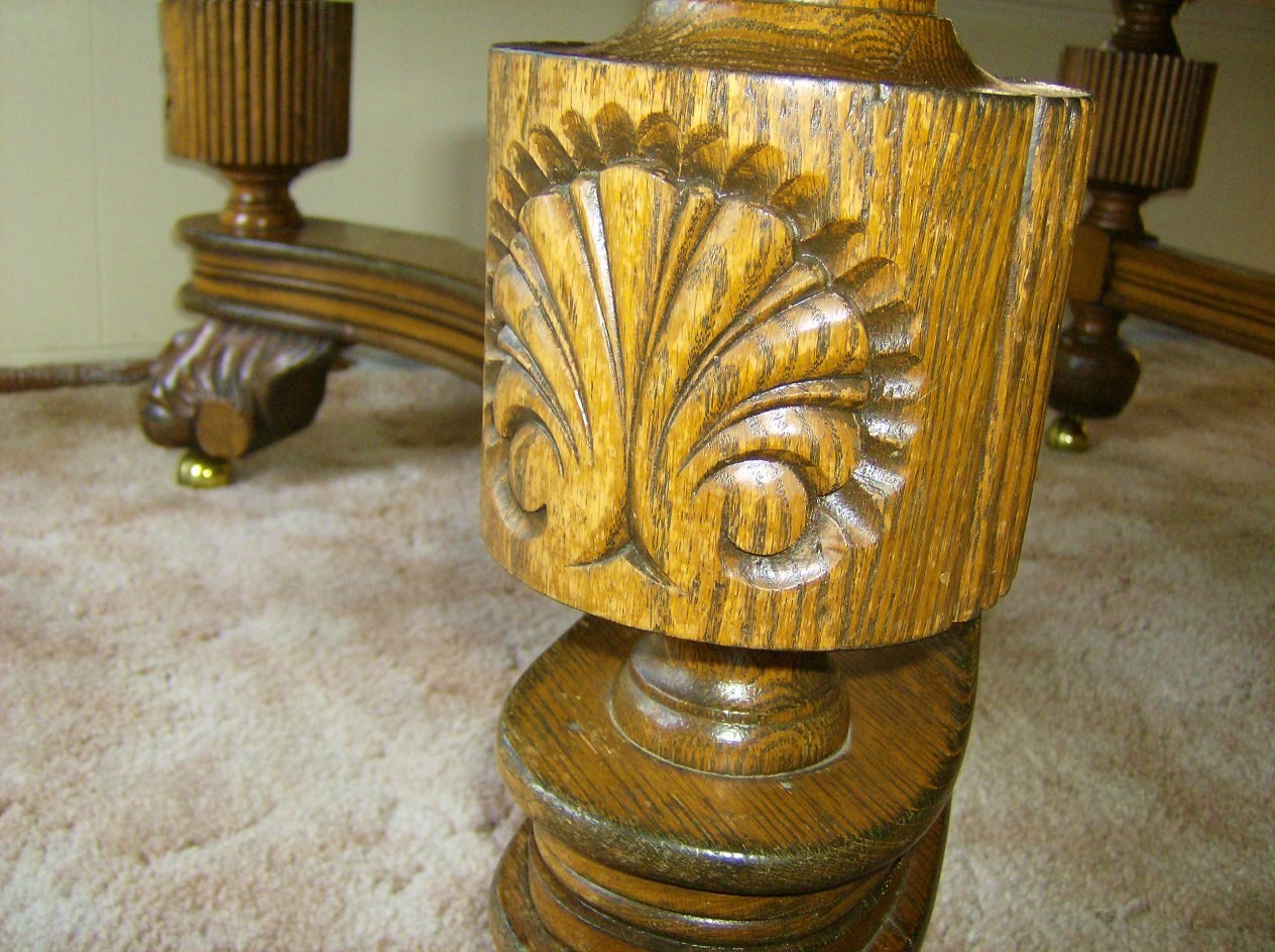 1910? huge lion paw feet, solid tiger oak? 50x50 table w/2 leafs (very fancy) thick wood,lots of design and scrolling...