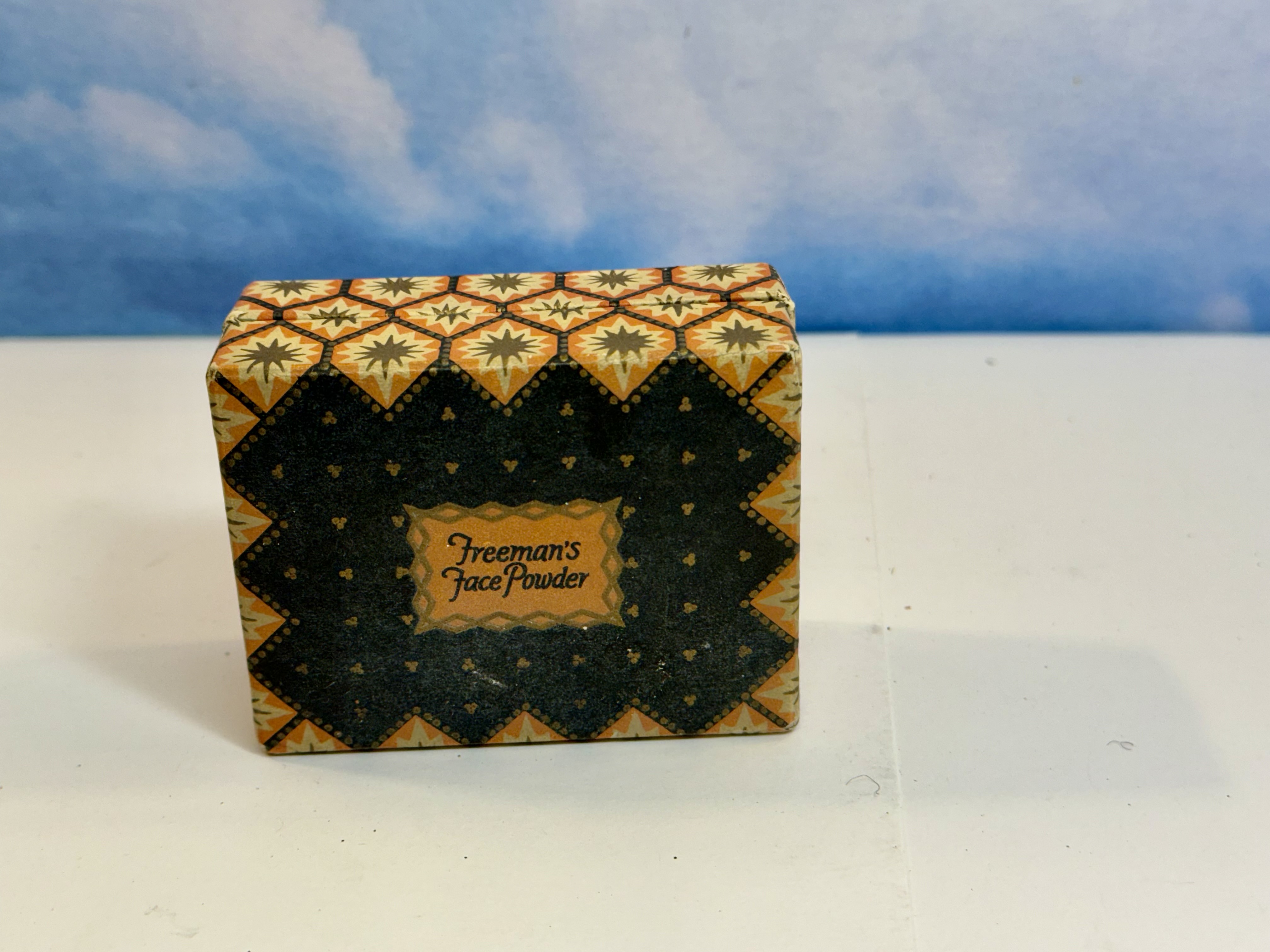 Physical Description: This item is a vintage face powder box, likely from the 1910s to 1920s, featuring a decorative design with geometric patterns in black, orange, and cream. The box is labeled "Freeman's Face Powder" and includes a guarantee statement regarding harmful substances. The interior of the box is lined with a faux leather material, and the powder itself appears to be intact and unopened. Dimensions are not provided, but the box appears to be of standard cosmetic size.