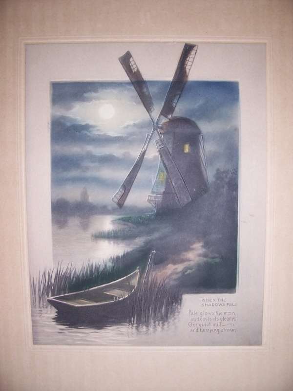The print is titled "When The Shadows Fall"...Pale glows the moon, and casts its gleam, O'er quiet mill and hurrying stream. There is wrting on the back of this print which says: $220.00/Hand painted quantine print/En. Included/Double tassel (which has lines drawn through it)/card silk/Ex. for printing/ the nuber 2806 is written on back.