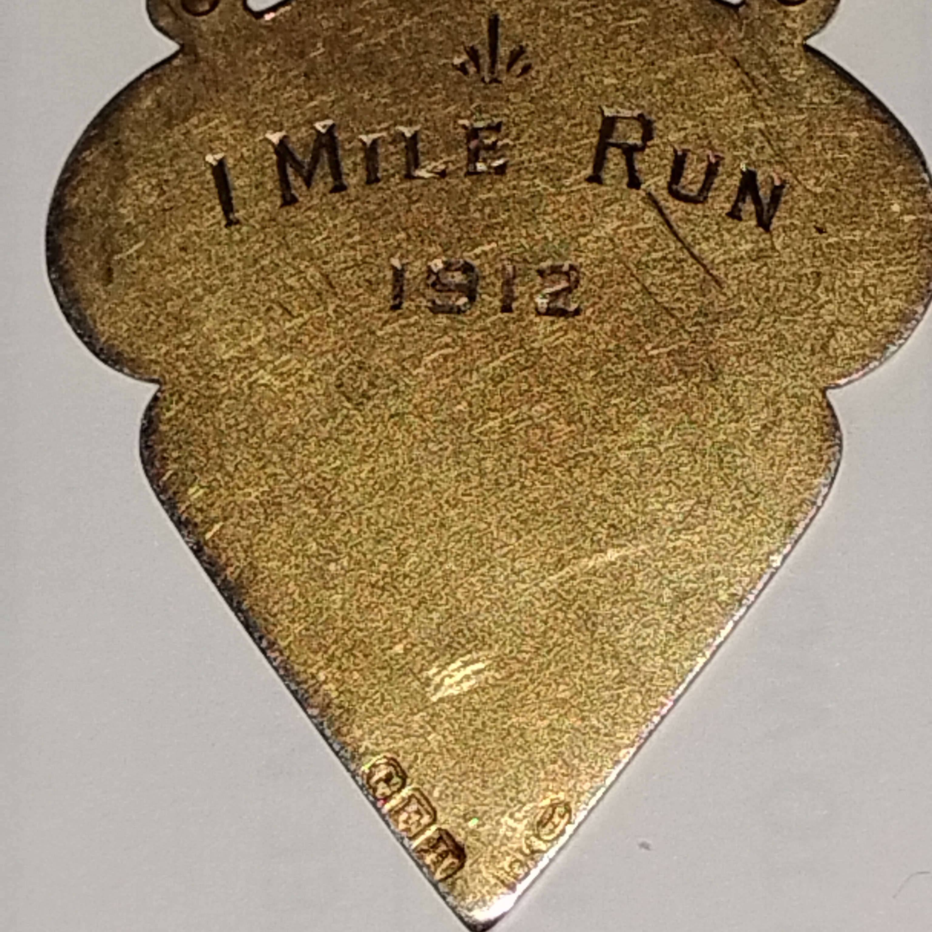 It appears to be a athletic medal of sorts, can't find any info on google. On the reverse it's ingraved "1912" "1 Mile run", also 3 square boxes containing the initials G.F.H, on the opposite side of the medal stamped 10k with a oval shape beside it containing 2 initials, to small to make out. Any info on this item would be helpful.