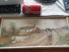 It looks like it was hand painted. The lamp itself is in good shape and works. The lamp shade isnt real bad but could be replaced.