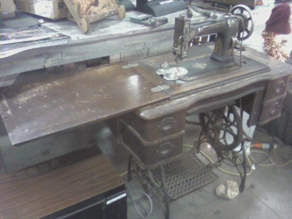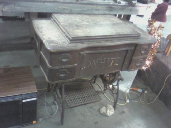 It's black with gold leafing? It's a treadle(non-electric). It's in working condition. It is in a nice dark wooden table of some kind, and has kind of wavy edges instead of straight. The legs look to be wrought iron, and it has "White" on the front when the table is folded closed. I can't give you a lot of detail about the serial # because it's still in OH, and I'm in FL. It has 4 drawers; 2 on either side. It still has the tin with the extra attachments, and a bunch of other things. I think it may still have the manual as well.