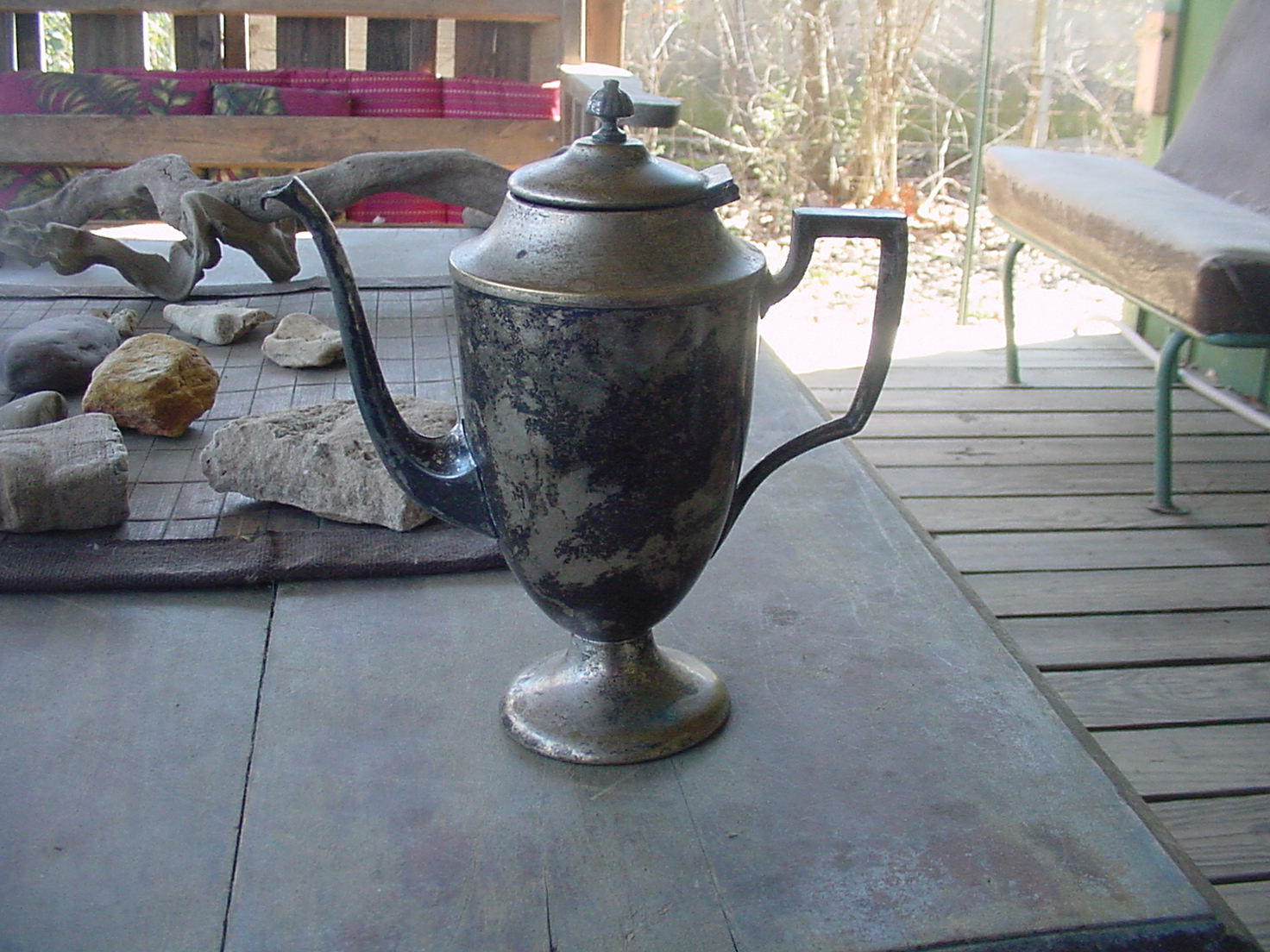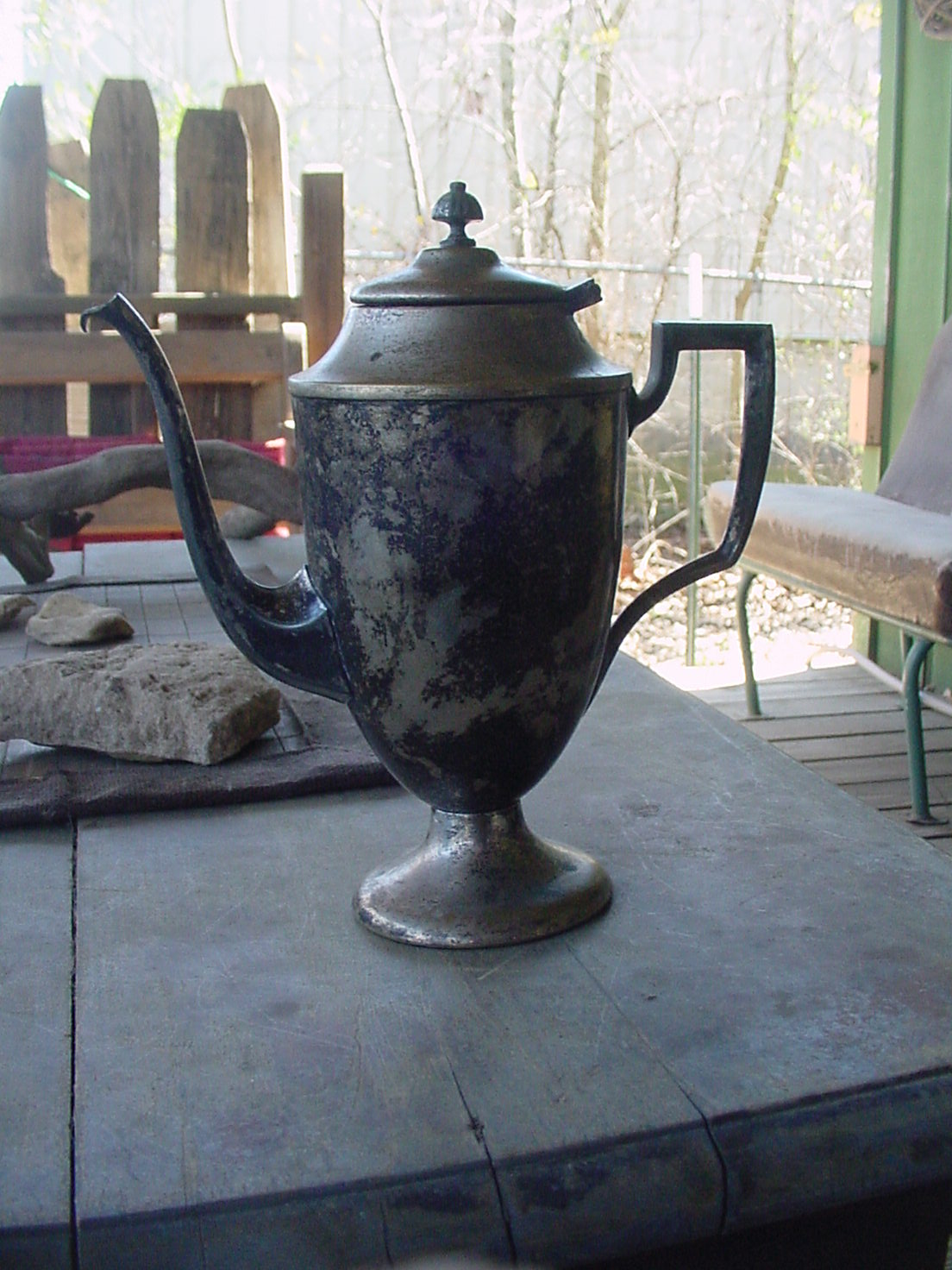 This is a wonderful old Sheffield silver/silver overlay teapot that I found at a little rural auction many years ago in north Arkansas.  I can't remembe what my winning bid was, but it wasn't much.  It is 8 3/4" high, and 7 1/2" wide from its handle to its' spout.   It looks grecian in design to me; I've searched online for its' origin, but haven't located anything like it. It must be a rather rare teapot, I'd guess. The top and base are silver overlay with brass underneath; the rest is silver.  I've posted two pictures of it taken on my deck.