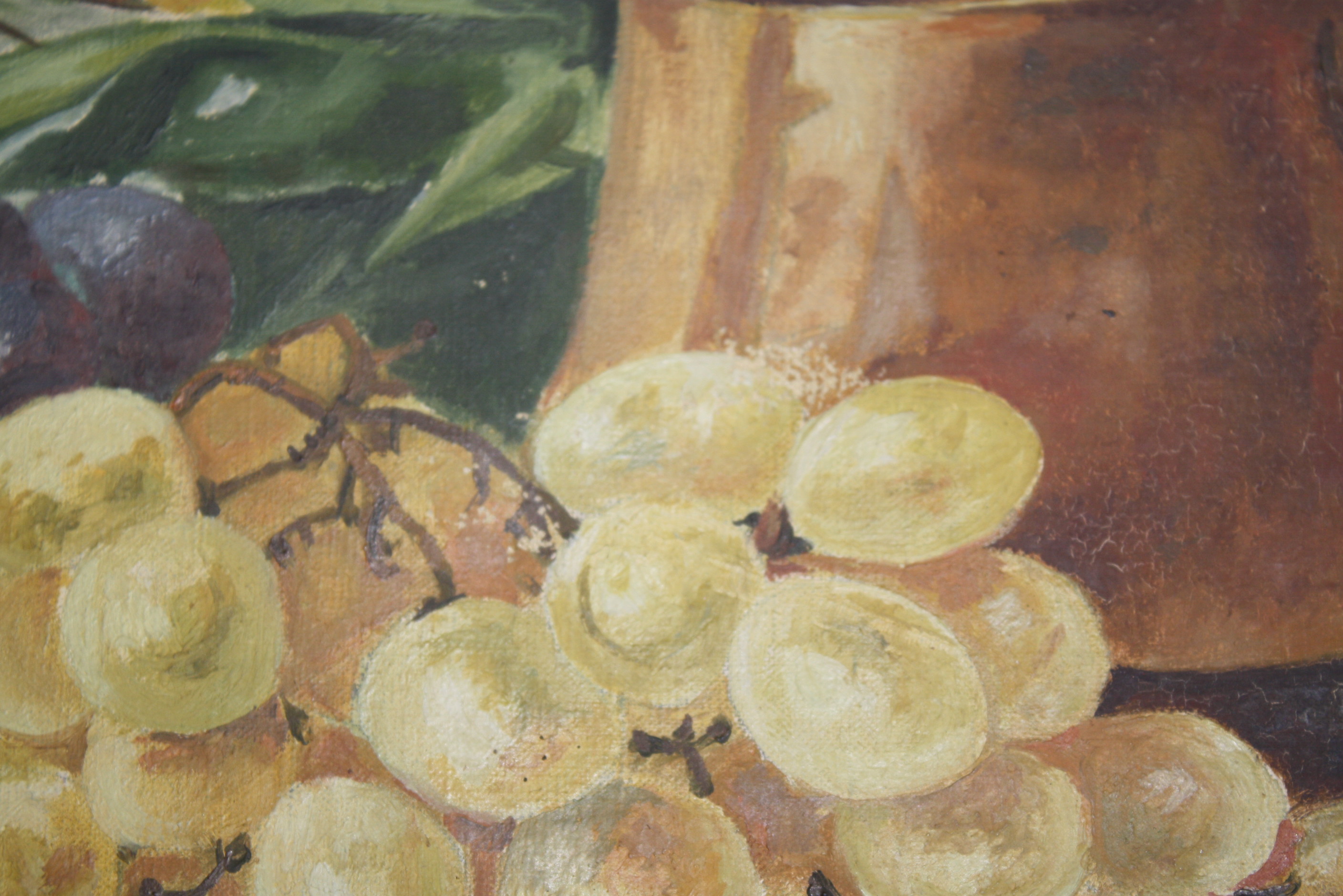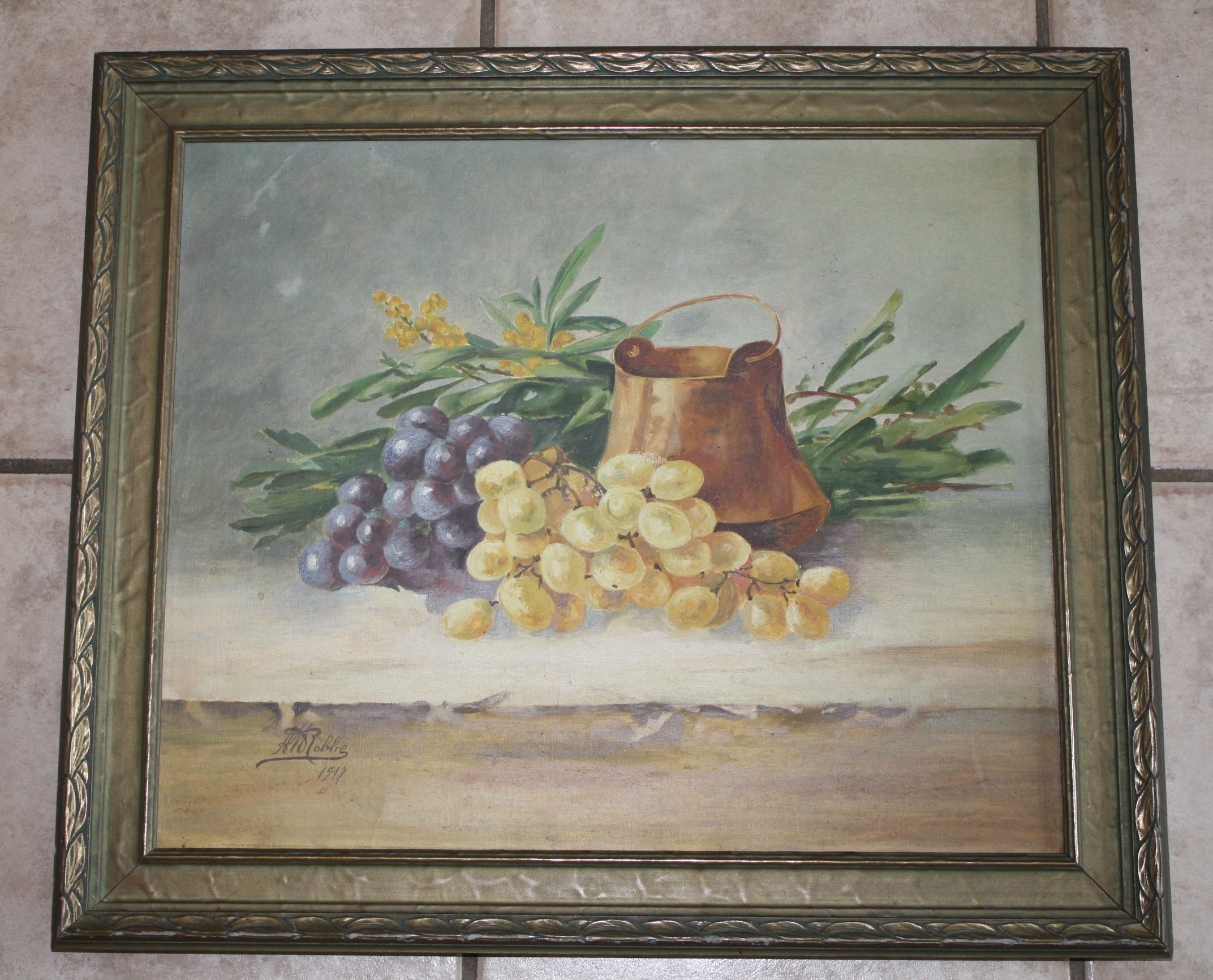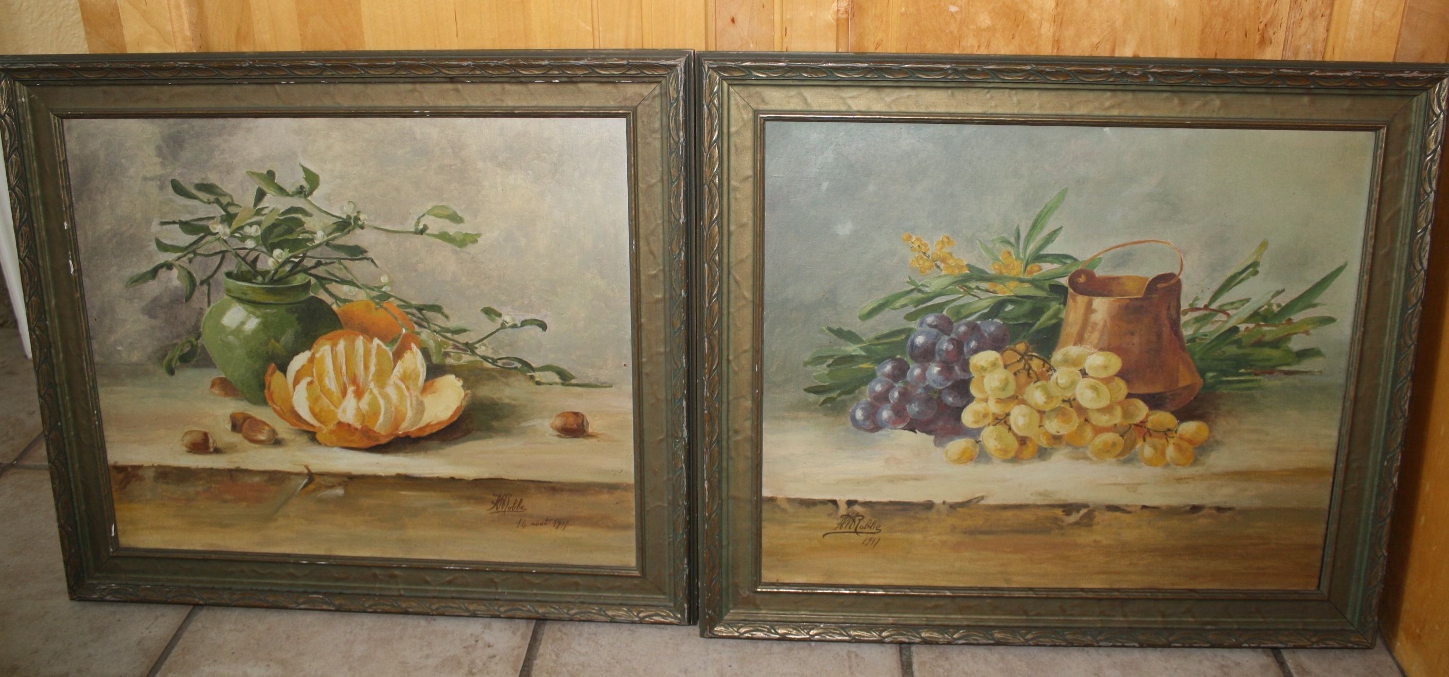 Two beautiful still paintings signed by what looks like "A M Robbe"? Not sure if that was an early signature of Manuel Robbe or not? Also signed "14 Aout 1917" which is August 14, 1917. I don't know enough about paintings to tell if these are oils, but the paint does have a slight texture to it and a bit of a sheen with some the colors when you tilt the painting to the side. The canvas seems old, as it has some stencil imprints on the back that say "fine" and the back of the canvas has an antique golden hue to it. One of the paintings has two small pin holes, one on each side of the painting, as if it had had another frame application at one point. One of the paintings has a small press point in the center as if it was stored on top of something. For the most part, you can just feel it a little bit and not see it. I believe these paintings were meant to be hung together and will be sold as a pair. These paintings would look lovely in a French Country kitchen.