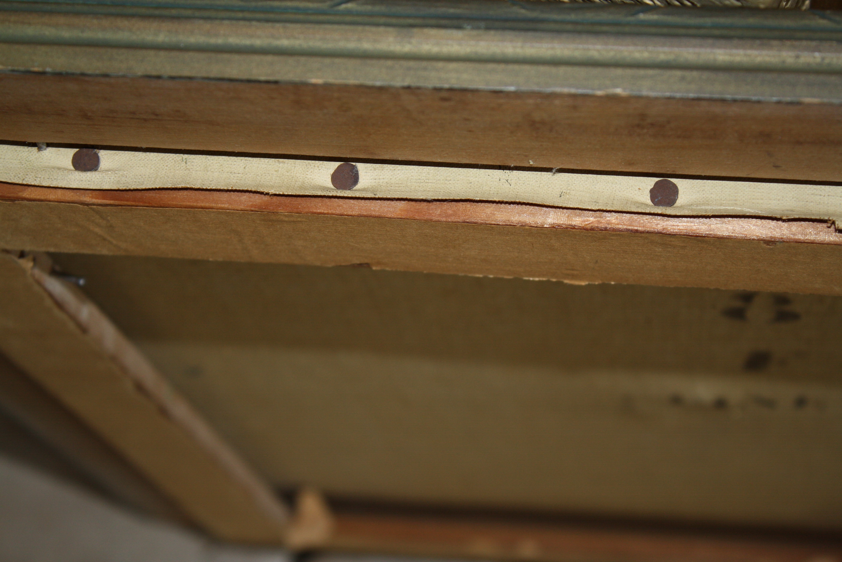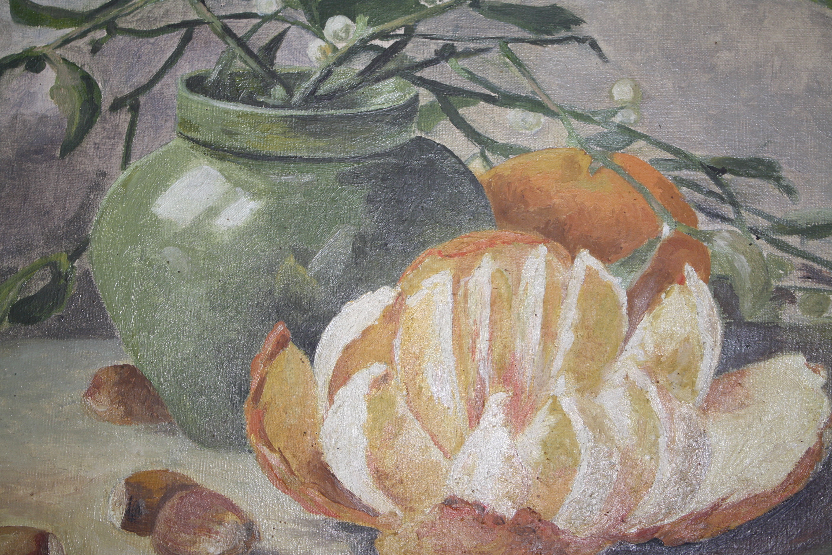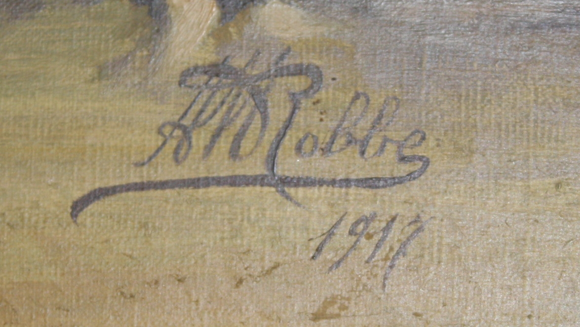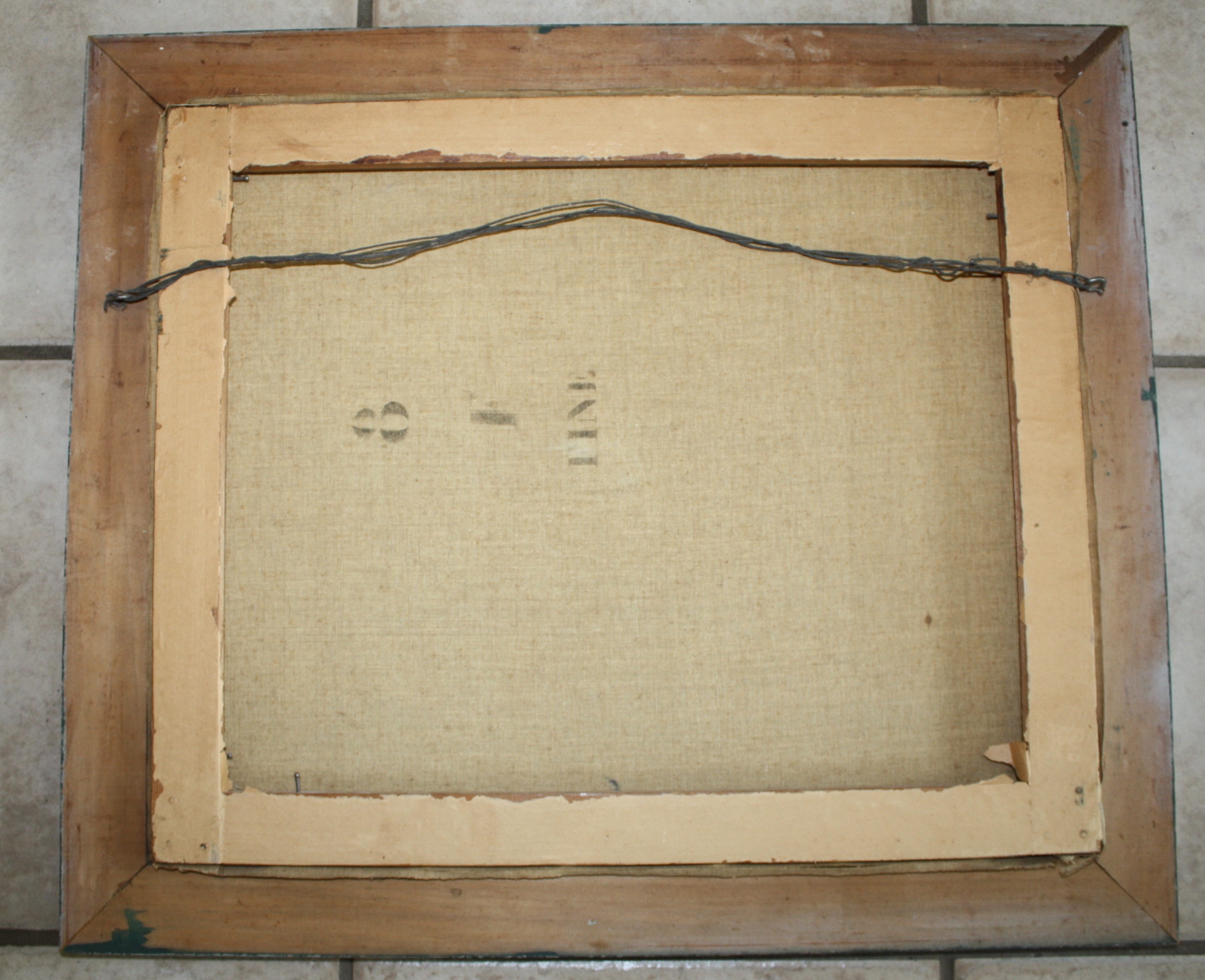 Two beautiful still paintings signed by what looks like "A M Robbe"? Not sure if that was an early signature of Manuel Robbe or not? Also signed "14 Aout 1917" which is August 14, 1917. I don't know enough about paintings to tell if these are oils, but the paint does have a slight texture to it and a bit of a sheen with some the colors when you tilt the painting to the side. The canvas seems old, as it has some stencil imprints on the back that say "fine" and the back of the canvas has an antique golden hue to it. One of the paintings has two small pin holes, one on each side of the painting, as if it had had another frame application at one point. One of the paintings has a small press point in the center as if it was stored on top of something. For the most part, you can just feel it a little bit and not see it. I believe these paintings were meant to be hung together and will be sold as a pair. These paintings would look lovely in a French Country kitchen.