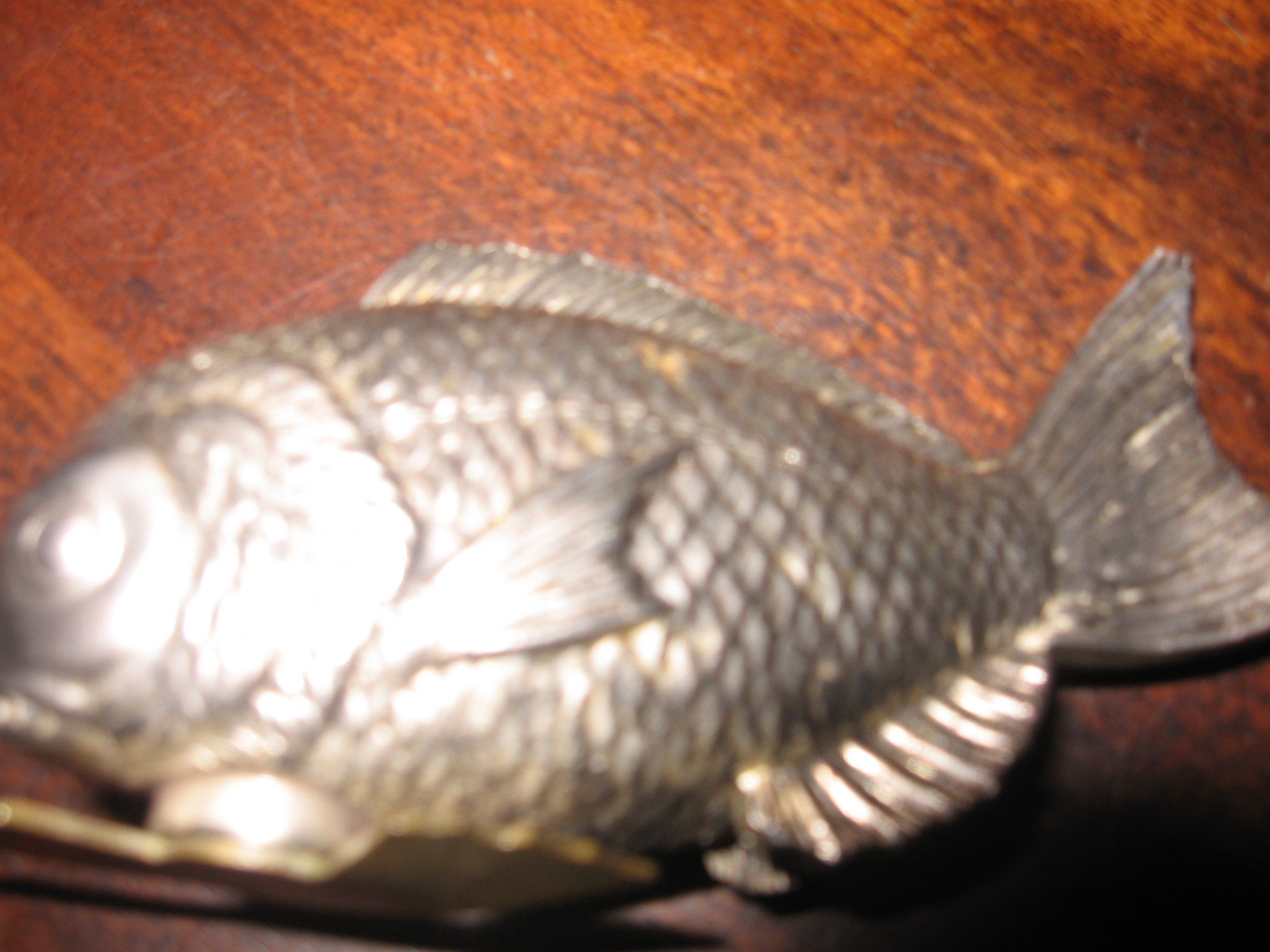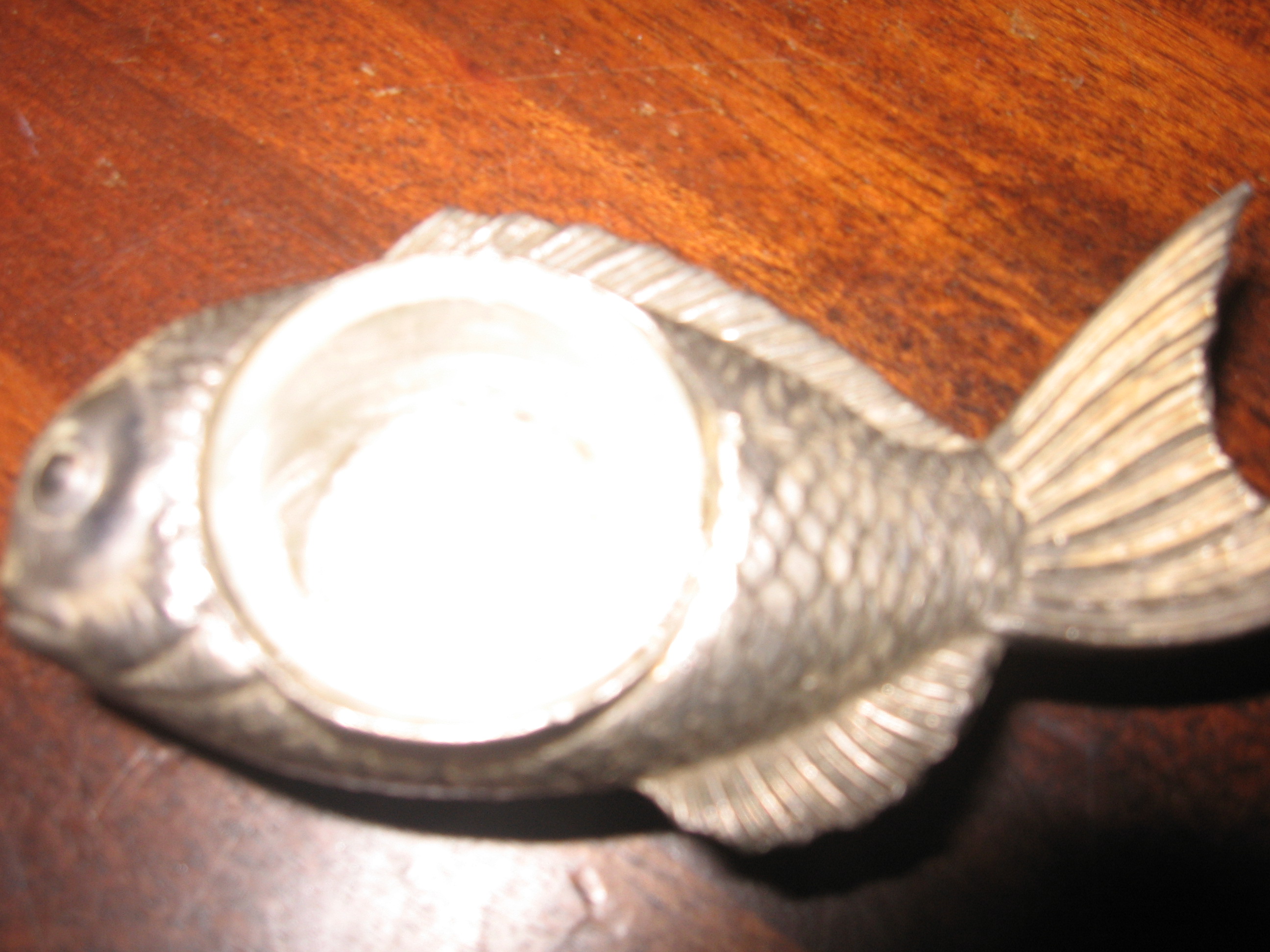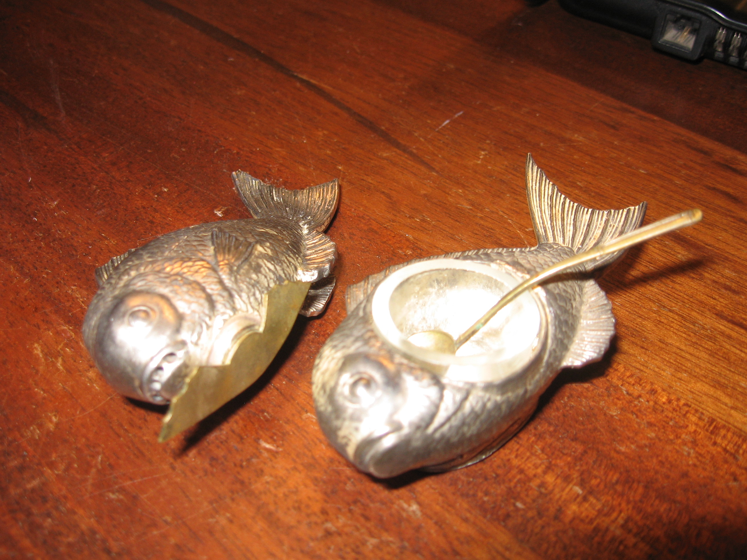 After researching the internet I discovered that these are what I believe is 1920 Japanese silver fish (sea bream) salt and pepper shakers or cellars. There are two fish in the set and a small tarnished silver spoon for the salt. They are in the original box and I do not think they have ever been used or at least there is no evidenced they have been used. On the back of the box is the name of the place it was purchased and the city and State (Camden, AR) There are also some type of initials written in pencil under the place it was purchased along with a sticker containing a number.