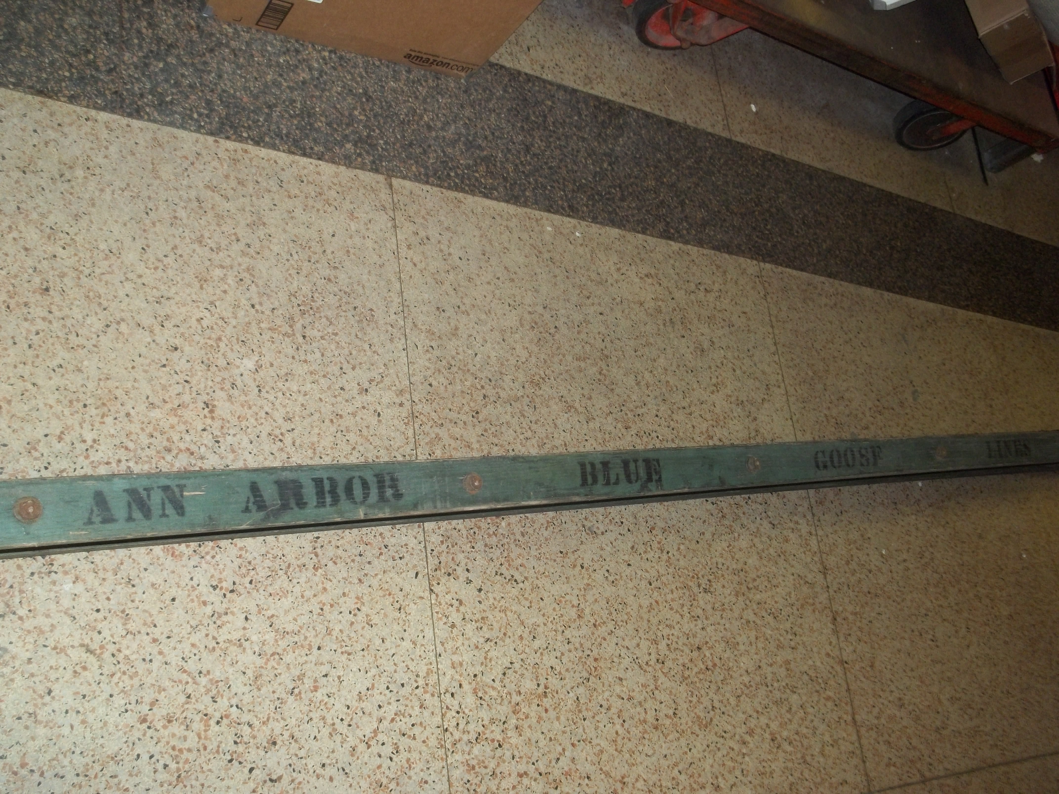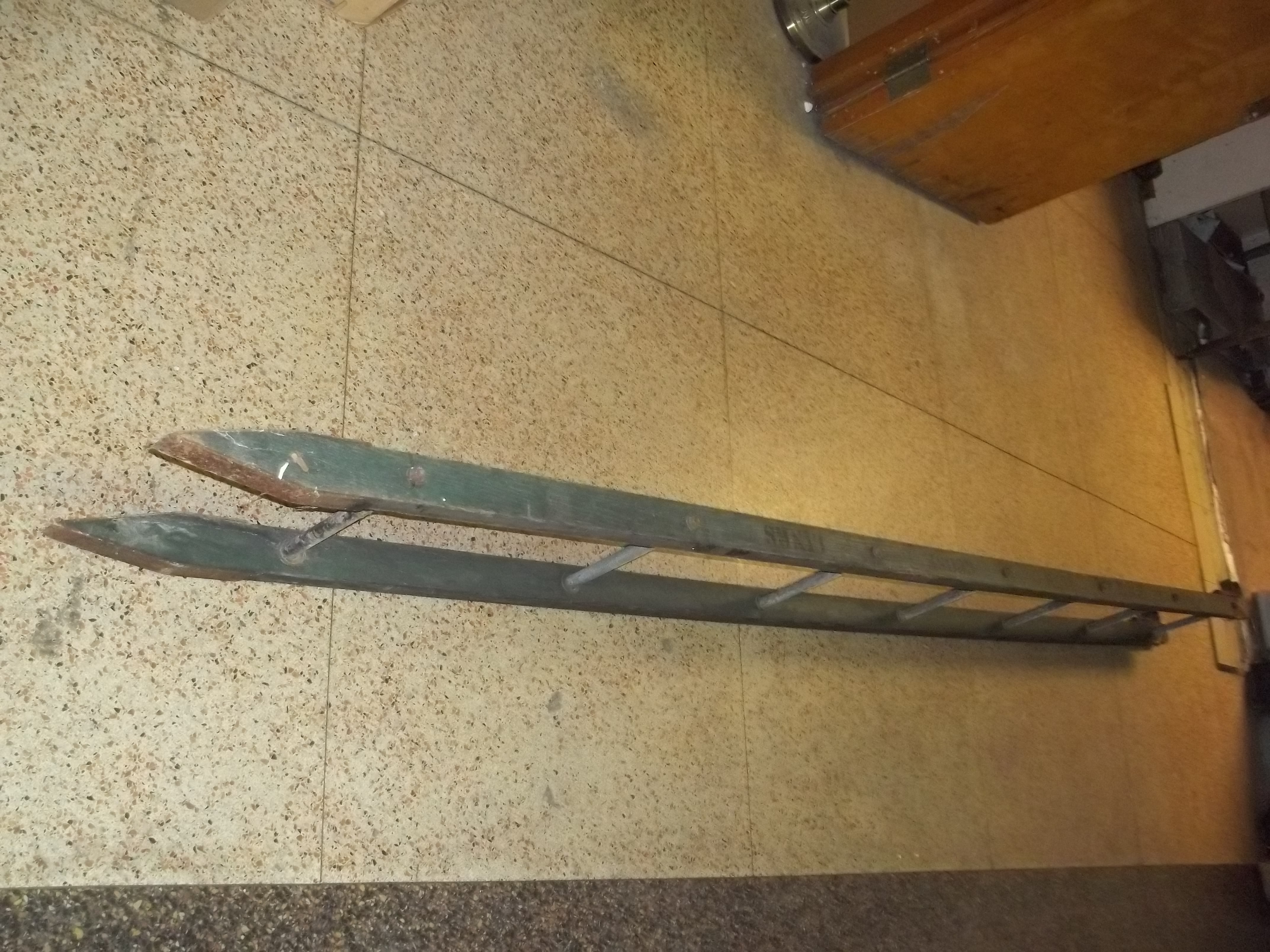 I believe this is from the 1920's to 1930's. Wooden ladder with metal rungs and metal hooks to attach itself to the luggage rack on top of a commercial motor coach. It has " ANN ARBOR BLUE GOOSE LINES " printed on one side. This ladder came out of the Ann Arbor Bus Depot in Ann Arbor, MI where this company stopped until I believe the early 1940's.