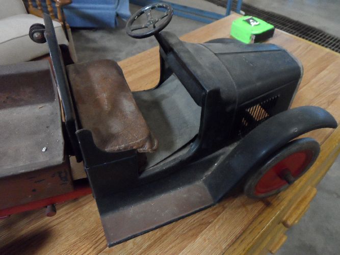 PRESSED STEEL, PAINTED, BAKED WITH TOPLESS CAB. HAND CRACK ON CHASSIS WINDS AND UNWINDES CORDS RUNNING UP TO PULLEY MOUNTED ON FRAME ABOVE AND BEHIND DRIVERS SEAT THIS OPERATES DUMP. STRONG MUSEUM, ROCHESTER NY HAS ONE CIRCUTE 1925. THIS ONE WAS GIVEN TO CARL CHRISTMAS 1922 AT FT LEAVENWORTH, KANSAS. THIS INFORMATION ALL CAME OFF A CARD THAT IS INCLUDED WITH THE TRUCK. ...I am thinking of buying this truck from an auction and would like to know the true value of it. Currently it is at $90.00. Should I purchase it?