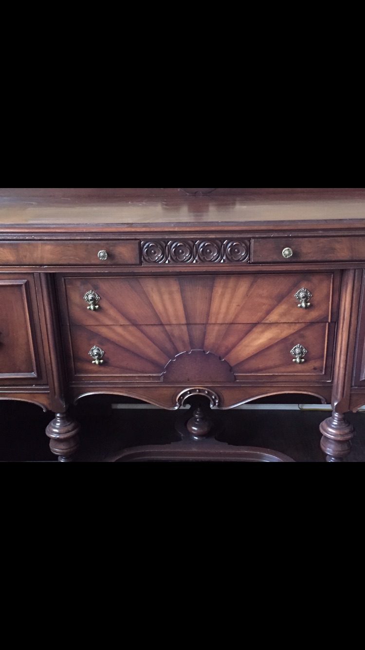 This is a beautiful antique buffet with a sunbeam inlaid in the front.