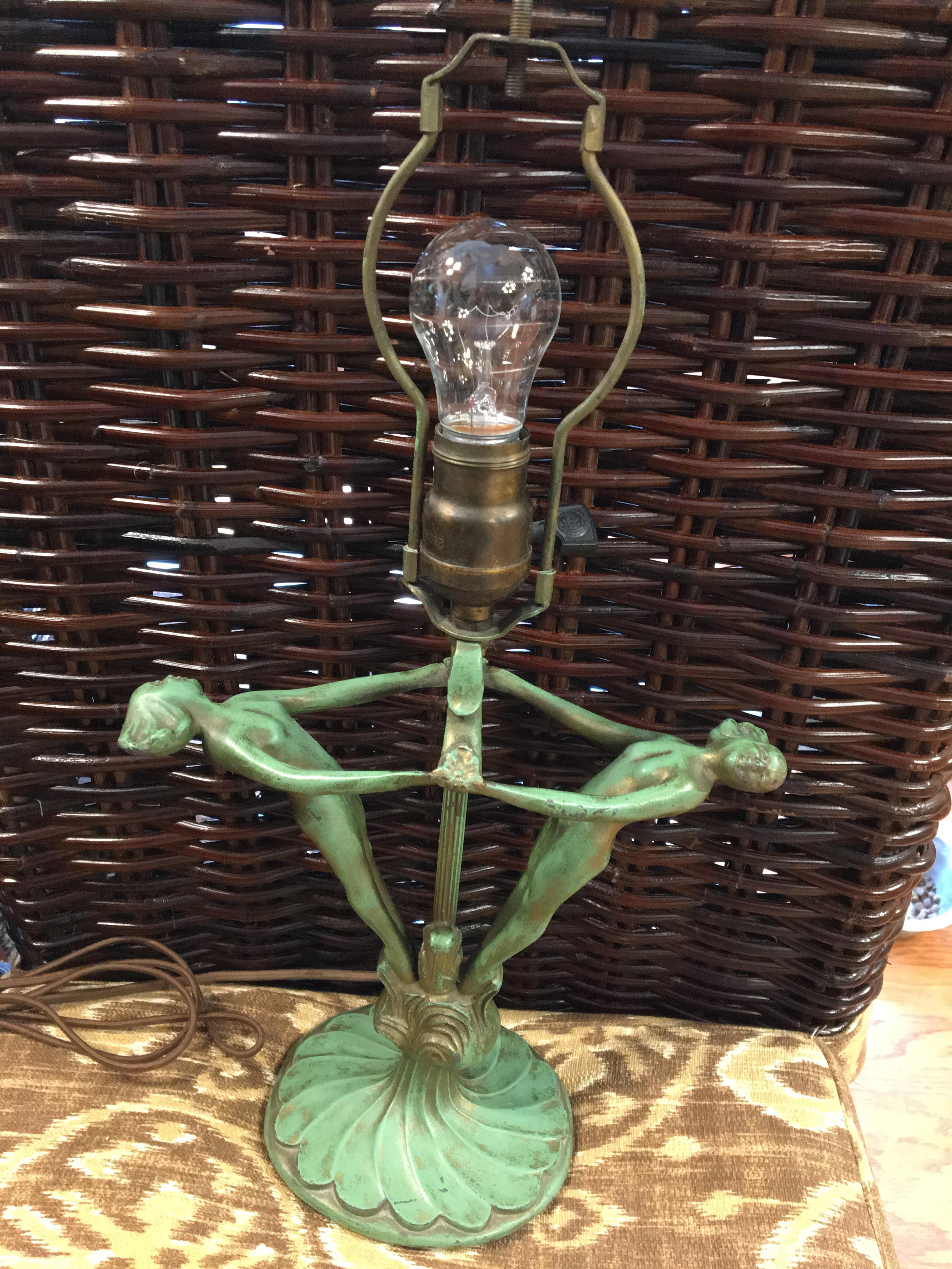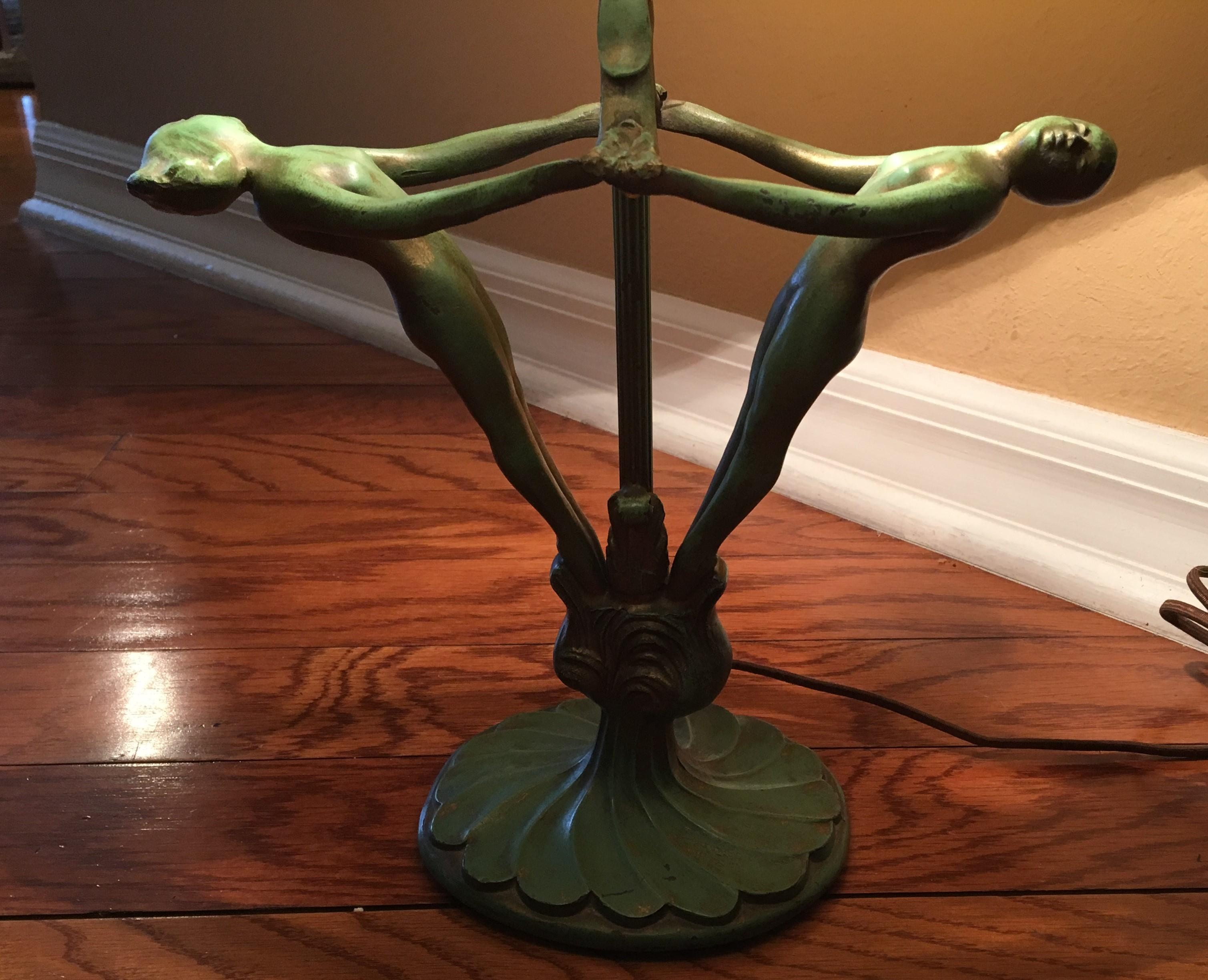 I purchased this lamp 20 years ago from an antique dealer and paid $500 for it. There are no markings. On the bulb fitting, it is marked Hubbell. The shade is very heavy and is a thick glass. The nudes are painted a green color with gold. The lamp is in very good condition. The finial has been broken and glued back together. The lamp has been rewired.