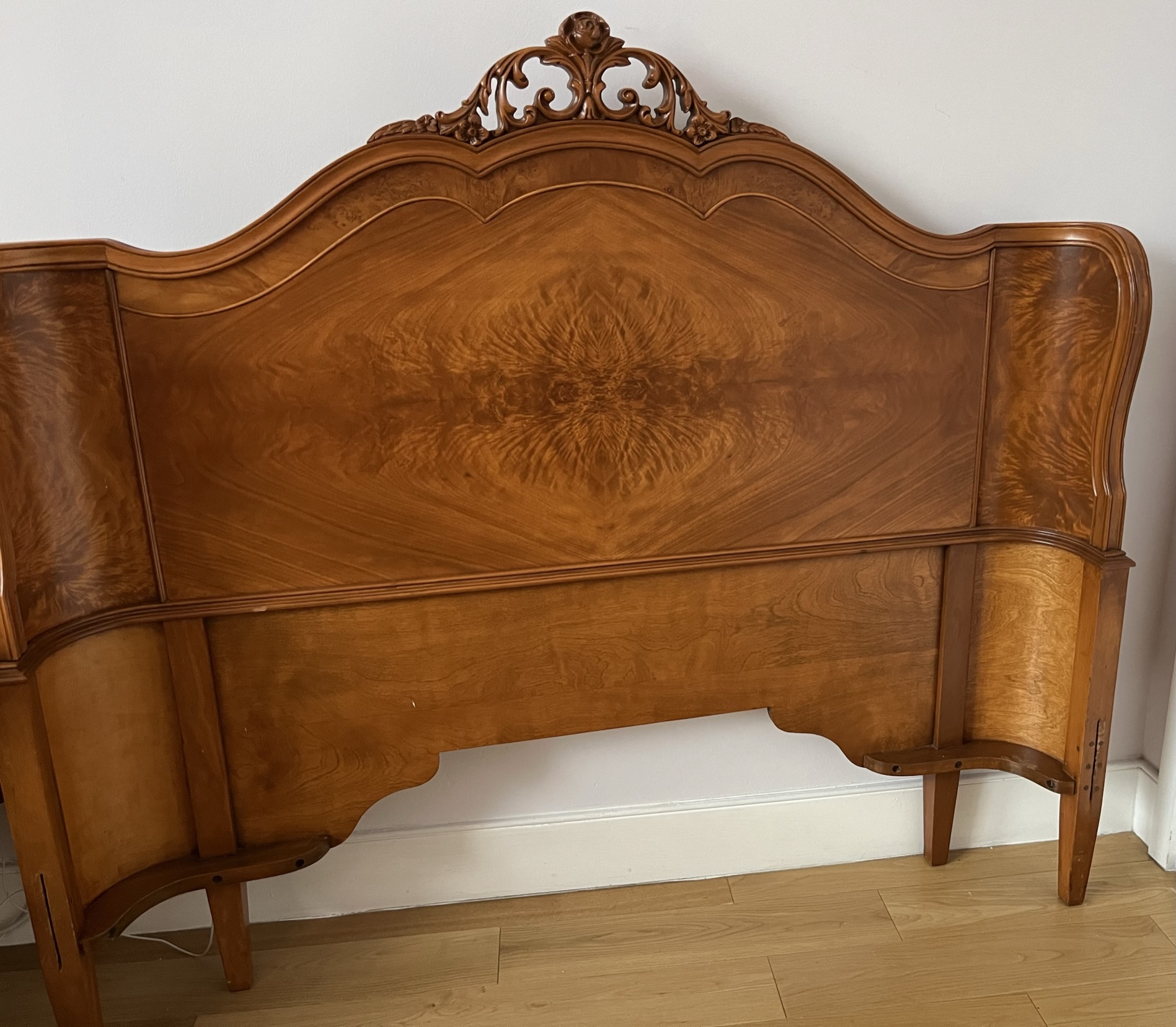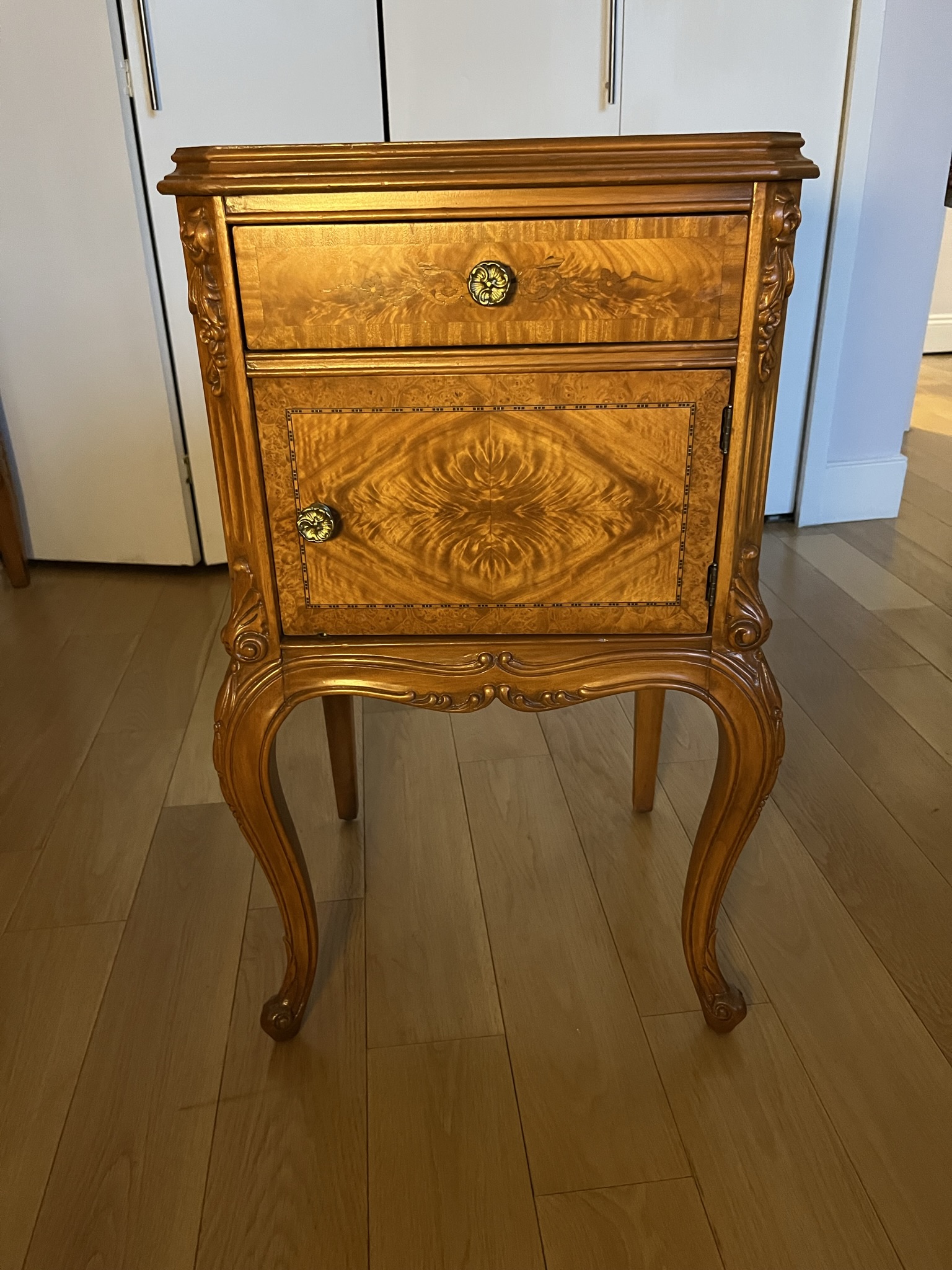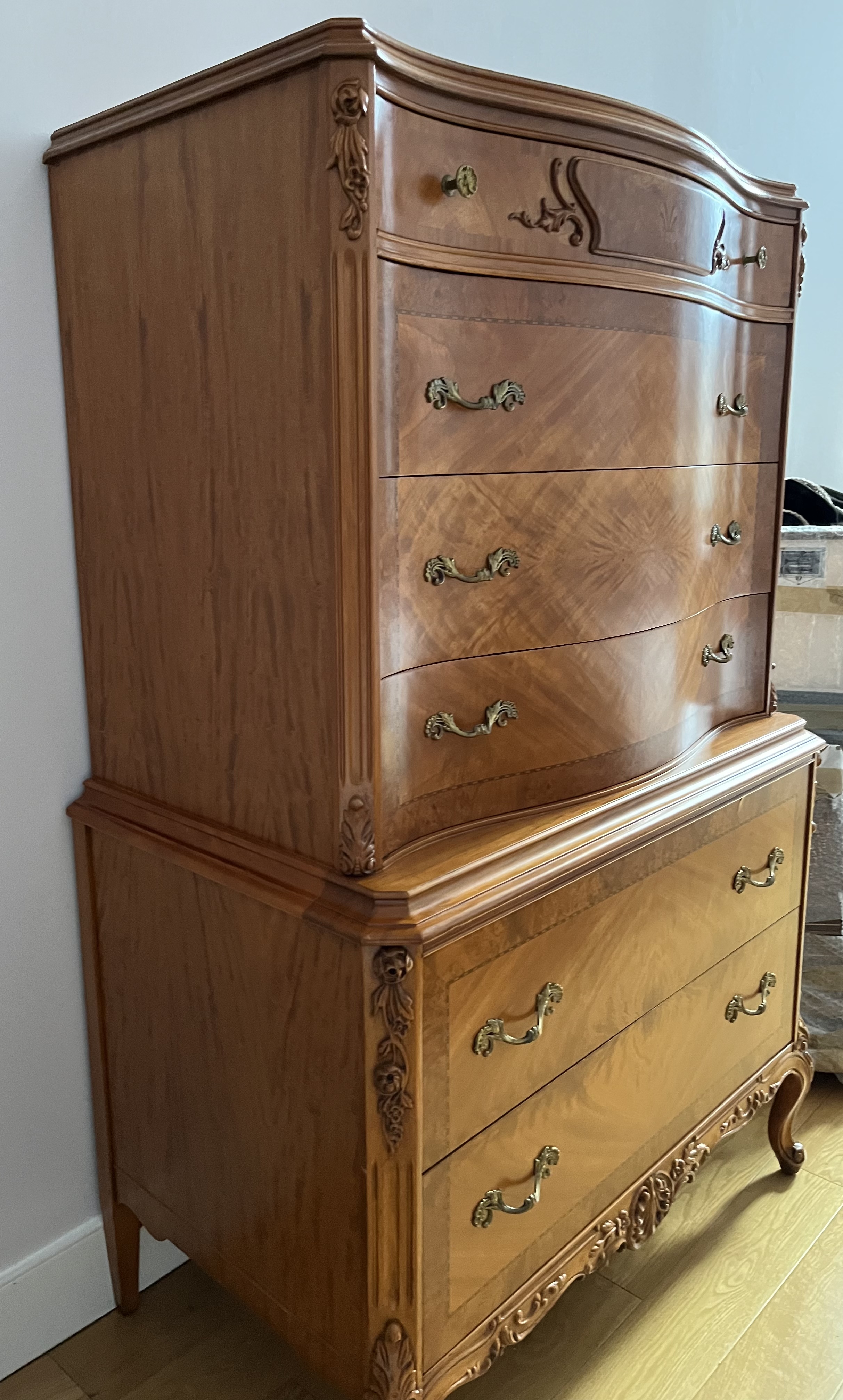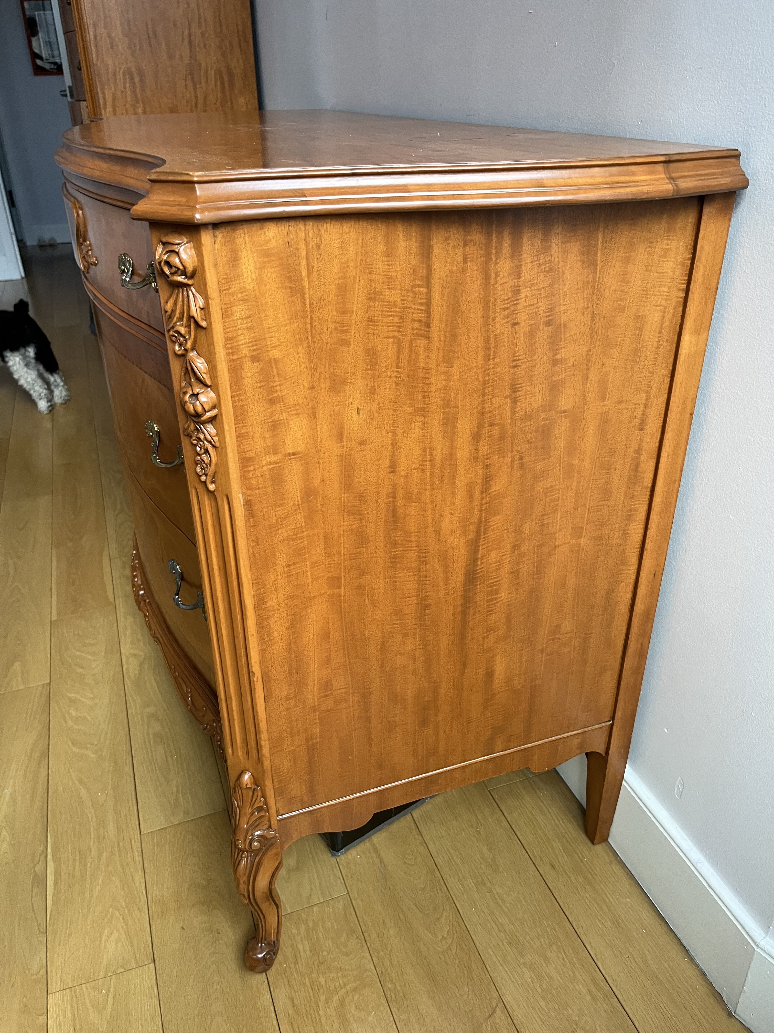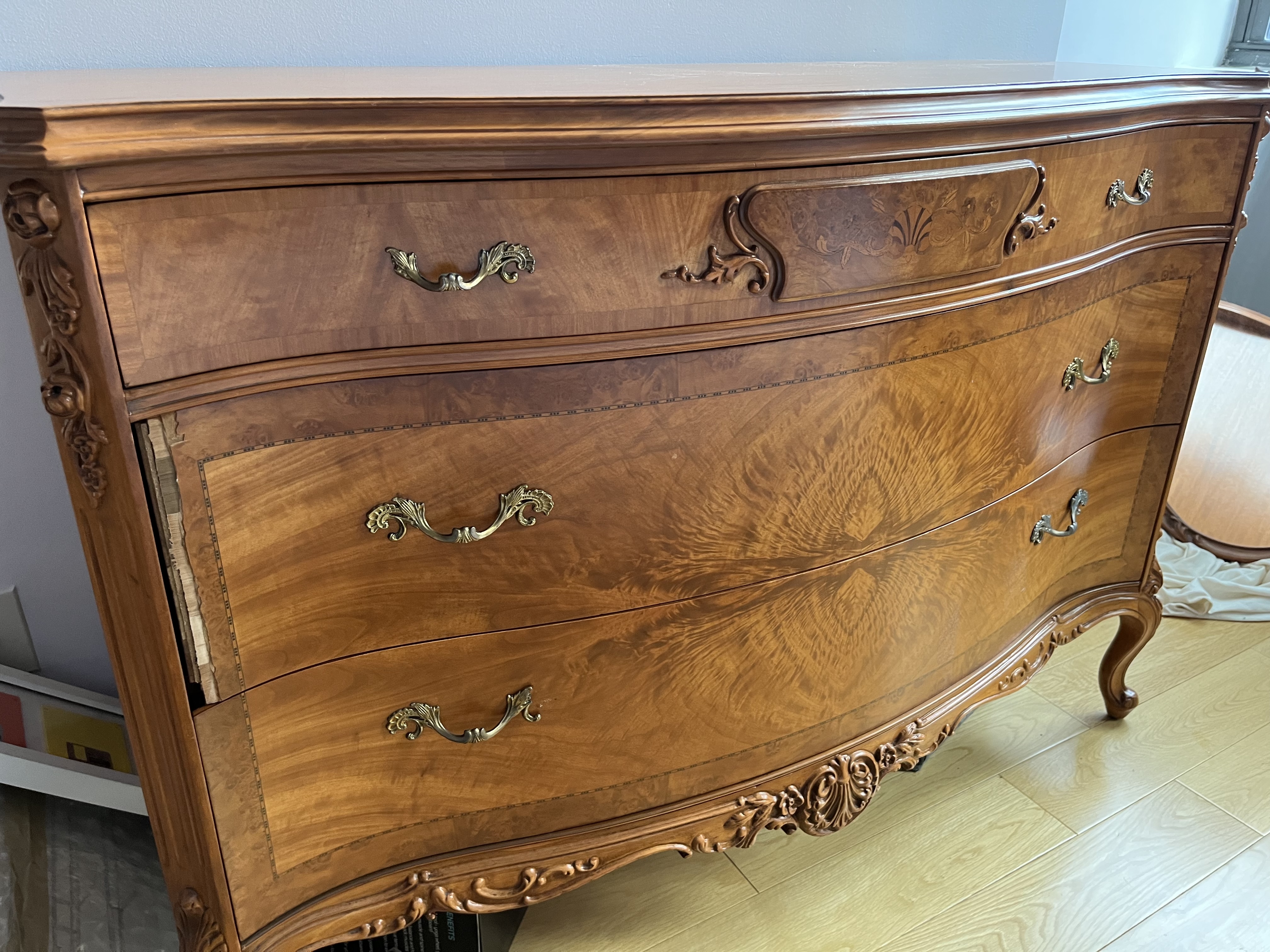 In very good condition except for one drawer on low boy with cracked wood at the edge (I have the piece that cracked off, in case it can be used to repair)