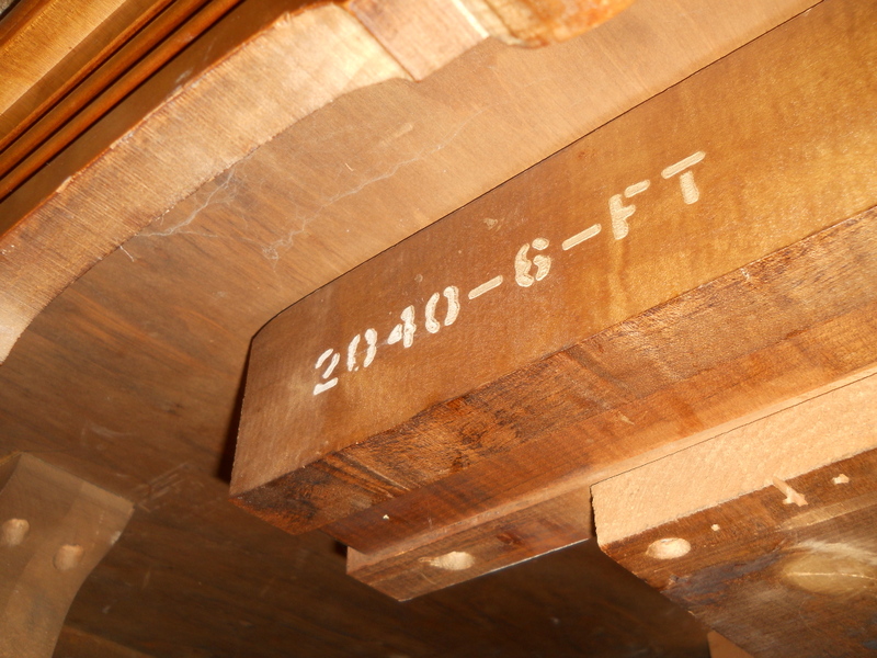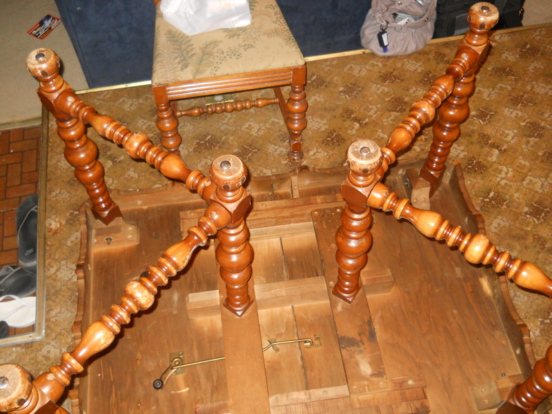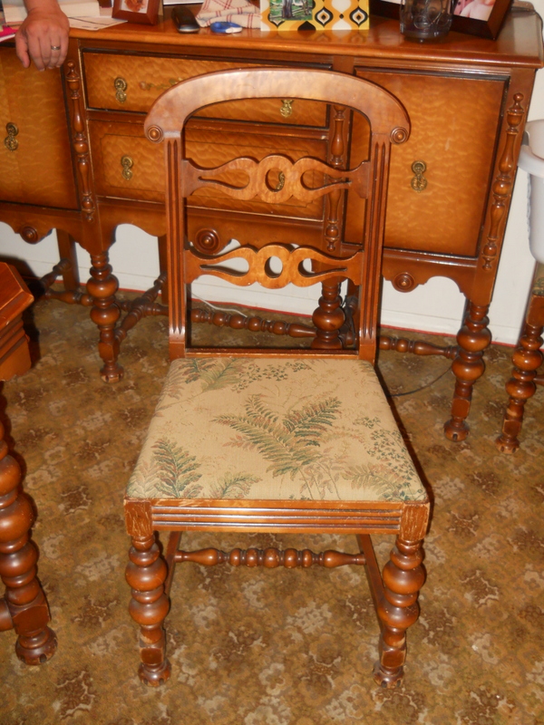 This table was bought by my wifes great grandparents in the early 1920s. It is a complete table set with two leaves and four chairs all made from complete birdseye maple. the legs are pinnacle legs. We are pretty sure it was bought in Utah but not sure of the city, and we have no idea how much they paid for them. Unfortunately there are no distiguishing makers marks that we have been able to find, however we have found a "branded" number in each piece (table and all four chairs). Please excuse the cobwebs under the table. My wife always forget to clean under there! The table is sound and fully functional, with only surface scratches on the finish. It shouldn't be too difficult to repair them. The upholstery on all four chairs is the original, but they can be reupholstered, if one chose to do so.