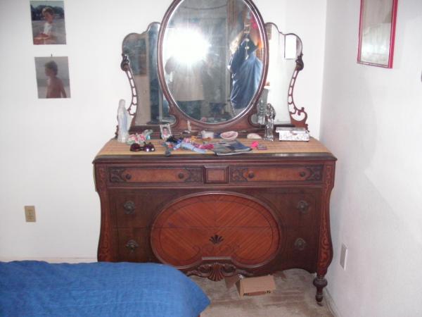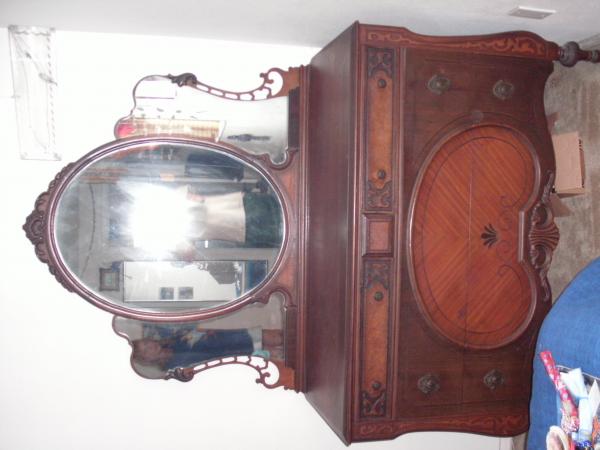 Bedroom set 1920's solid carved wood. dresser 2 drawers on top and 2 deep drawers with mirror. Has 2 matching headboards and foot board for beds. 2 chairs solid wood carved claw feet on front 1920's