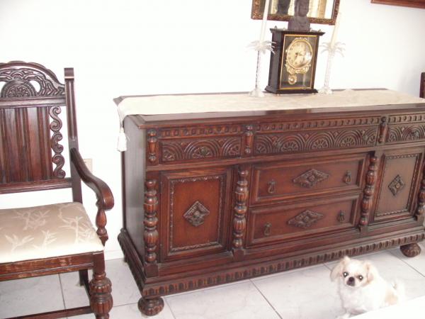Dinning room set.Solid carved wood circa 1920's. Table has leaf on each end to pull out for seating 6. 6 chairs, 1 with arms. Buffet 3 drawers across, 2 large in middle, cabinet on each side. The table matches the hutch