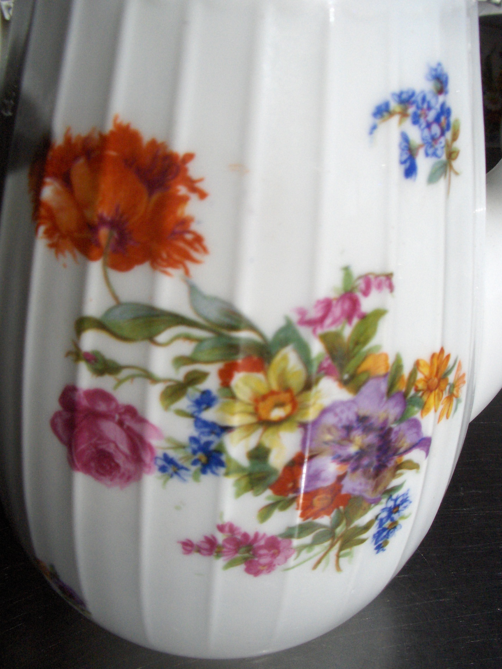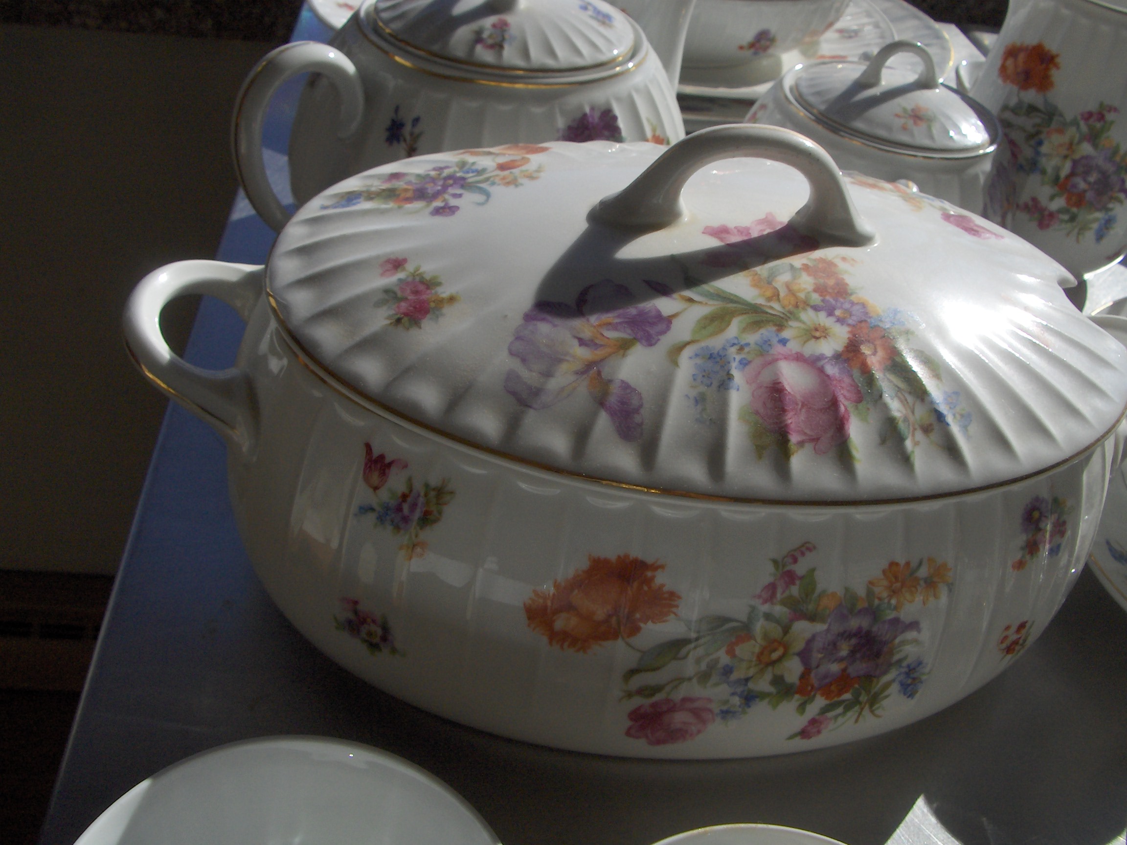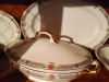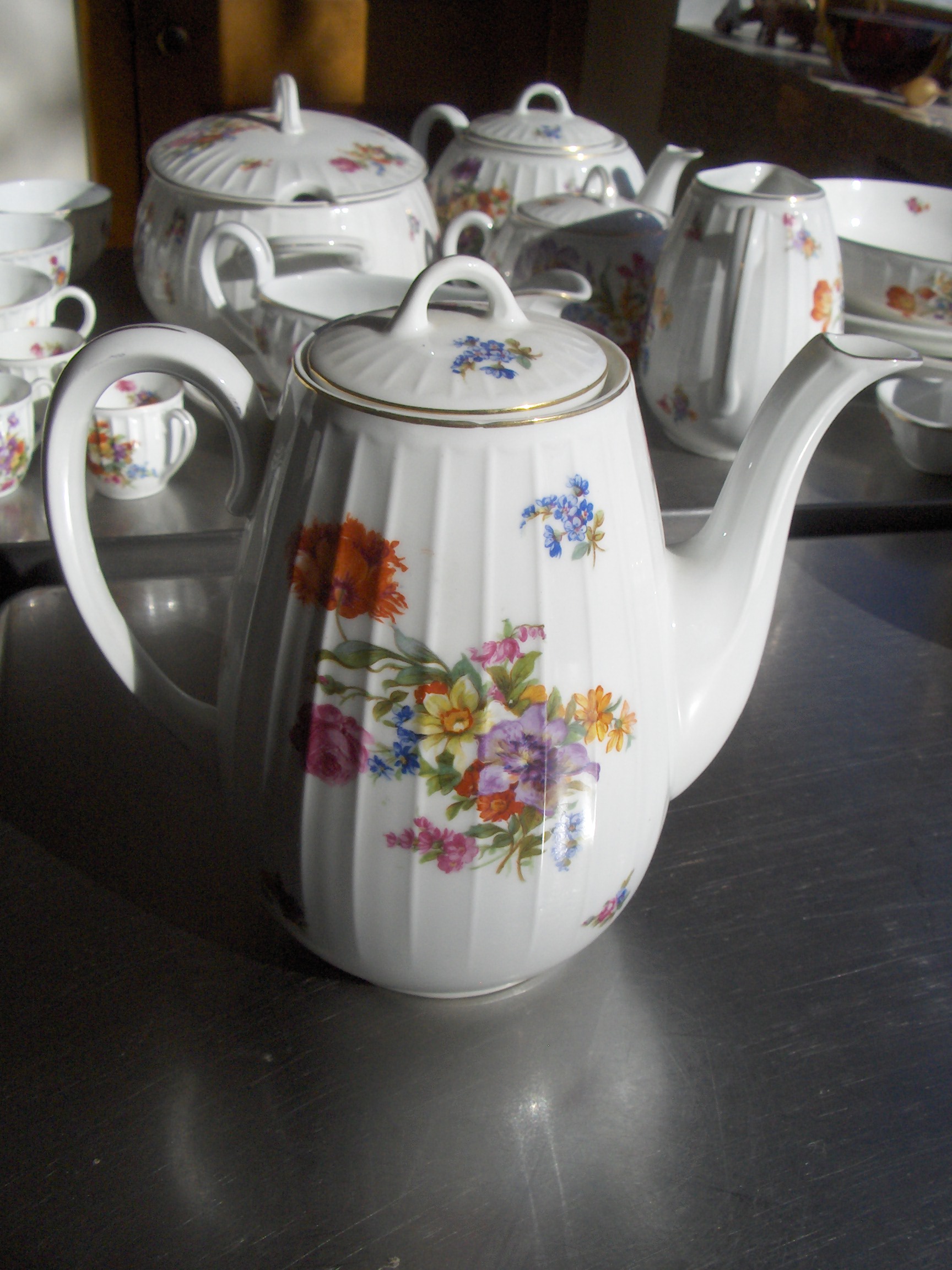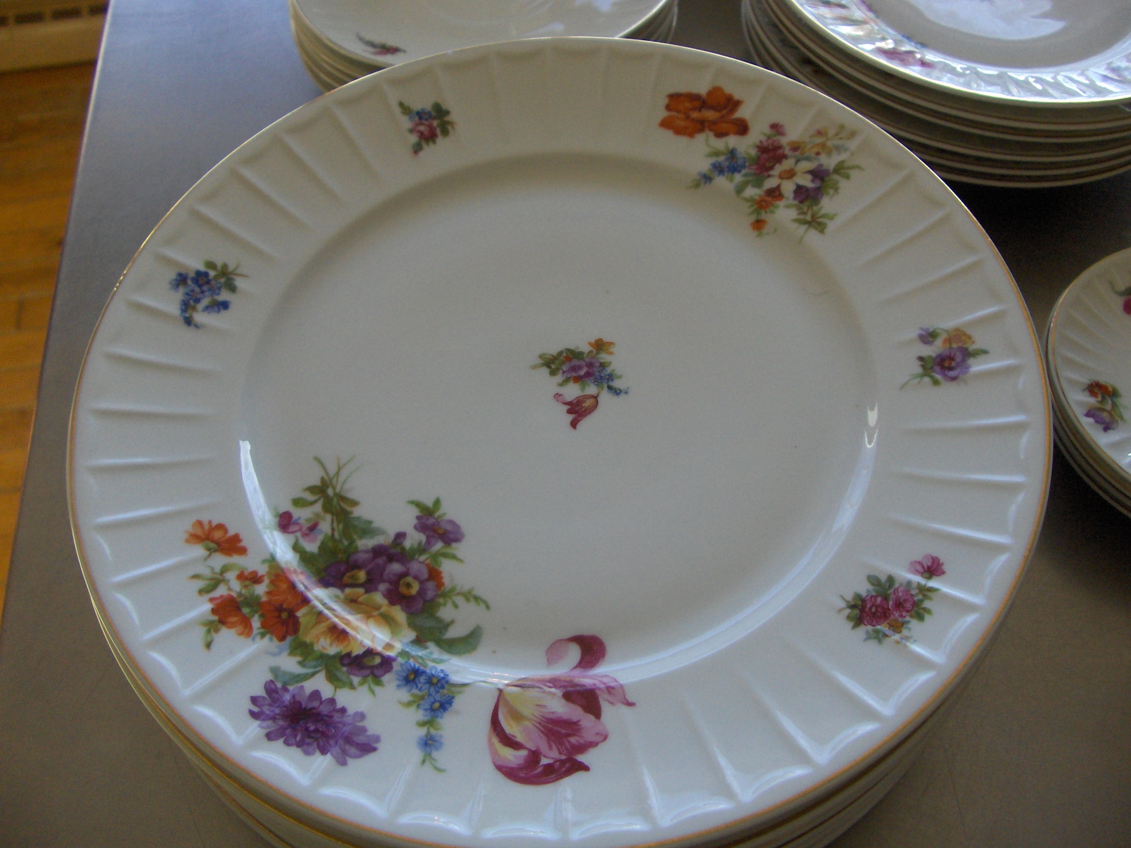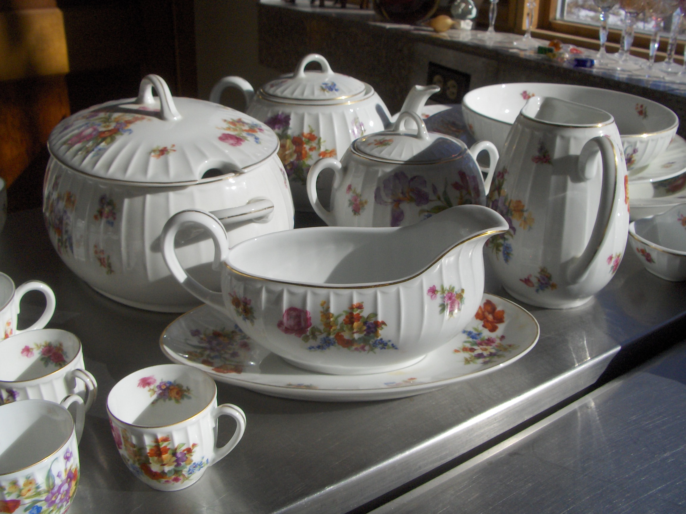 This set has been in my family ,even through world war 2, my family is Austrian. The original set had settings for 6, a few pieces have been broken, leaving the set of four complete with a few spare dishes, etc. The serving pieces are in mint condition and include a tureen, gravy boat/dish,large oval platter,large round platter, large round bowl,, creamer,sugar dish,coffee server and tea pot.The s&p pinch pot dish has a flea bite on the base. The set of four is in mint condition, includes plate,salad/desert plate, soup bowl,coffee/tea cups and saucers and the espresso cups/saucers. The hand-painted pattern has a few variations but matches as a set.Translucent when held to the light, very lovely. The items are all ribbed. The Soup Tureen is 12 1/2"x7",platter 5 1/2"x11 1/4",round 11 3/8'' and serving bowl 8 7/8". The edges are gold.The bottom mark has the Czech arm w/ a short sword being held and a variety of numbers in gold or red or br/red. The Rasper &Sohne appears to be the place where it was sold in Vienna with the address I,Graben15.