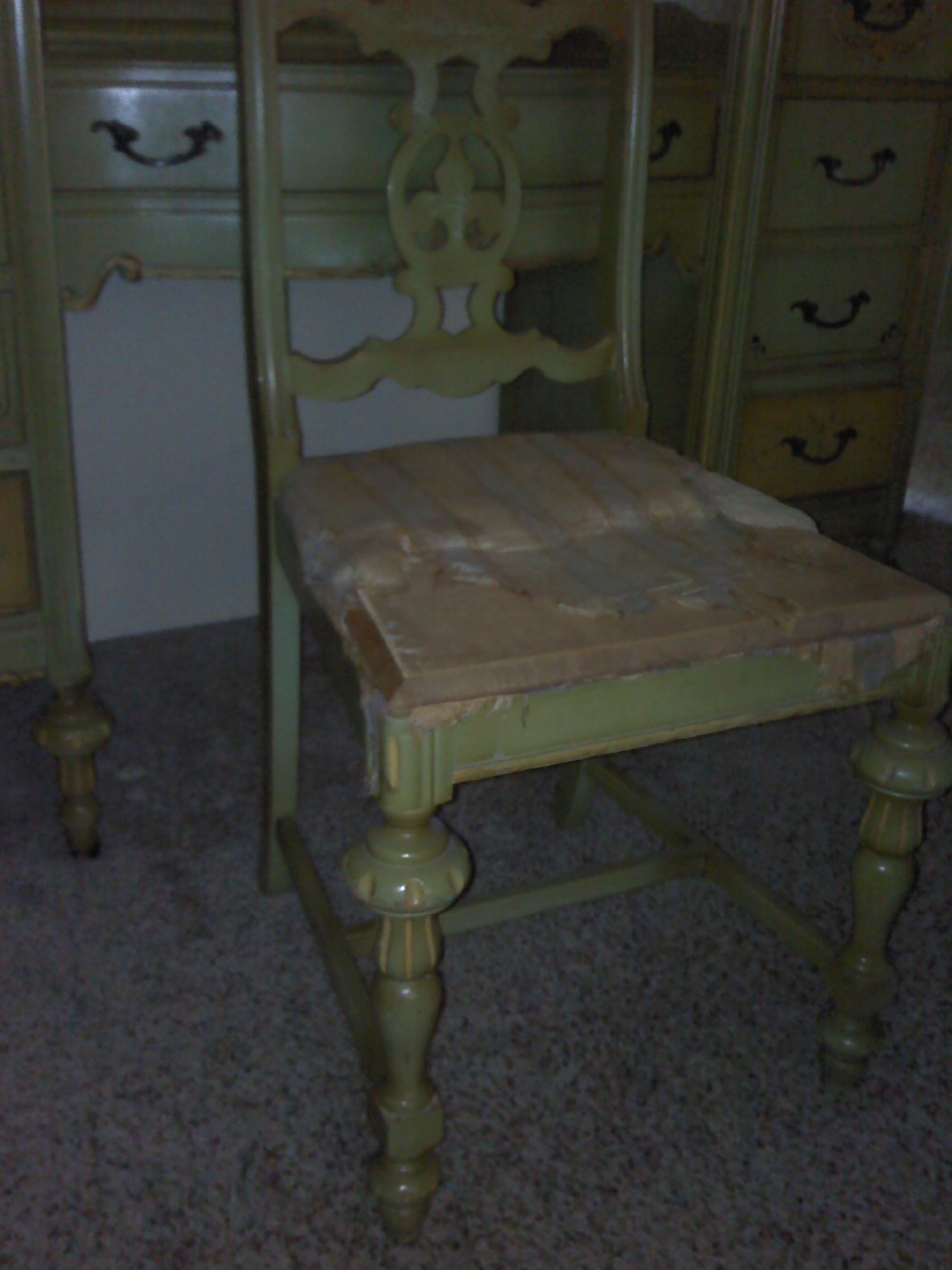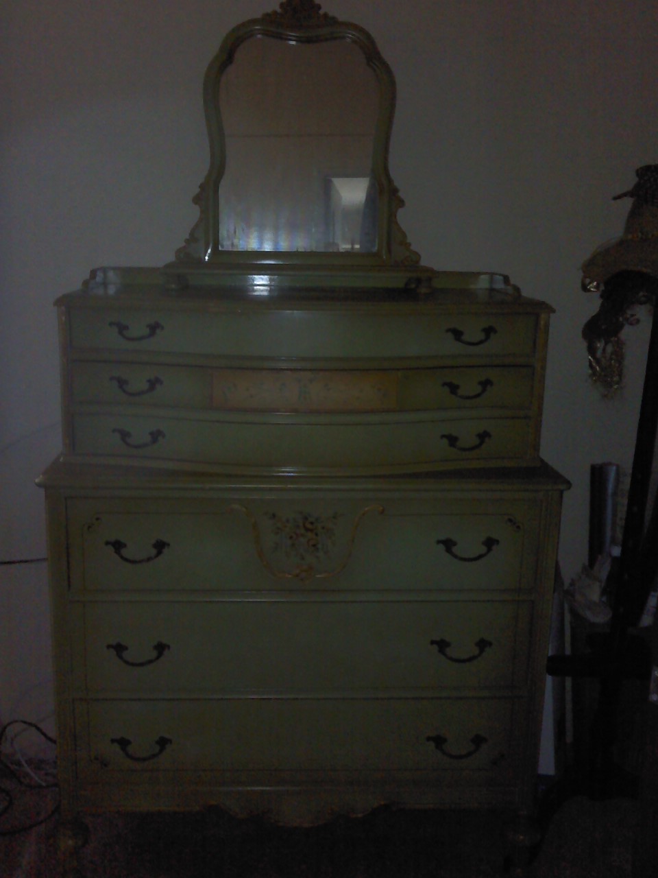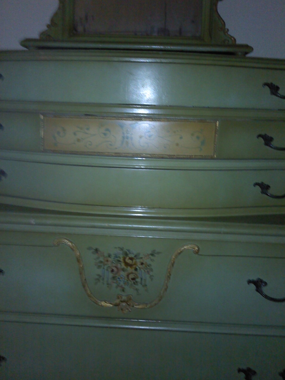 This is a French Hand Painted Bedrood Set from the 1920s. Most of the pieces are on excellent condition with exception of chair that needs to have the cushion restored. Originally this was an eight piece set. A bed, two nightstands, A Chair, Two Dressers( A Vanity Dresser and a Tall dresser), A Stool seat Chaise, And a mirror. One of the nightstands is mising.