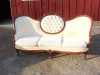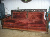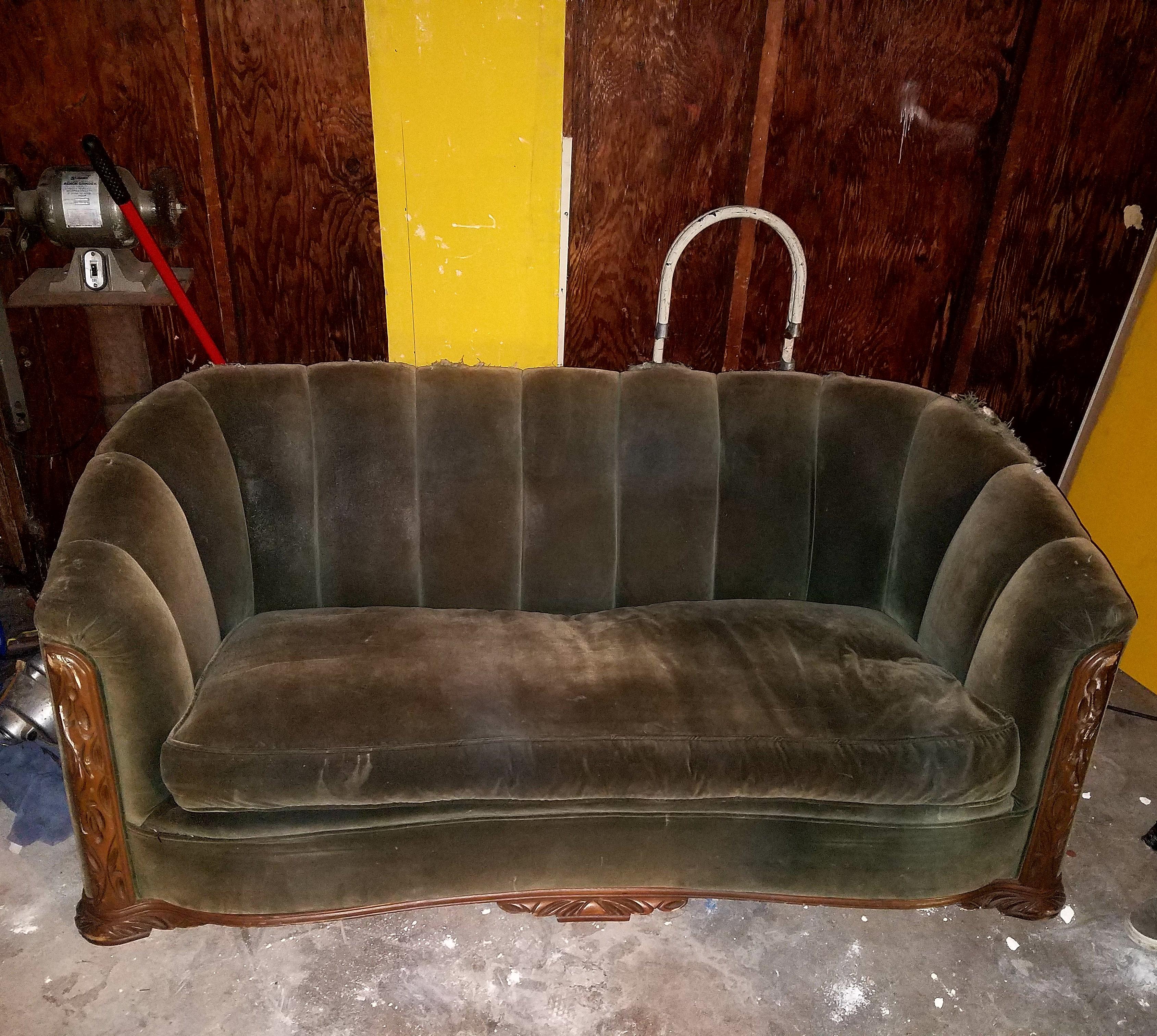 Not sure if this is mohair or velvet, feels velvety. Dark olive green with hand carved arms/frame , possibly walnut and has one long cushion. Sofa is 70in long and 38in deep. A couple cat scratches on the top. Just want to know the original value and the value now with the cat scratches. Original upholstery