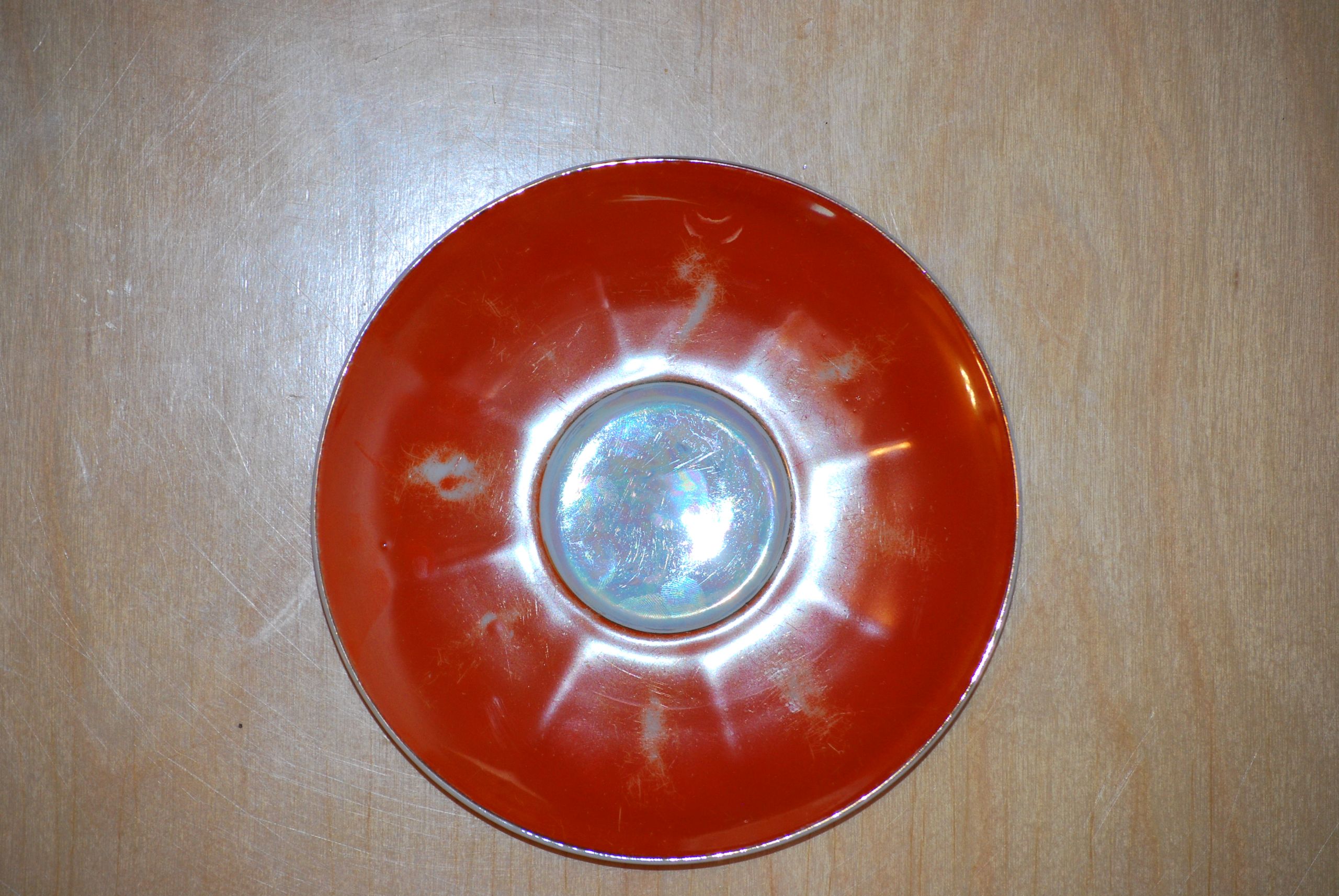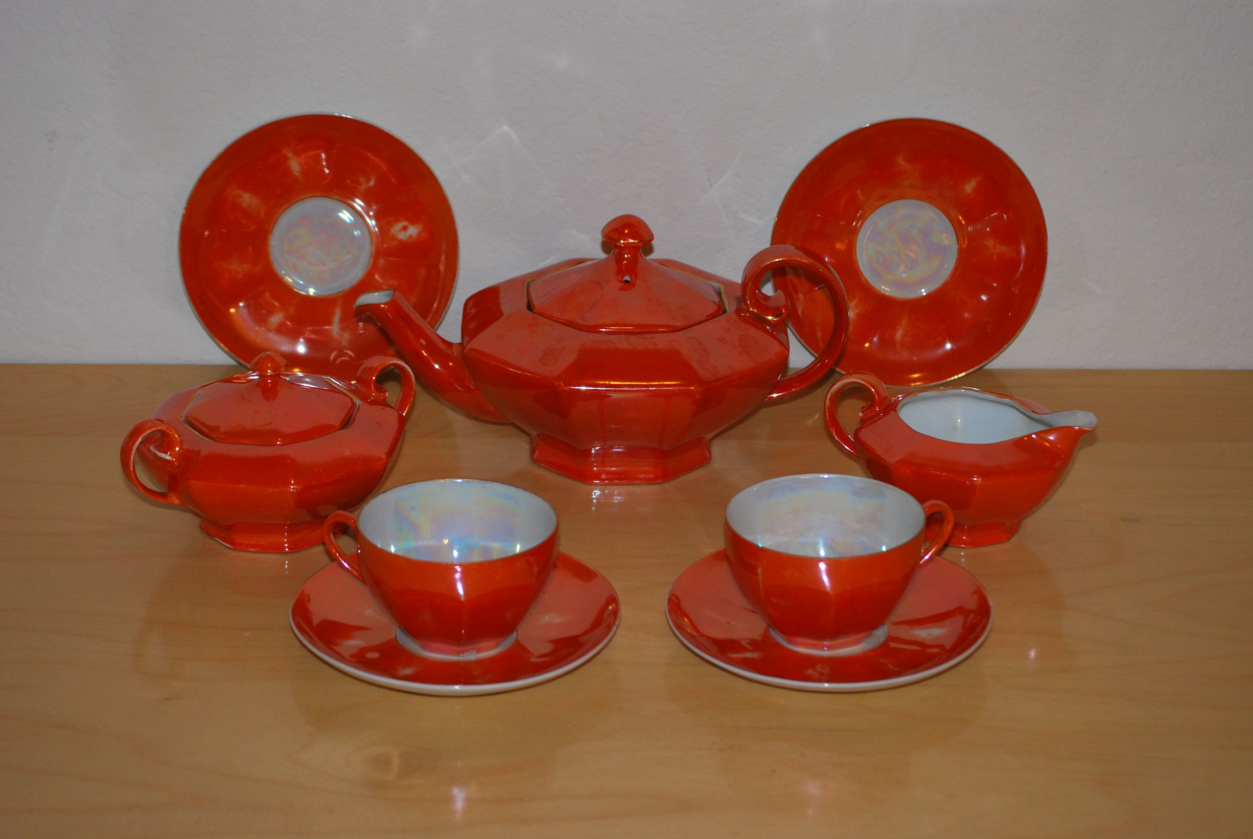 Description- Orange tea set with nine pieces. Tea pot with lid, sugar bowl with lid, creamer, 2 cups, and 4 saucers. The orange has an iridescence to it as well as the white areas such as inside the cups, and on the saucers. The tea pot, sugar bowl and creamer have an interesting octagonal shape.