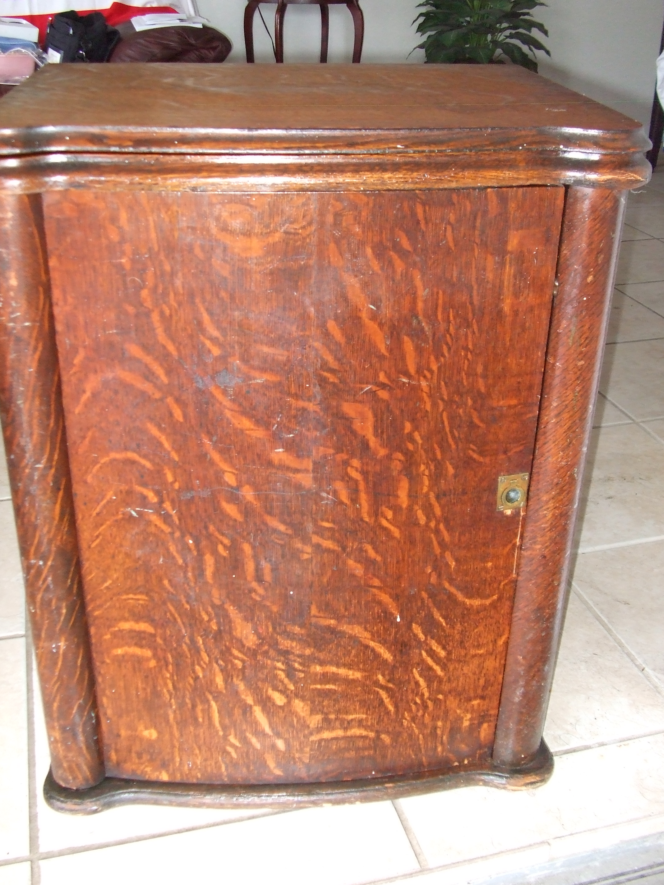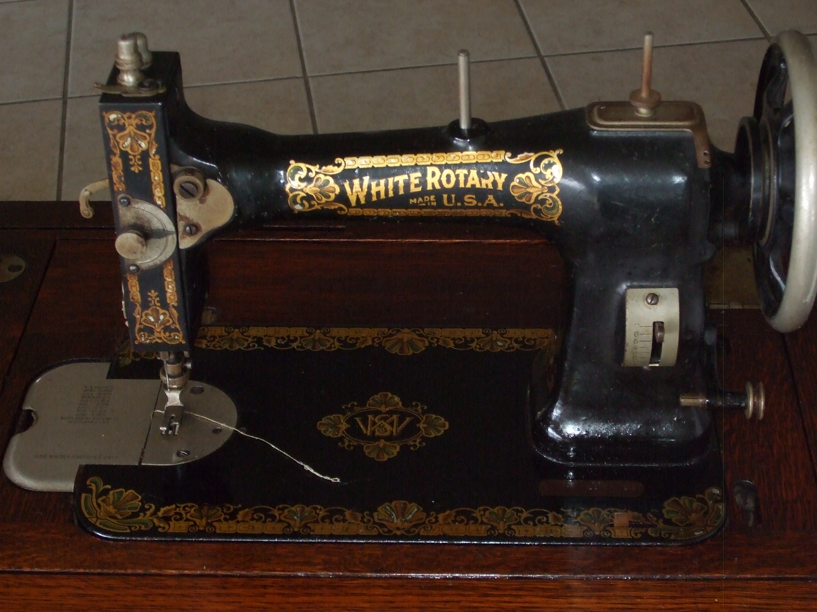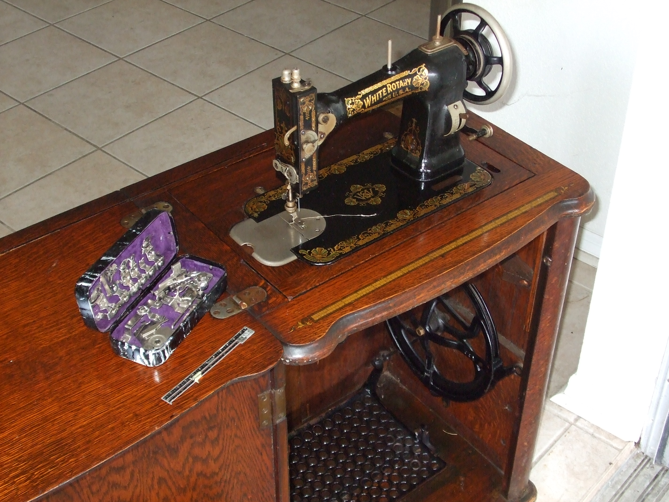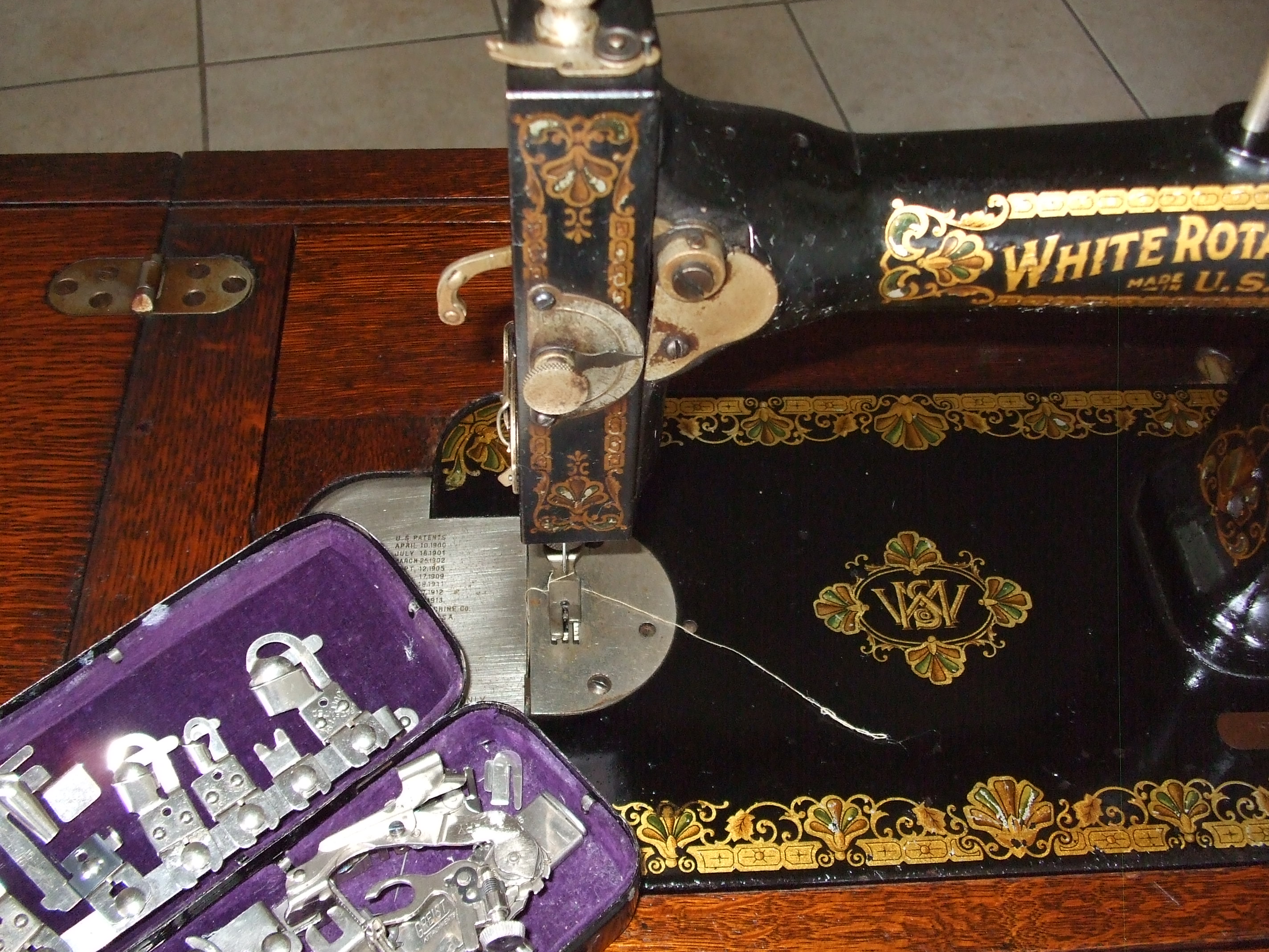 1920s era White Rotary sewing machine with all attachements in original tin box. In working order, but the leather best has broken. Unique cabinet, fully enclosed with back and floor, flip top uses cable system to raise the machine into place works beautifully with all original hardware including the cable. Cabinet could use a good sanding and polishing, but is completely in tact with no major scratches or damage.