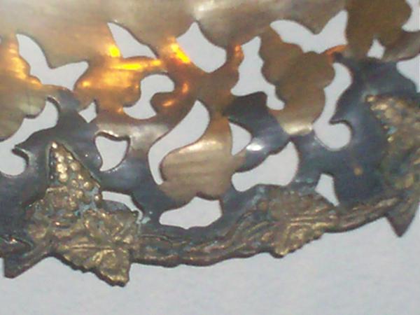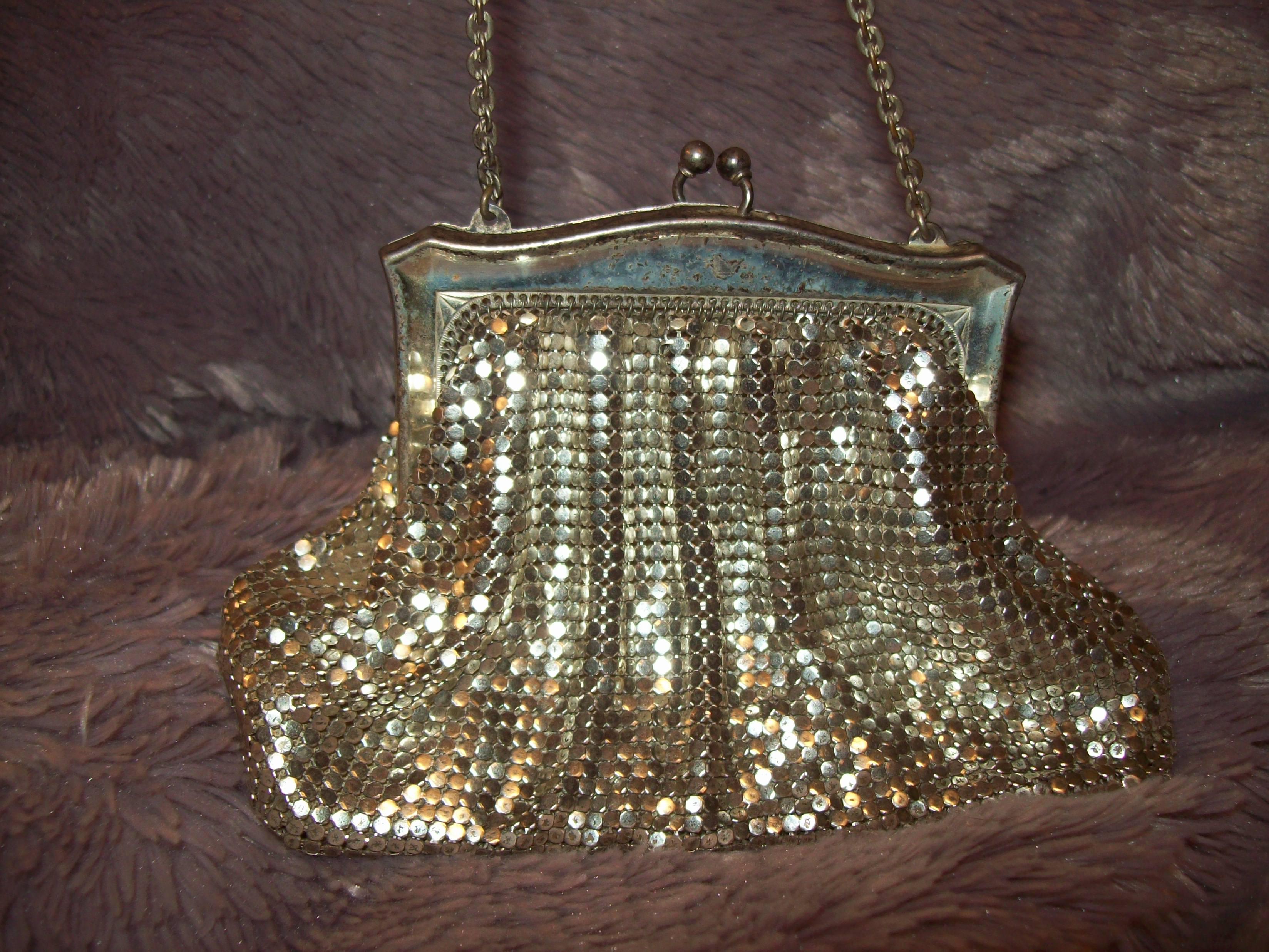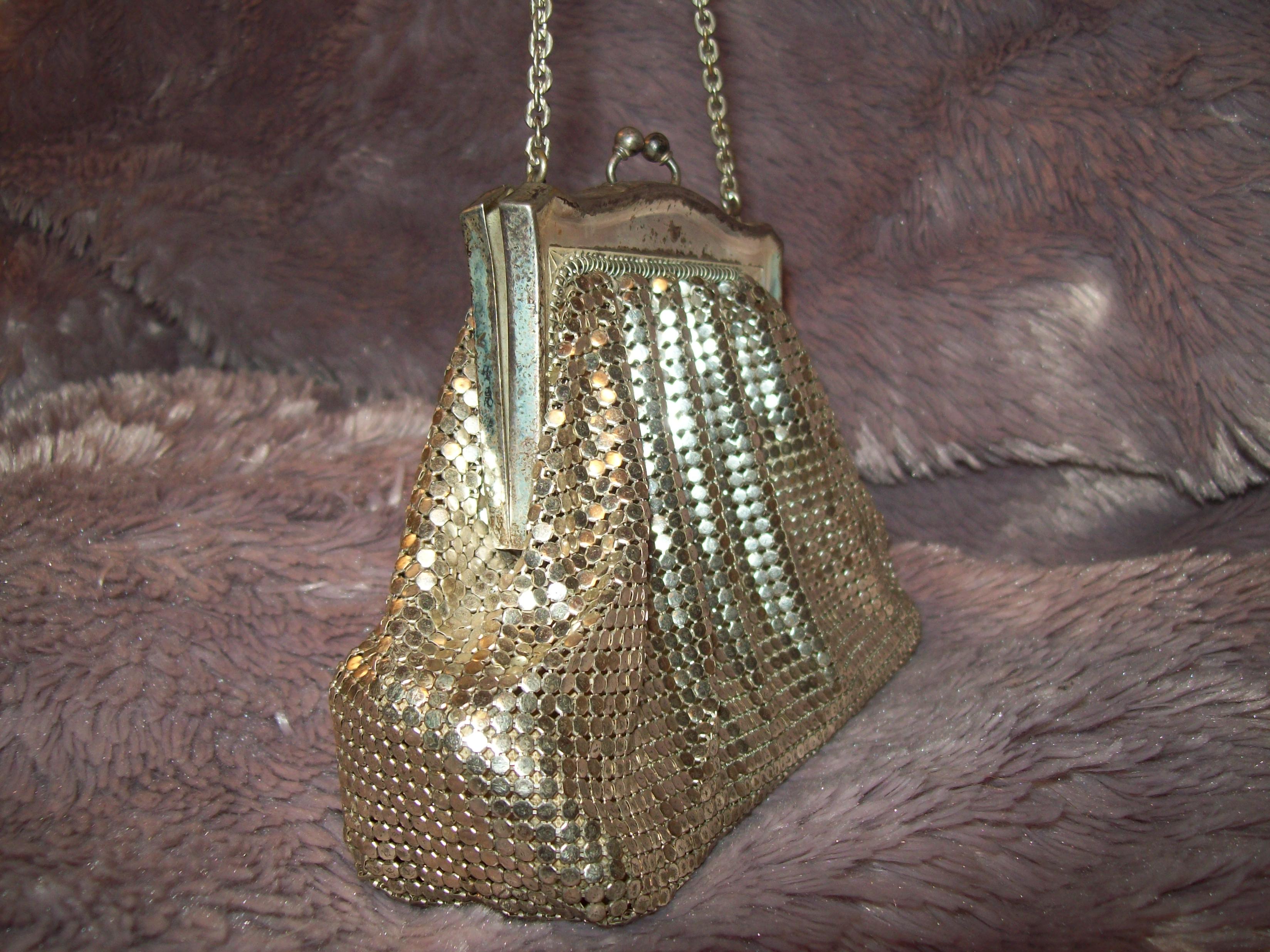 A Beautiful Purse made by Whiting and Davis Mesh Bag Co., and made in the USA, it is engraved on the inside frame. This Authentic 1920's purse is in fairly good condition, the kisslock closure doesn't close tightly and there are a few small wear marks on the mesh and a few rust spots on the outside frame, but overall it is in pretty good shape for its age. The bag is fairly small measuring 5 and 1/2 inches wide at the bottom and 5 inches tall with a 9 inch long chain handle.